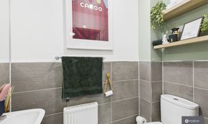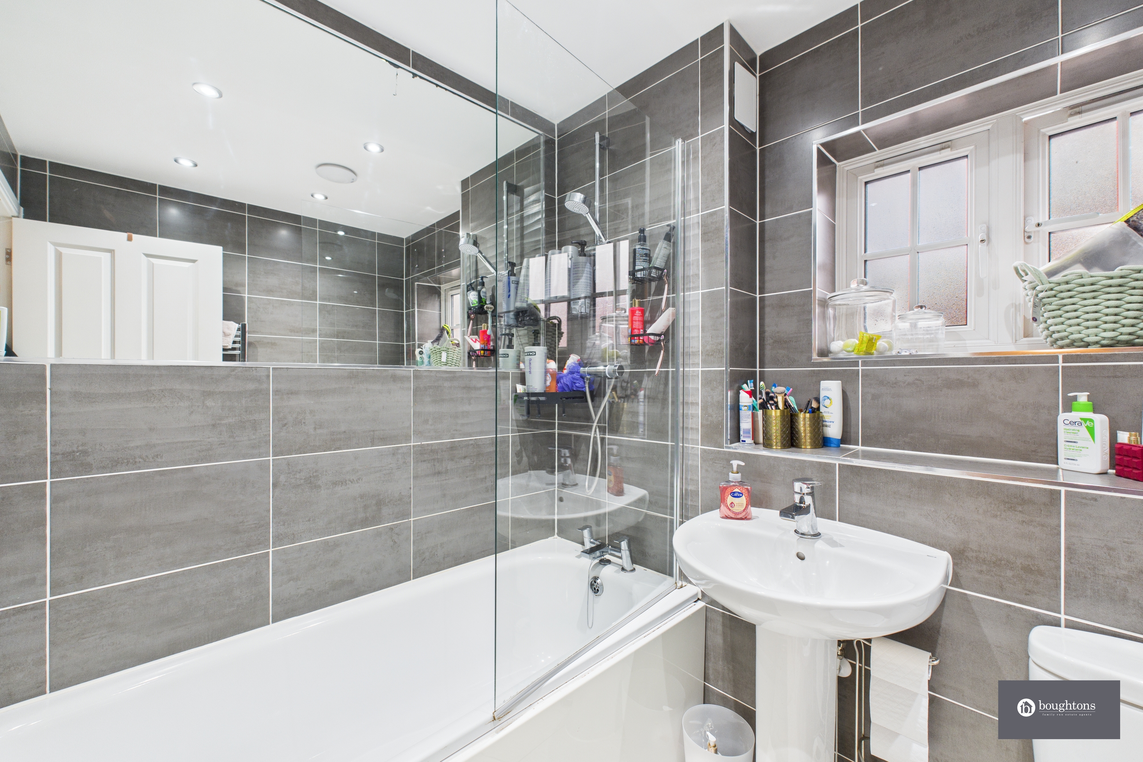 Upstairs, the first floor is home to three bedrooms and a modern family bathroom, fitted with grey tiling, a shower over the bath, W.C., sink, and a heated towel rail.