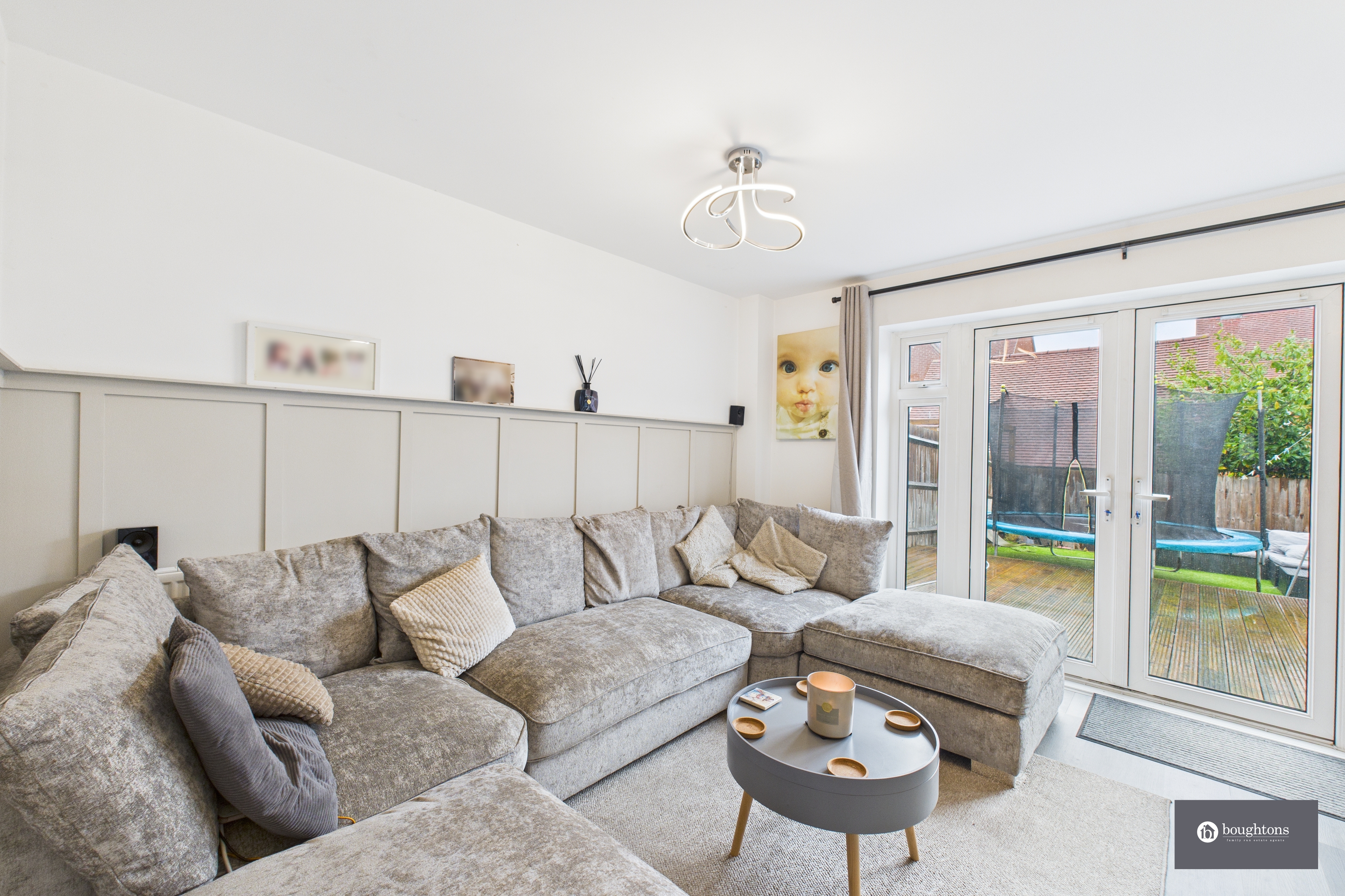 At the rear of the property, the inviting living room features a stylish panelled wall and French doors that open out to the private garden, creating a lovely flow between indoor and outdoor spaces.