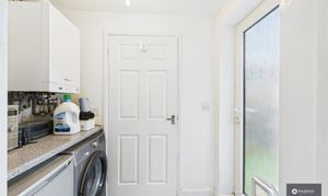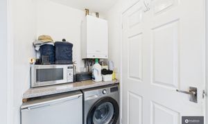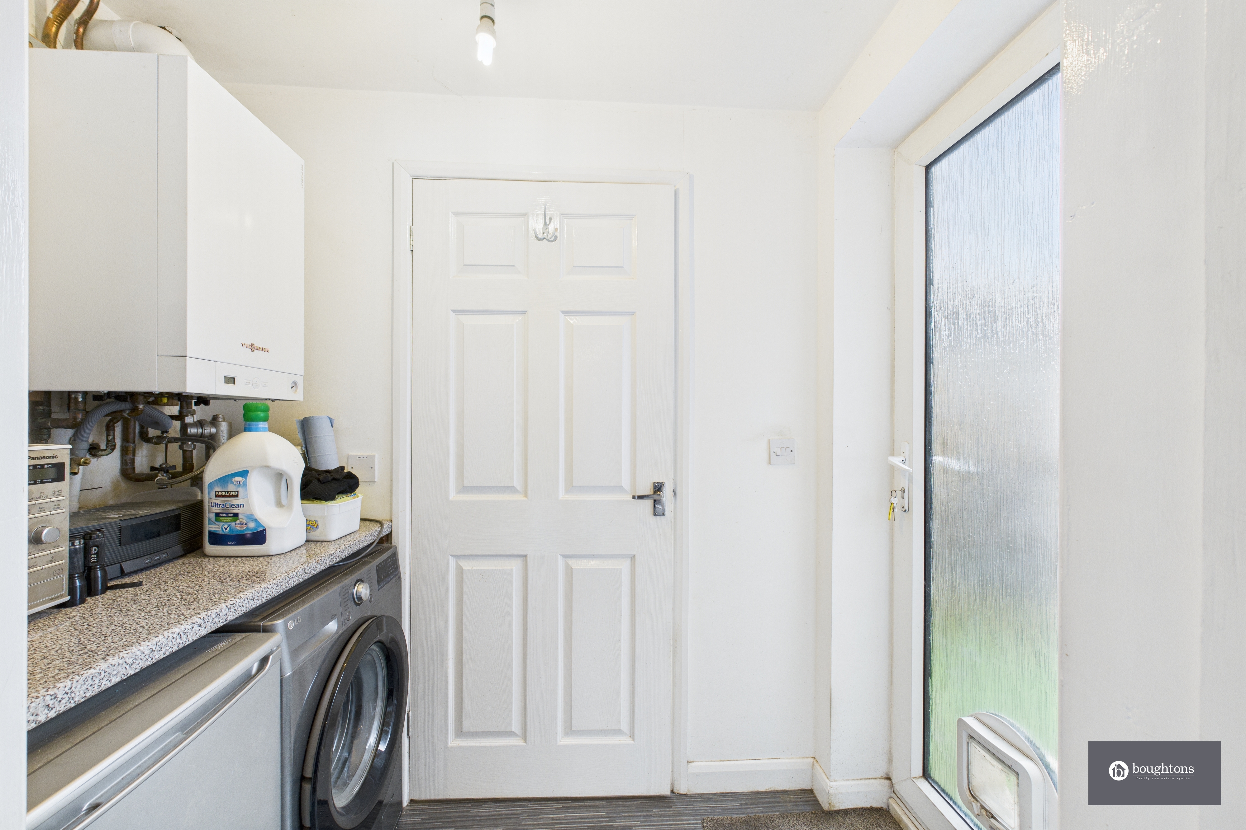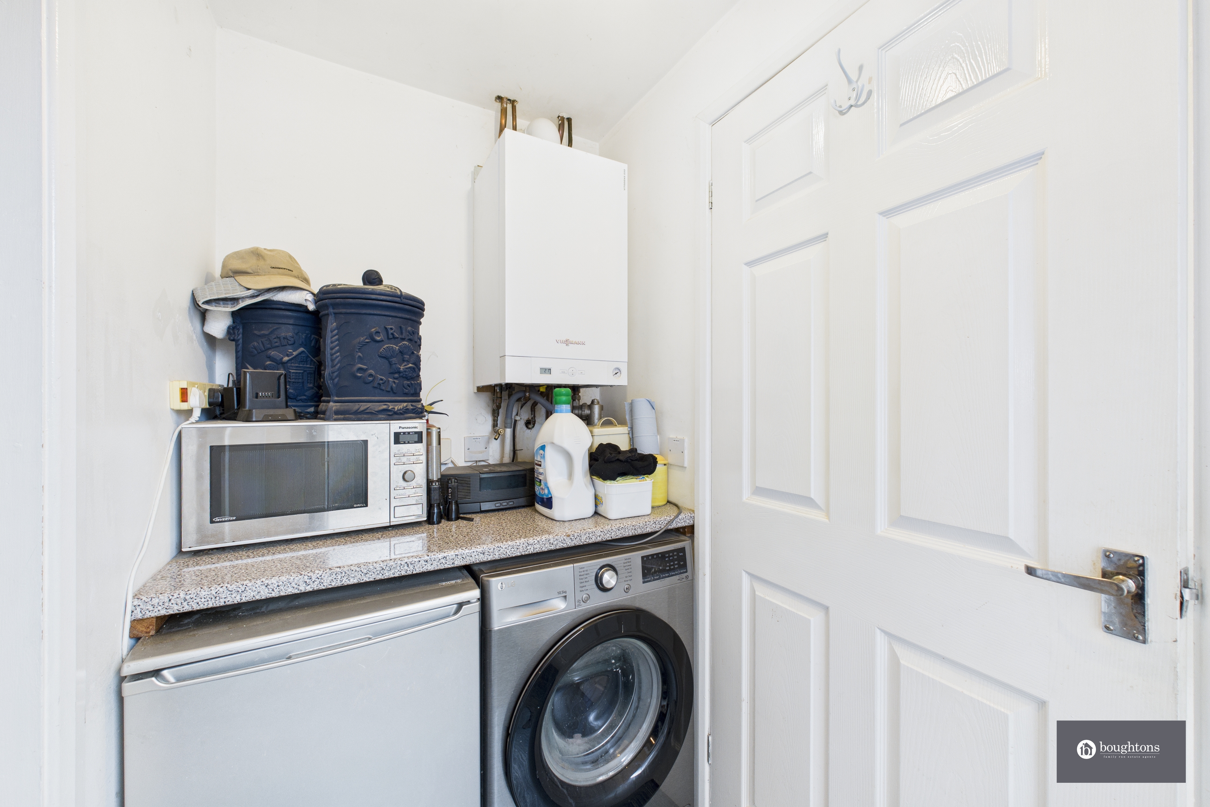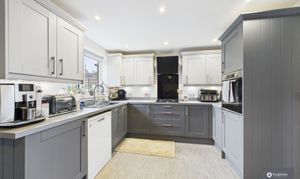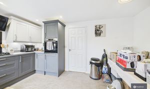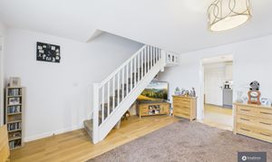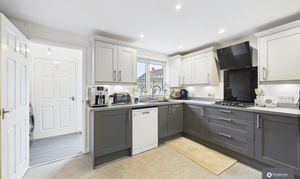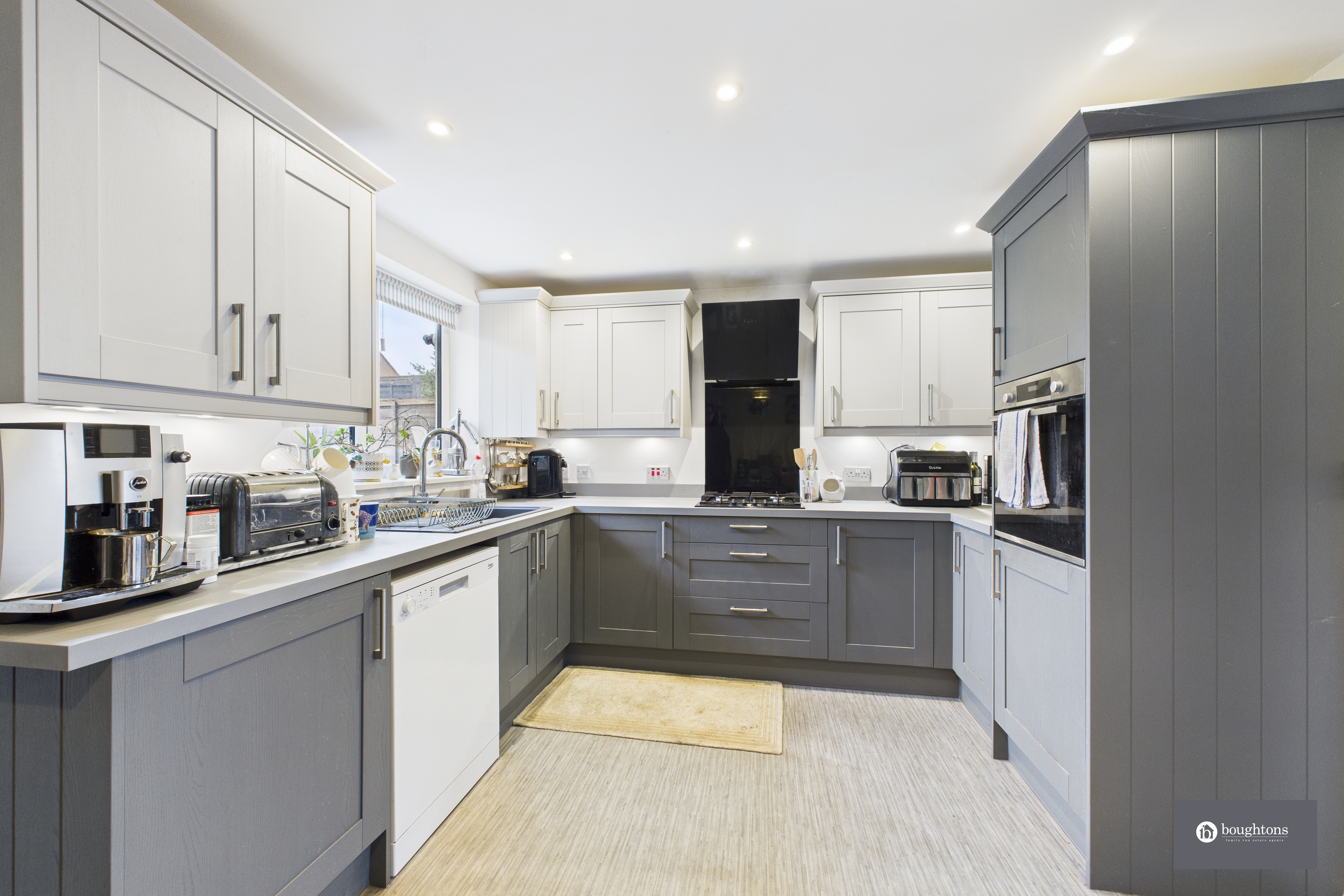 The ground floor includes a cosy living room and a kitchen diner fitted with grey cabinetry, spotlights, and integrated appliances including a raised oven and extractor fan. There’s also plenty of space for a dining table, making it a sociable area for everyday meals or gatherings. A convenient downstairs W.C. and separate utility room complete the ground floor layout.