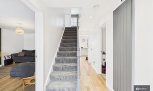 Upstairs, the first floor is home to four generous bedrooms, including a spacious master bedroom with a stylish en-suite shower room. The en-suite features sleek black fittings that complement the family bathroom, along with a sink, W.C., storage ledge, heated towel rail, and a marble-effect shower cubicle. The beautifully modernised family bathroom includes a shower over the bathtub, sink with built-in vanity storage, W.C., and black fittings throughout, giving the space a luxurious finish.