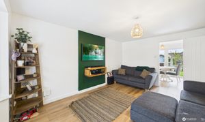 The property opens into a welcoming entrance hall with wooden flooring and a modern anthracite vertical radiator, setting a contemporary tone that flows throughout. The living room is both spacious and cosy, featuring a large bay window to the front aspect, a central media wall, and plenty of room for a range of furniture.