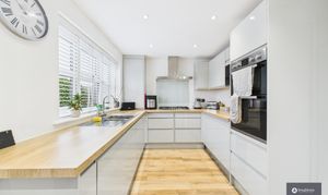 - Modern kitchen with high-gloss units, wooden worktops, and built-in appliances