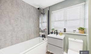 - Beautifully updated family bathroom with black fittings and vanity storage