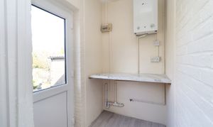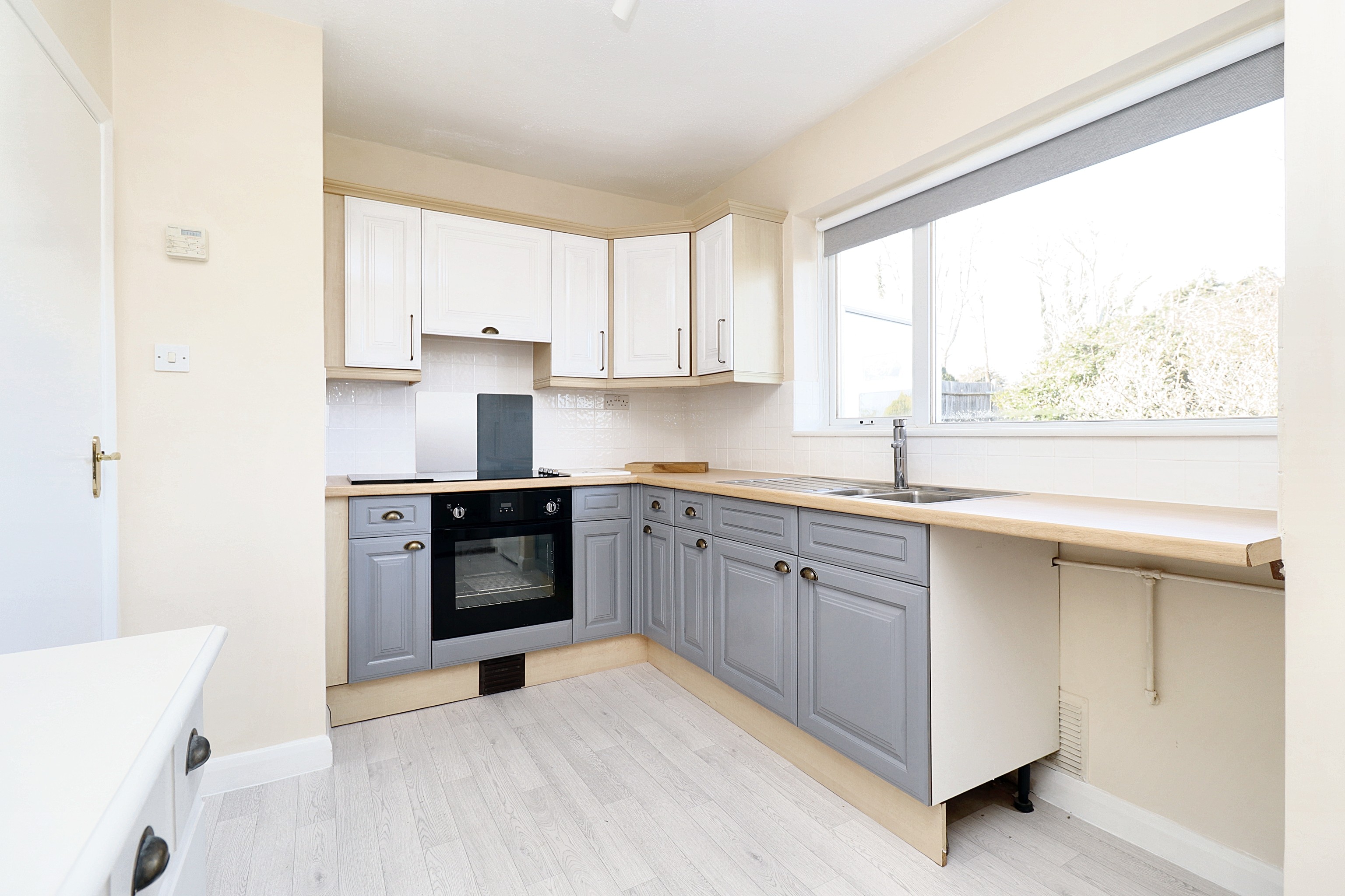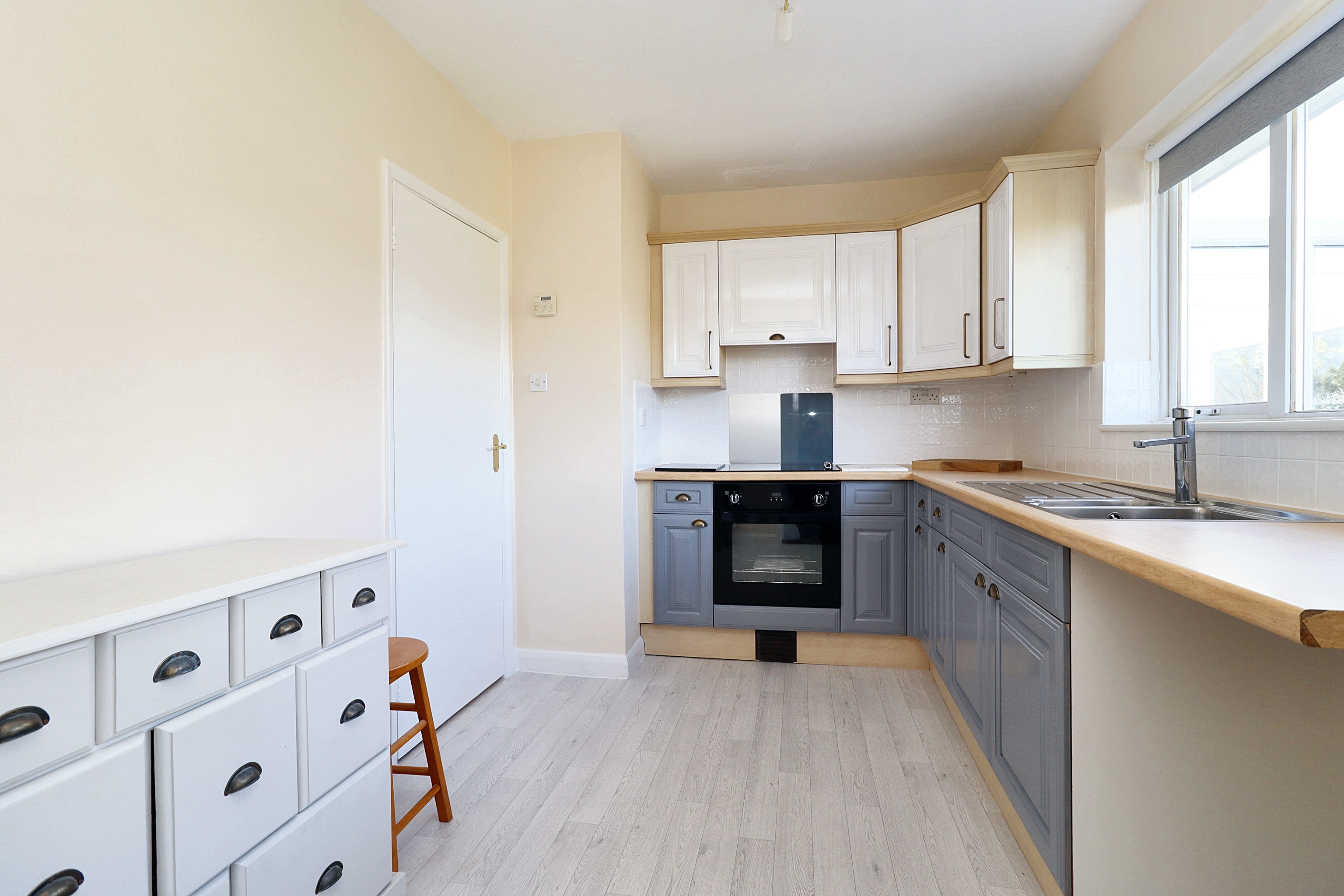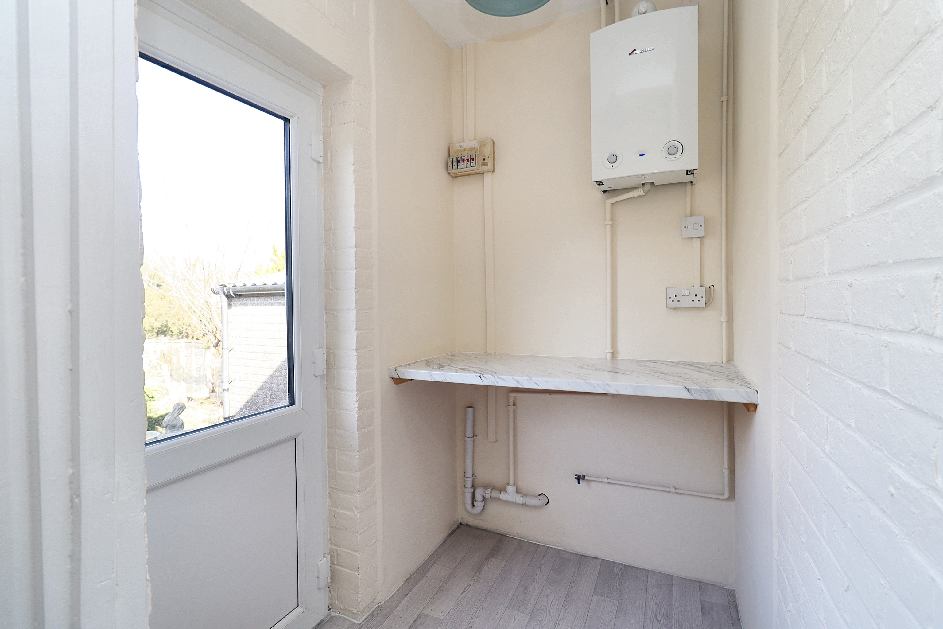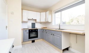 The modern kitchen is well-appointed with ample storage cabinets, a built-in electric oven and hob, and a stainless steel sink. A large window overlooks the rear garden, ensuring a bright cooking space, while room for a small dining table makes it a great spot for informal meals. A separate utility area provides space and plumbing for a washing machine and tumble dryer, with direct access to the rear garden.