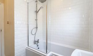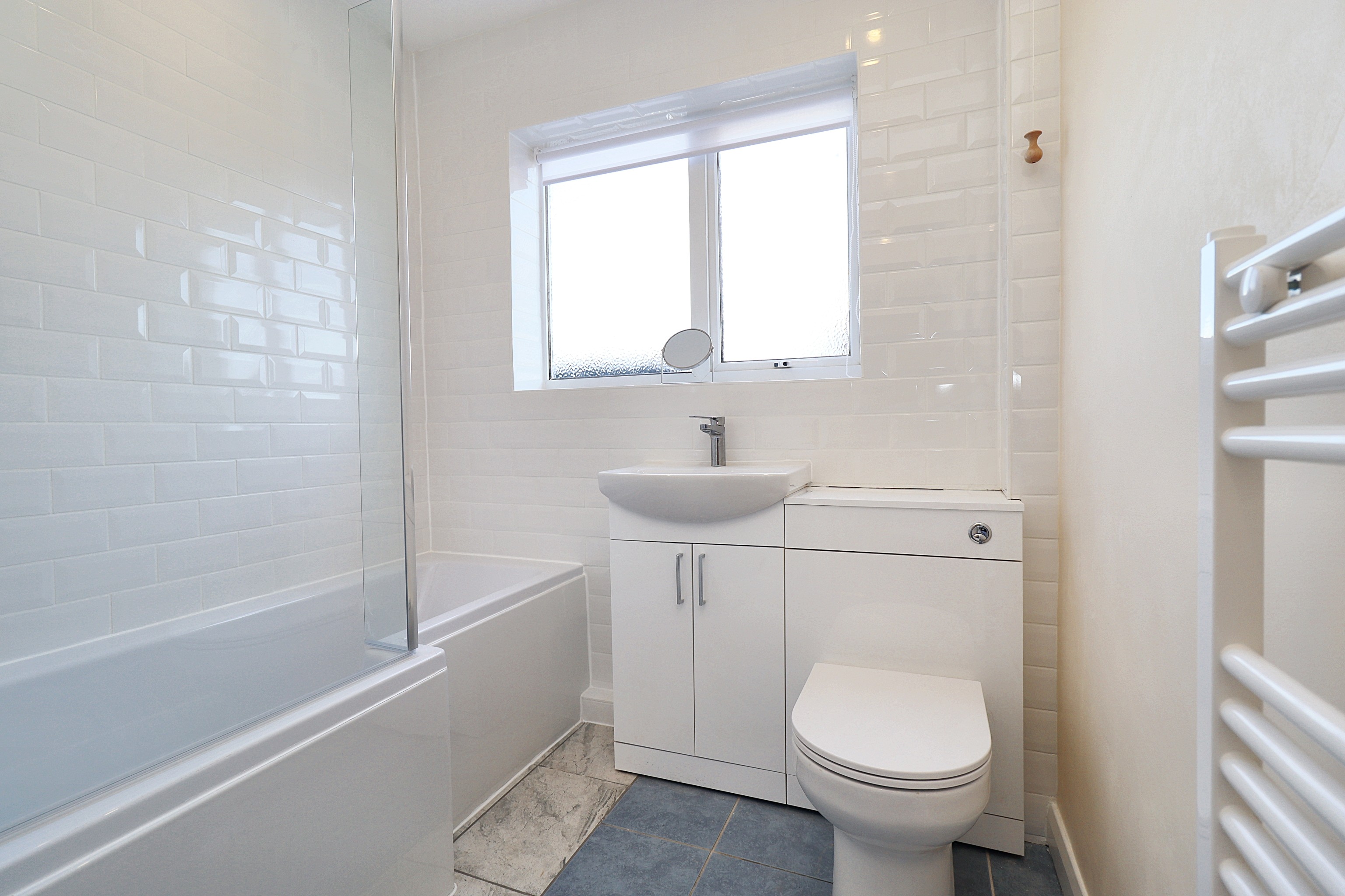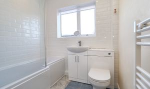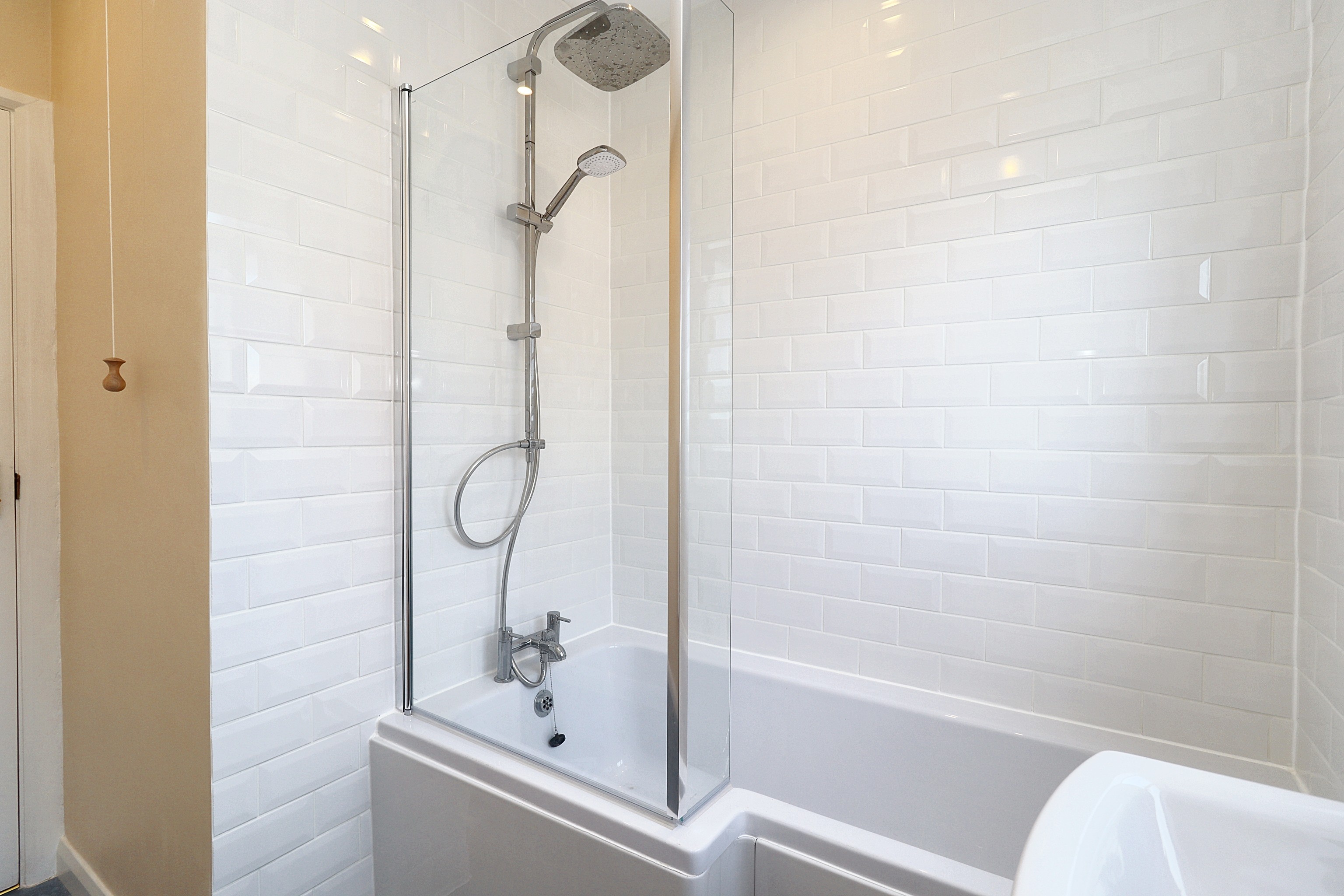 The modern bathroom has been updated with a contemporary white suite, including a shower over the bath, metro-style tiling, a washbasin, and a low-level WC.