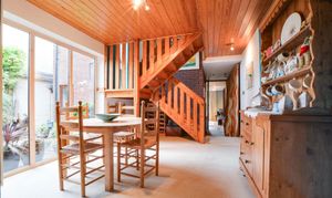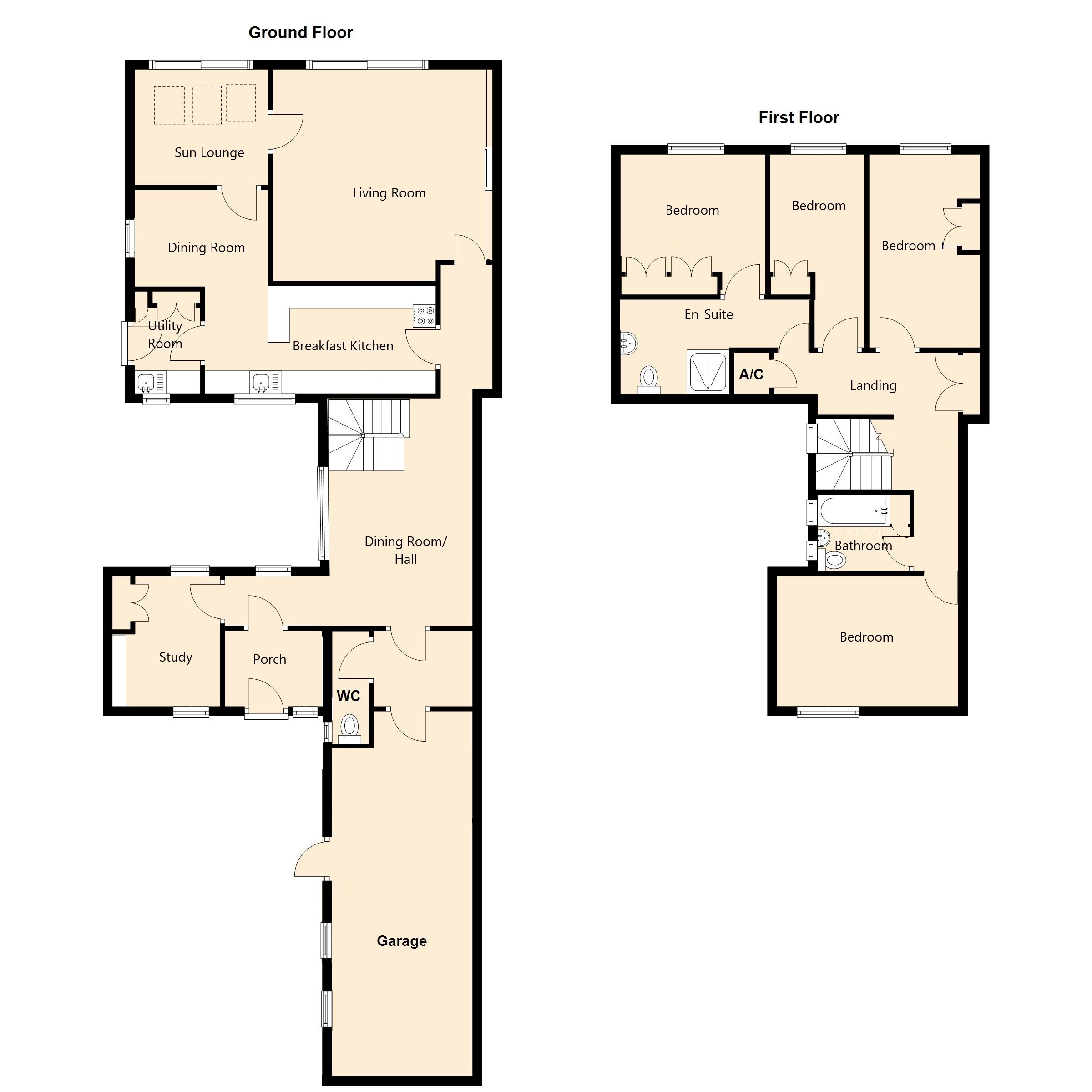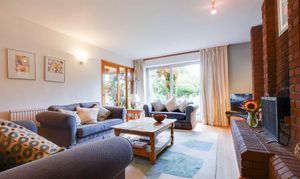 The ground floor includes an internal entrance porch leading into a welcoming dining room/hall overlooking the courtyard garden situated to the side of the property. This is currently used as an additional dining room. There is a spacious living room with an open fireplace, a ground floor WC, a study, a fitted breakfast kitchen with utility room, a separate dining room, and sun lounge overlooking the garden.