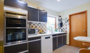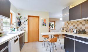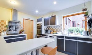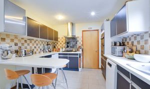 With double glazed window to the front elevation, vinyl tiled floor, a range of wall and base units with Askilan work surface over, breakfast bar, one and a half stainless steel sink with mixer tap with Abode water filter, inset five ring gas hob with integrated double oven, extractor hood, stainless steel splash back, plumbing for dishwasher, space for fridge, downlights, door leading to utility room.
