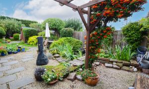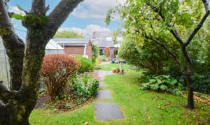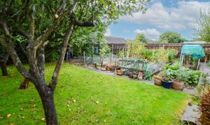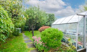 A good size L-shaped rear garden with paved patio seating area, lawn, mature established flowerbeds and shrubs, fruit trees, vegetable plot, water feature, shed, greenhouse.