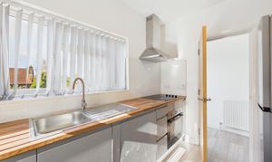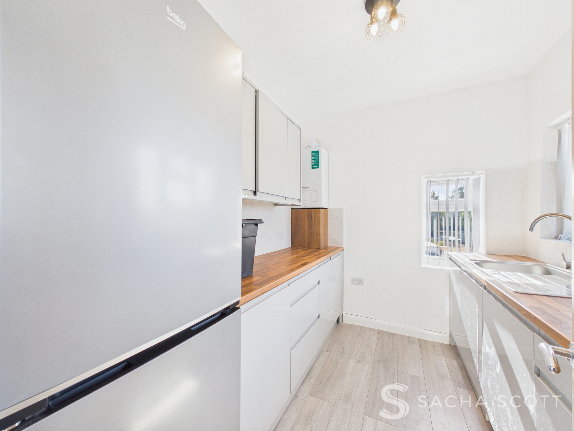 Less than a year old, this generous, modern kitchen offers plenty of work surface and storage space, all expected appliances* and dual aspect light from windows to the side and rear. The property does not come with a washing machine, plumbing and space is available for one in the bathroom.