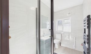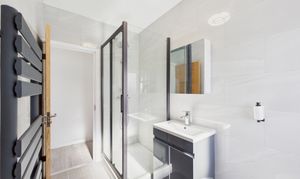 Modern and bright, this superb bathroom offers a large shower enclosure, vanity sink, heated towel rail, mirror and WC.