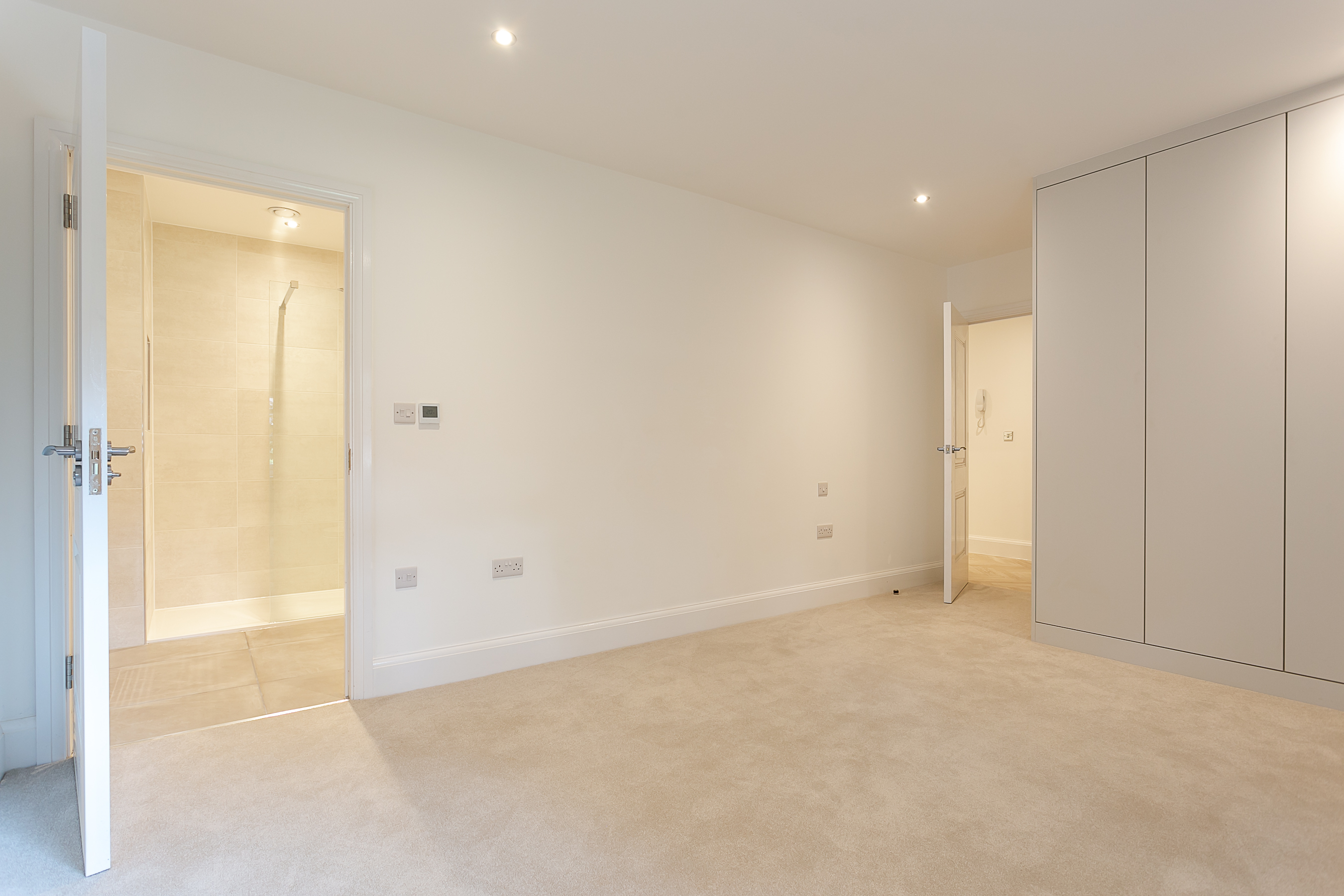 The principal bedroom with handmade fitted wardrobes providing ample storage also benefits from a modern en-suite shower room