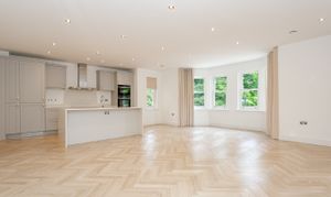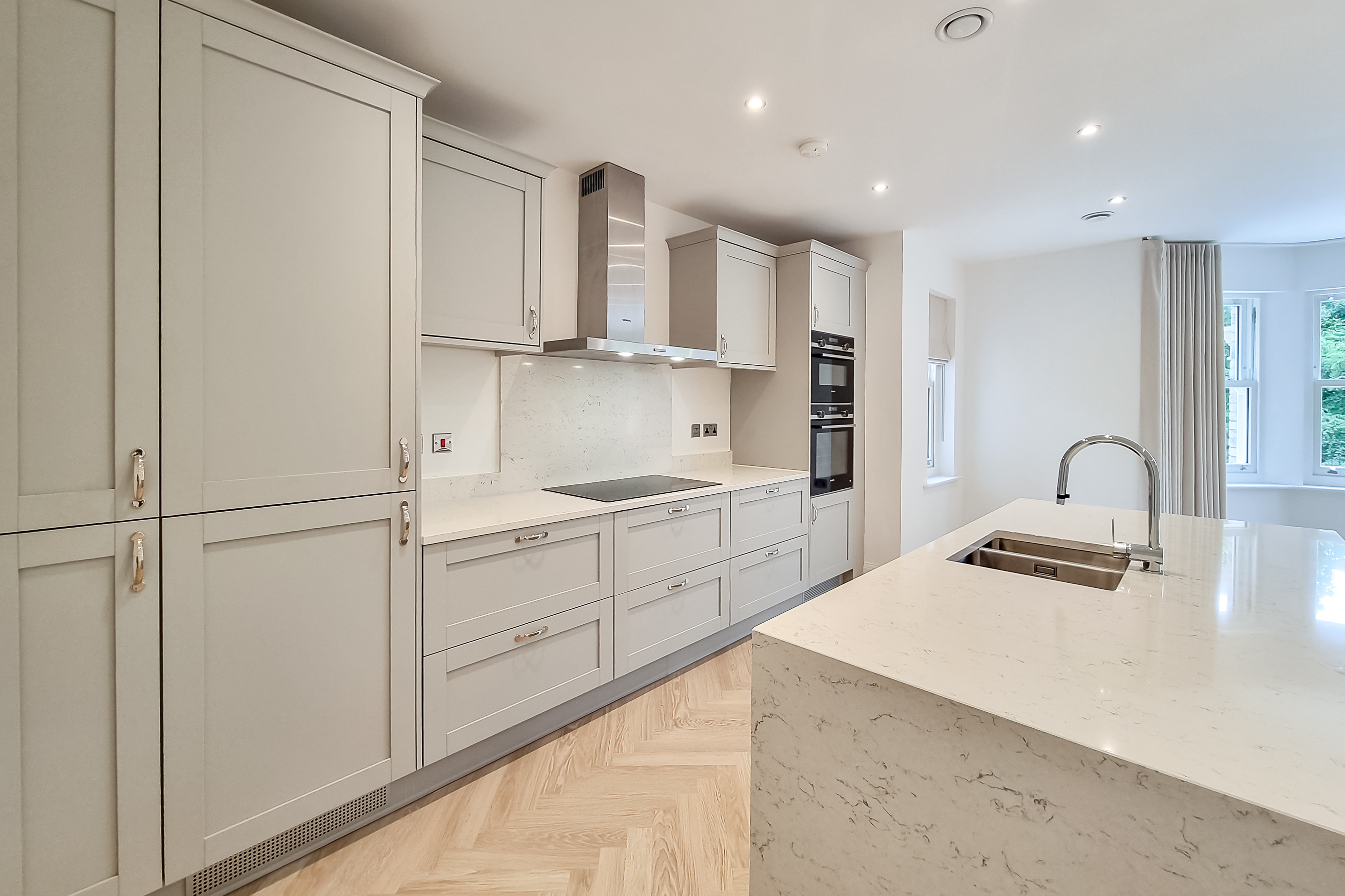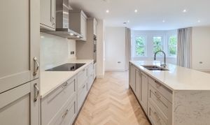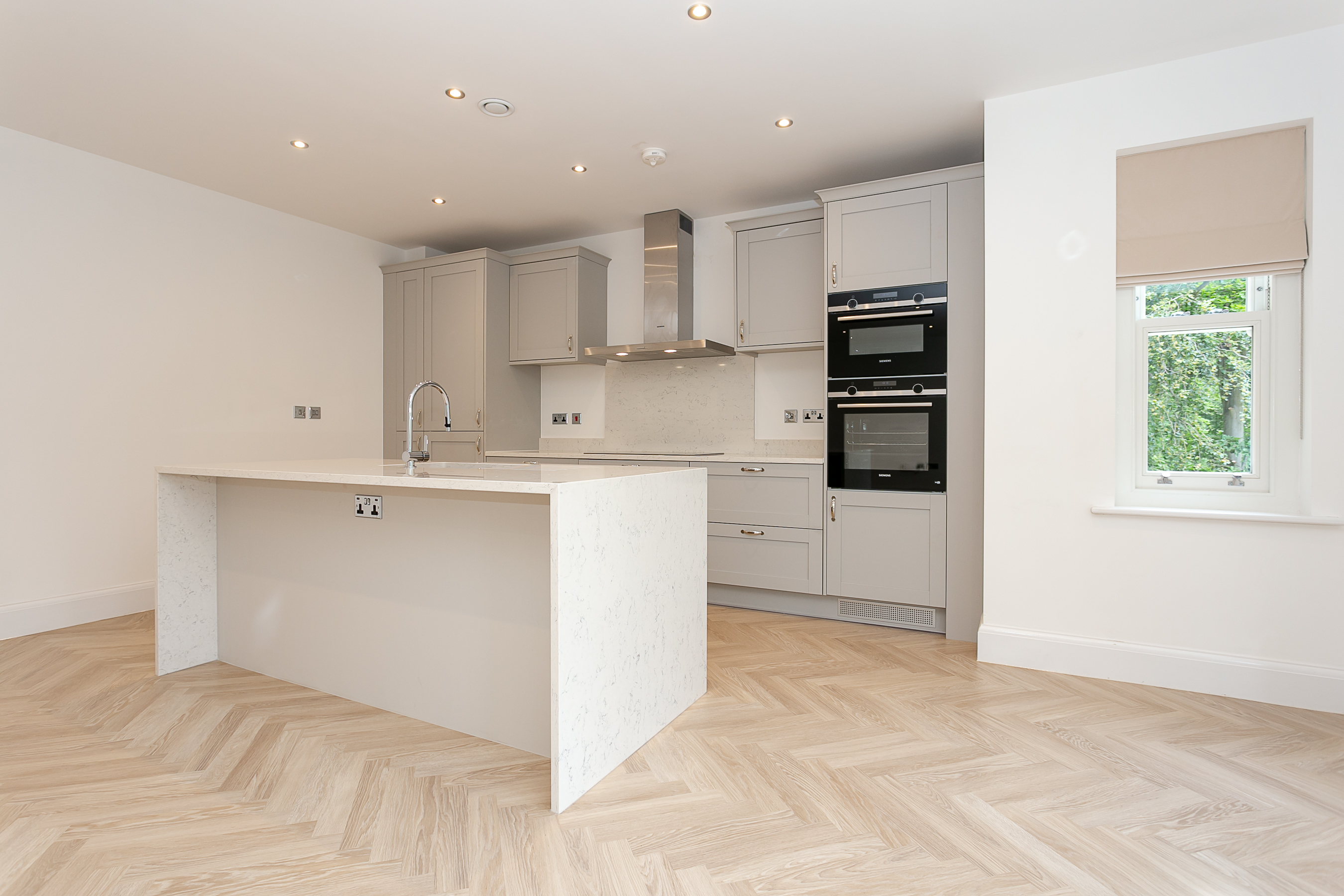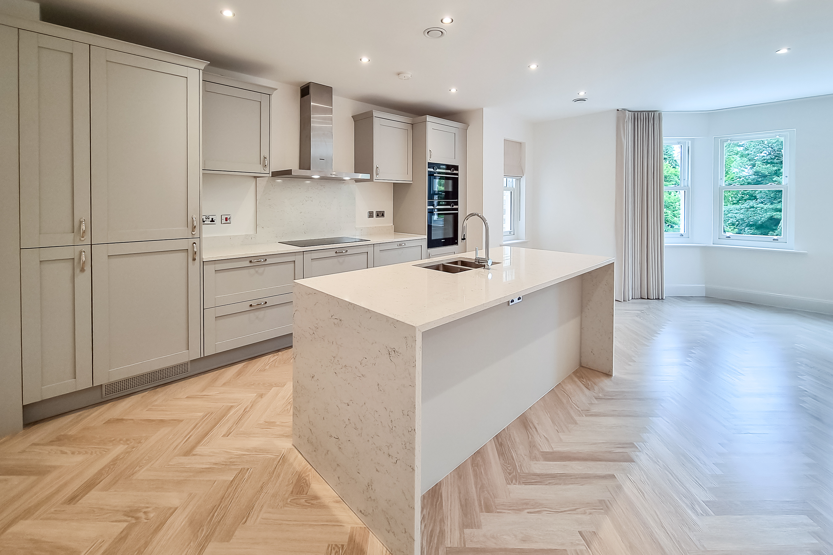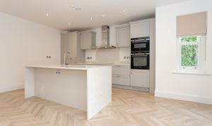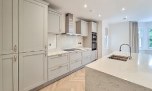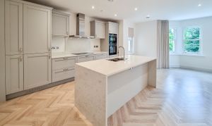 Through French doors you'll find the heart of the home - an impressive, open-plan kitchen / living room with stylish parquet style flooring and views over the oval. The kitchen is a handmade bespoke shaker style with fitted cupboards, Siemens oven, hob, integrated fridge / freezer, dishwasher and quartz worktops with splashback and a practical kitchen island with breakfast bar seating.