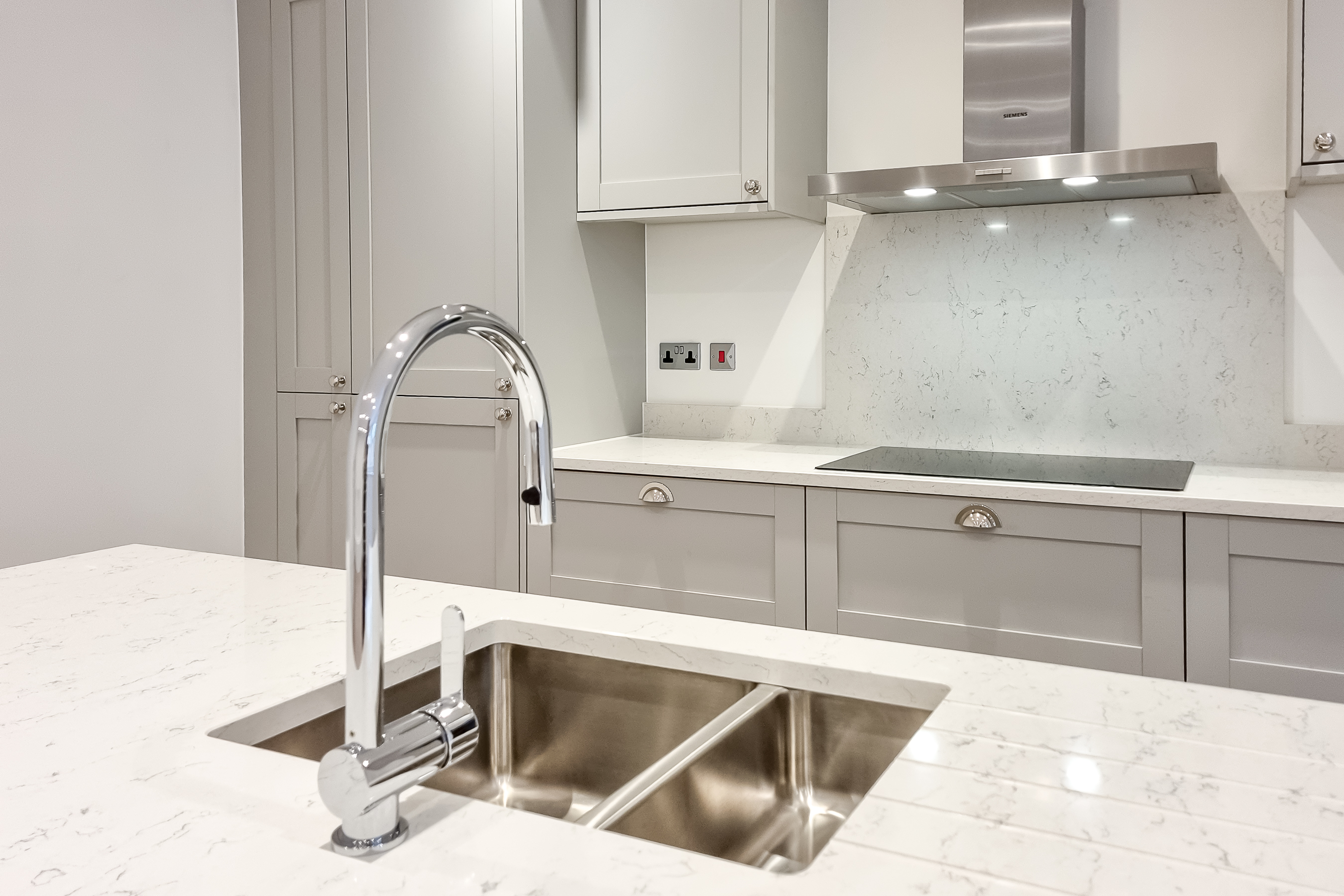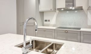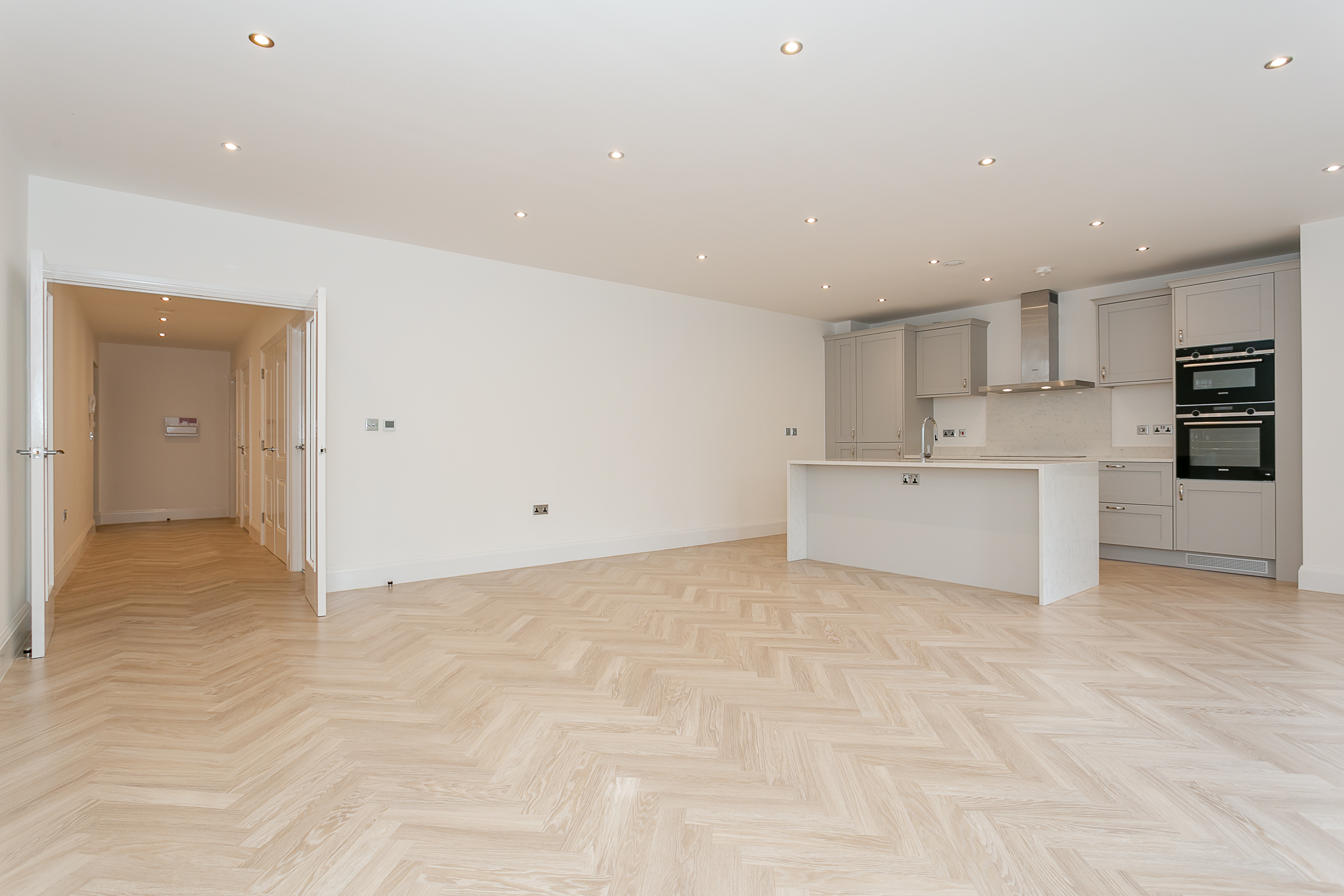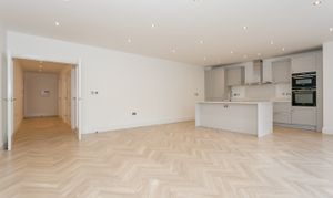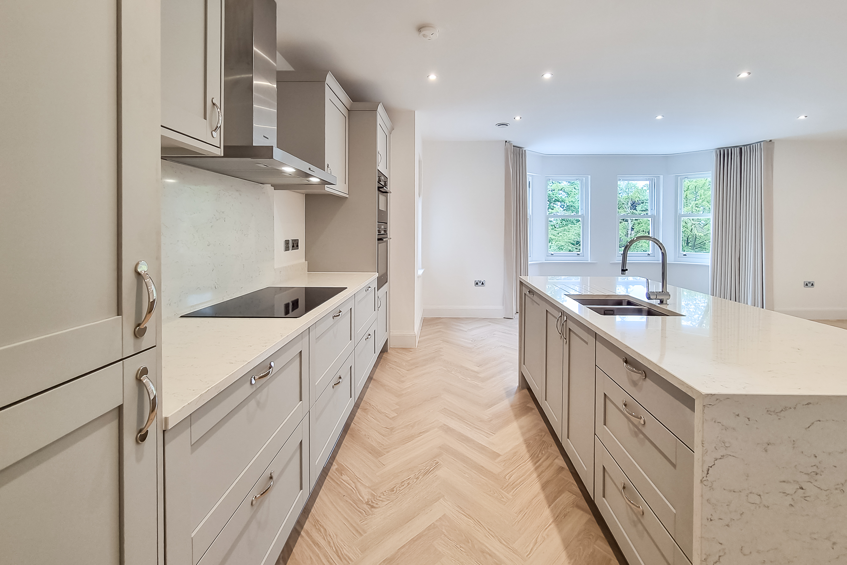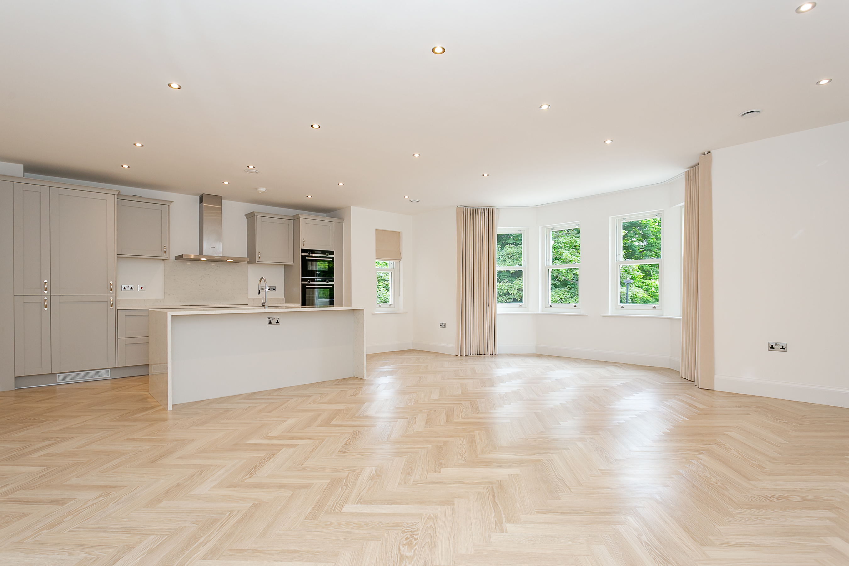 Through French doors you'll find the heart of the home - an impressive, open-plan kitchen / living room with stylish parquet style flooring and views over the oval. The kitchen is a handmade bespoke shaker style with fitted cupboards, Siemens oven, hob, integrated fridge / freezer, dishwasher and quartz worktops with splashback and a practical kitchen island with breakfast bar seating.