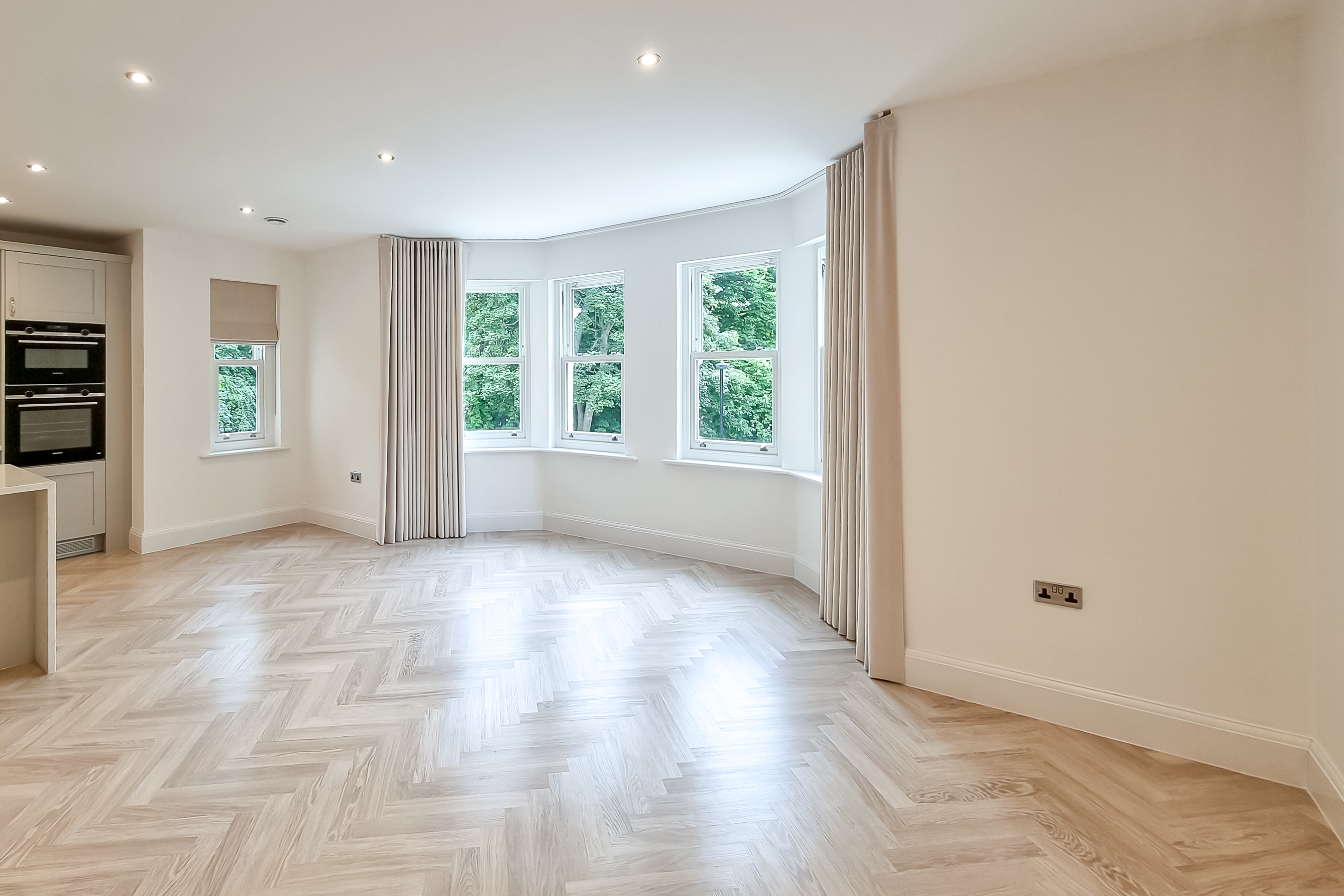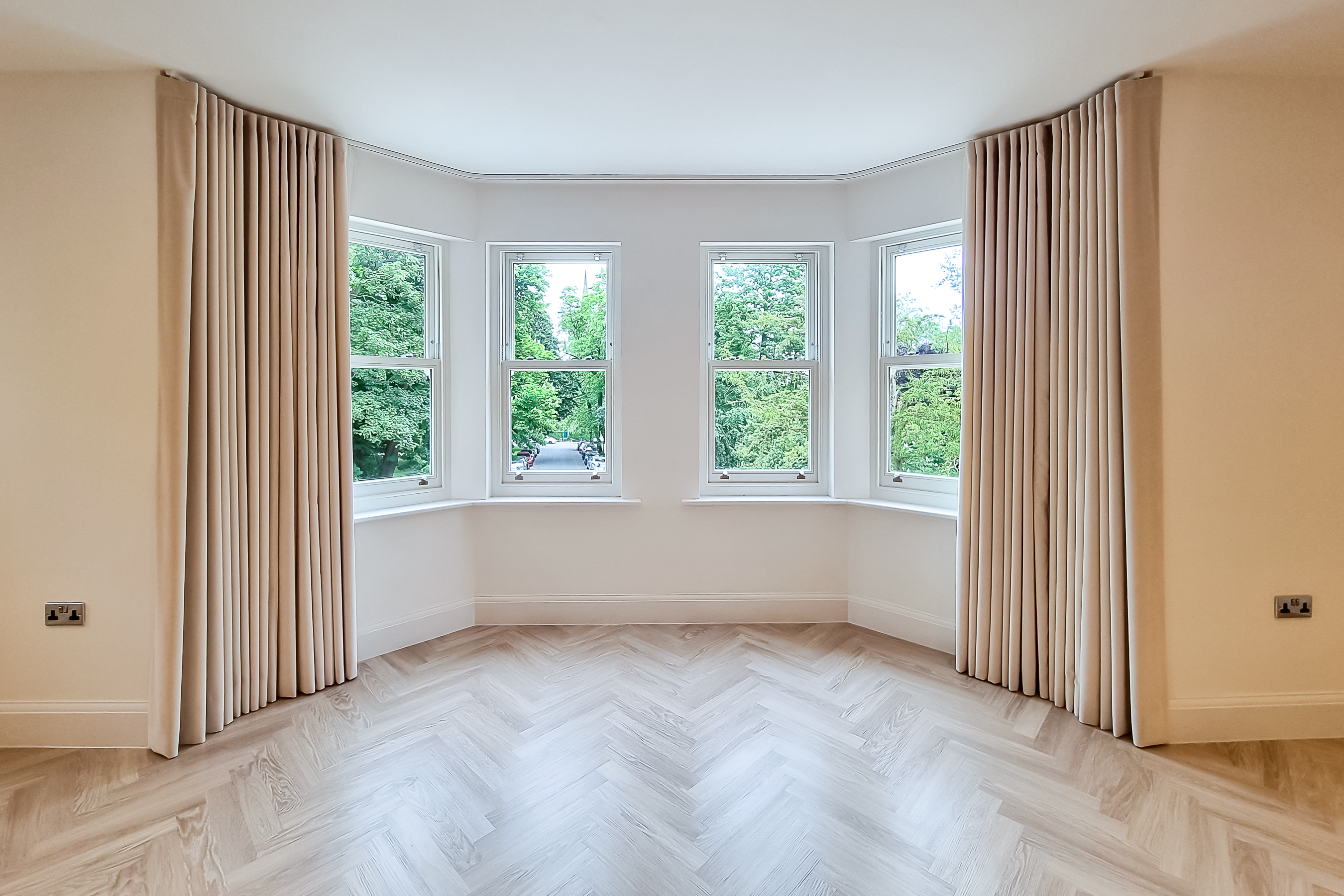Luxury handmade wave curtains to the bay window and roman blinds to kitchen and bedrooms are made with fabulous Linwood velvet.
