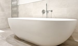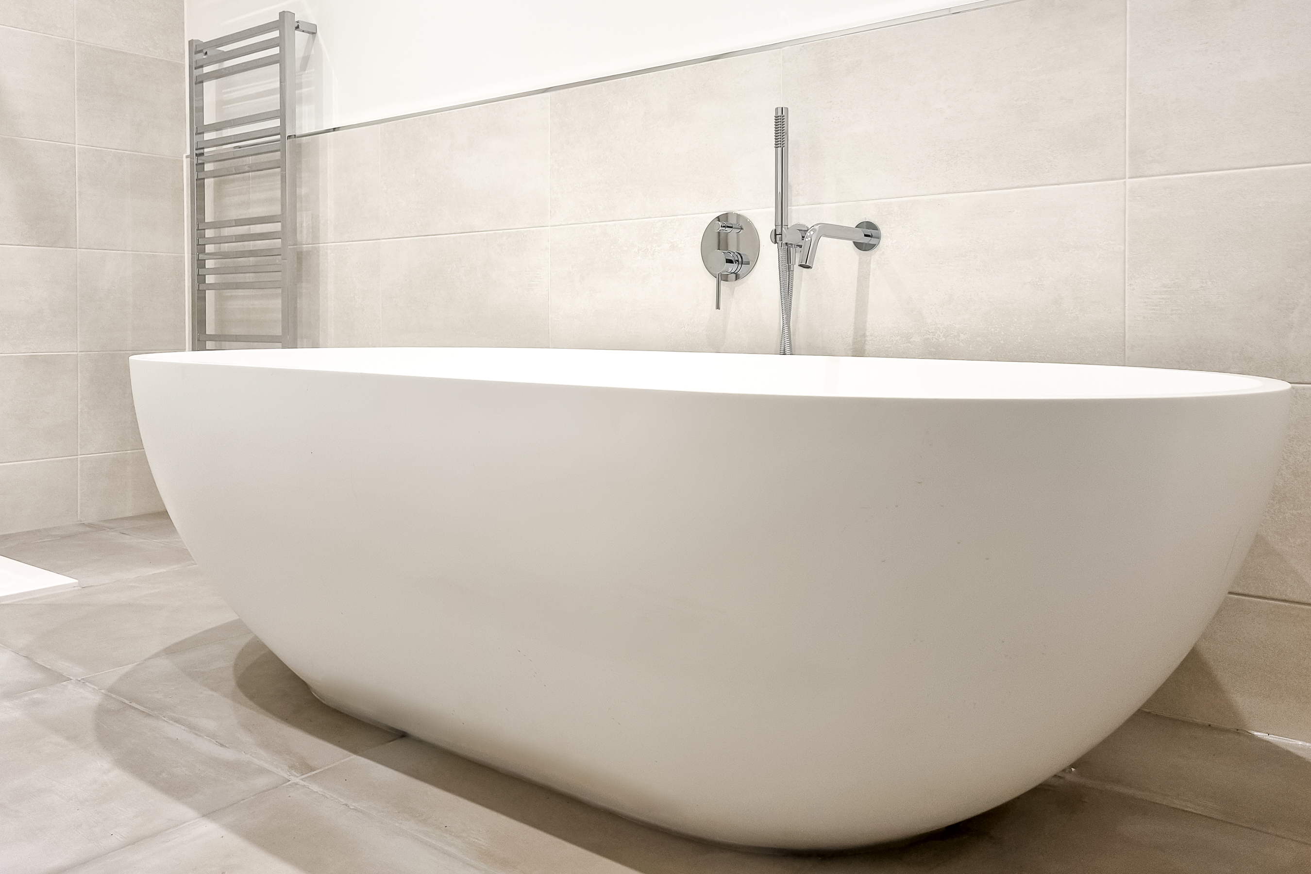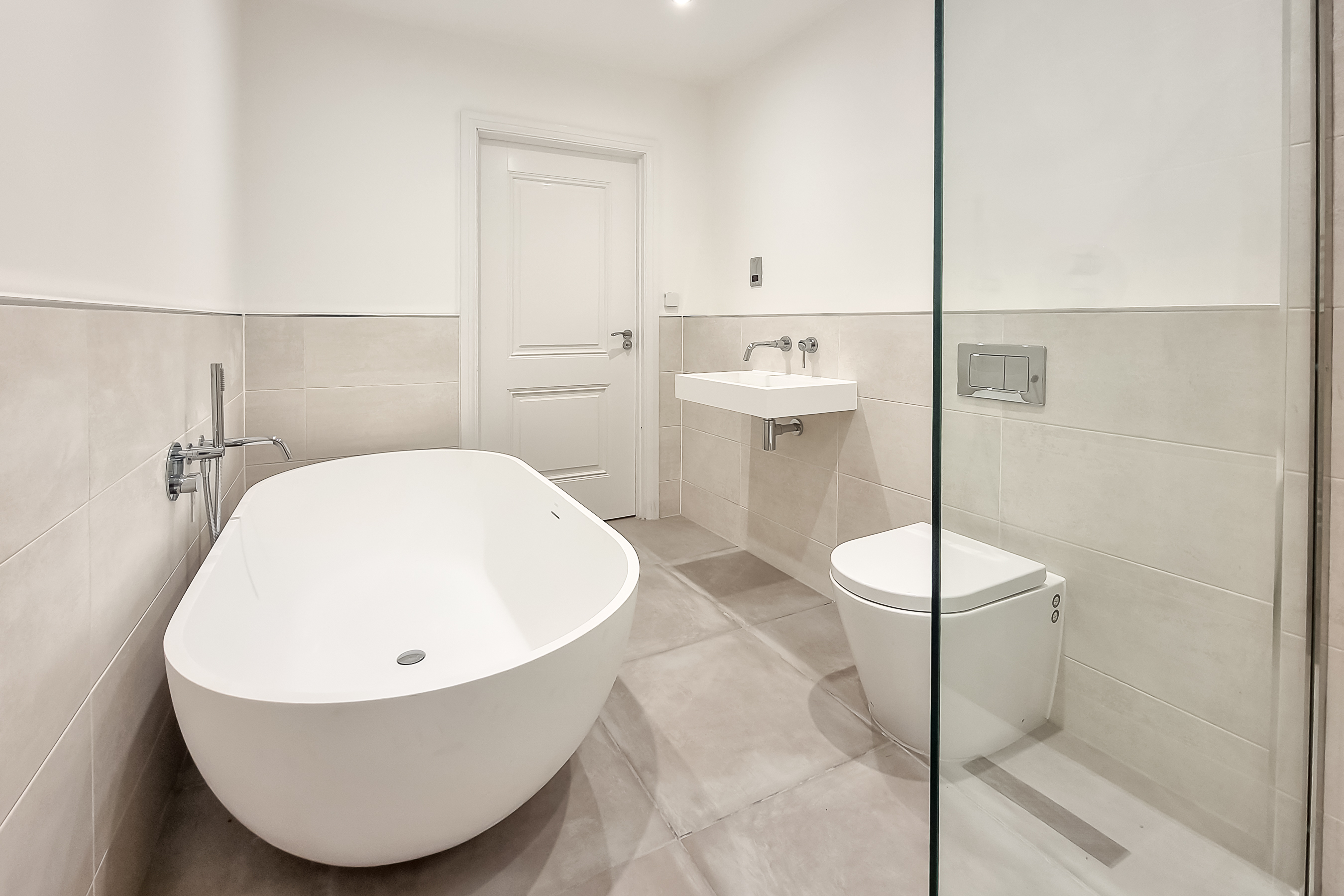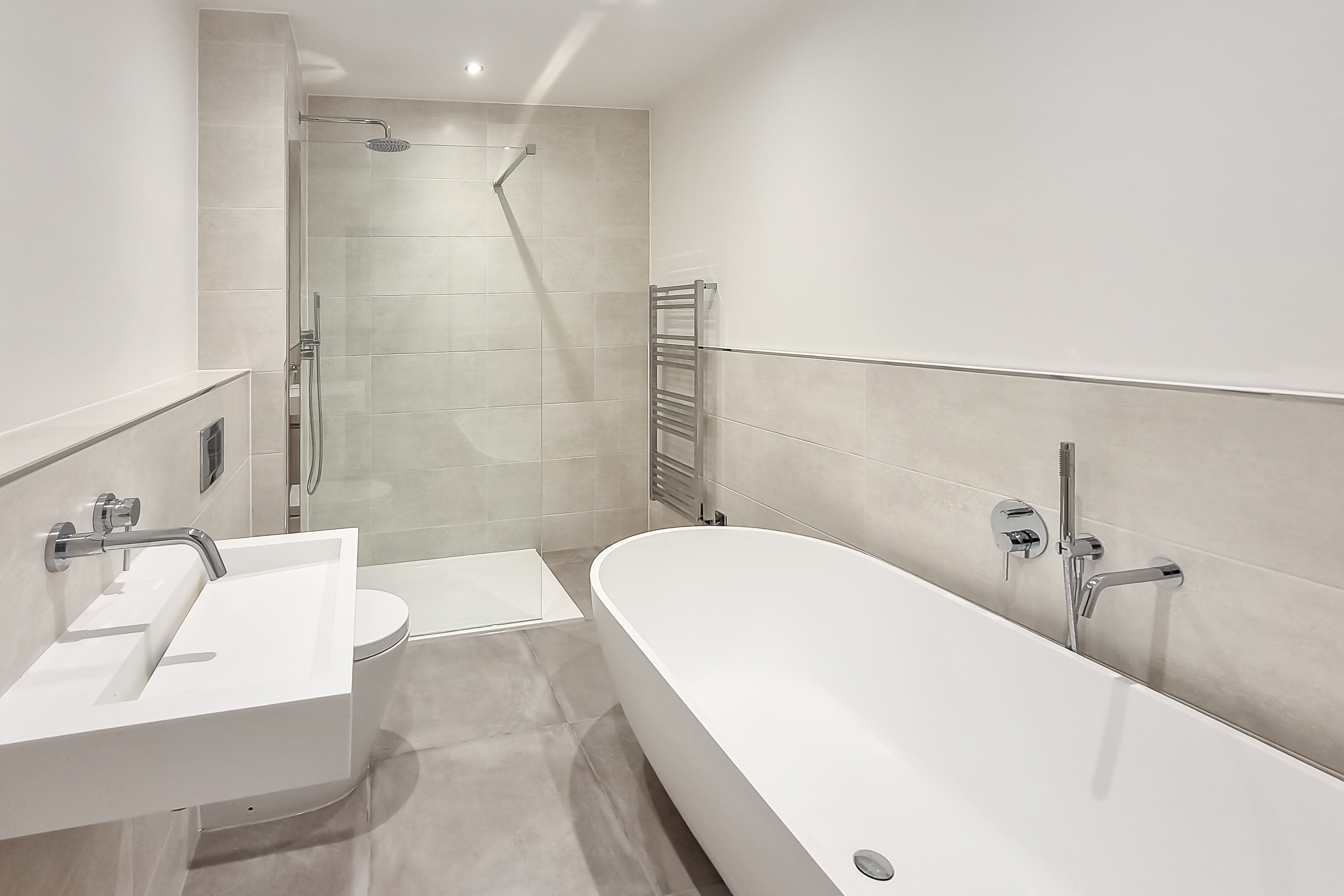 A contemporary tiled bathroom includes a luxury Lusso stone freestanding bath, sink and separate walk in shower.