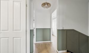 As you step inside, you're greeted by a bright and welcoming hallway. To your left, the modern kitchen is a standout feature with crisp white cabinetry, generous storage, and fully integrated appliances including a fridge freezer, washing machine, dishwasher, gas hob, and oven. It's a stylish and functional space perfect for any home cook.