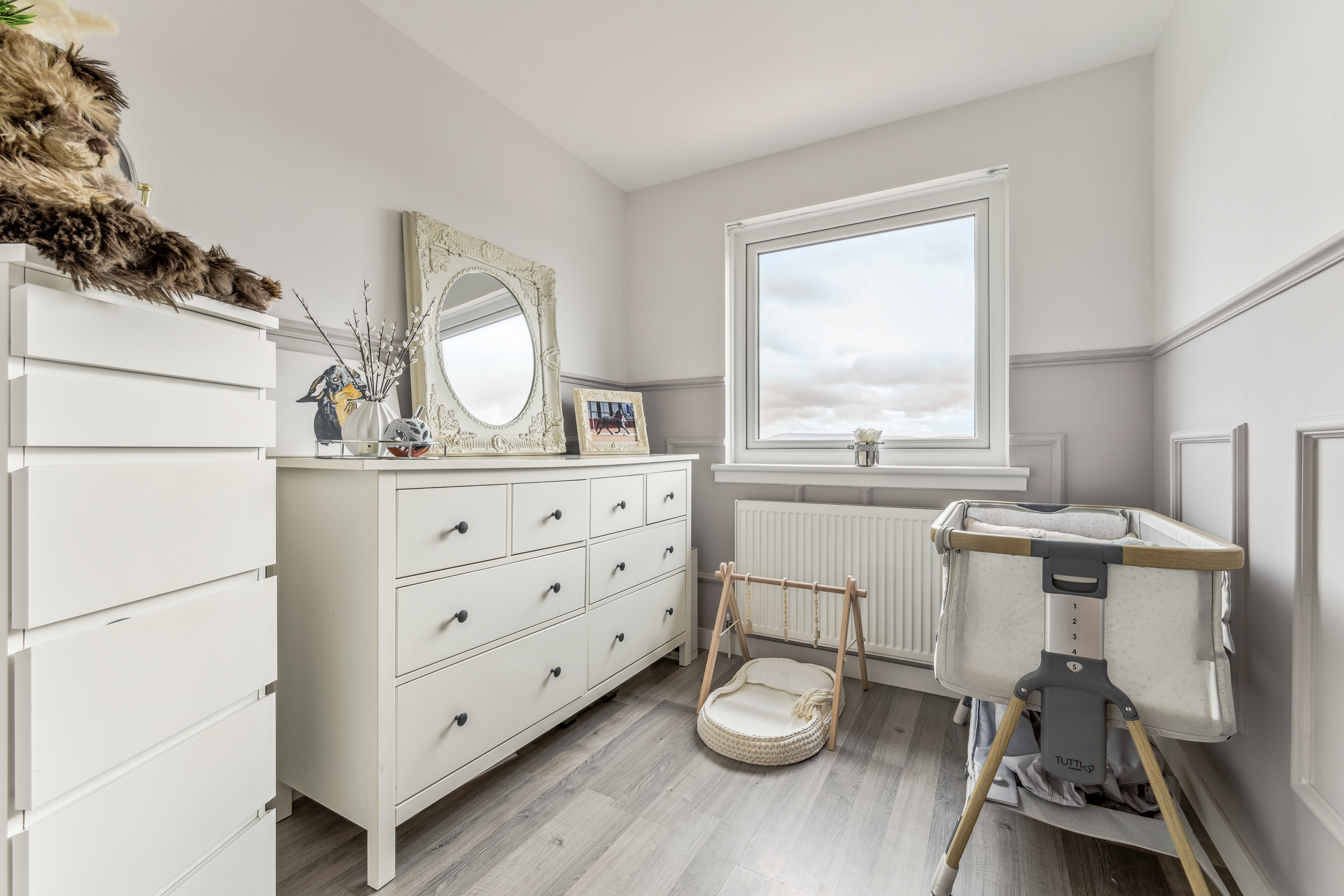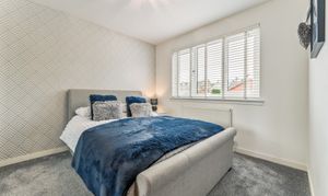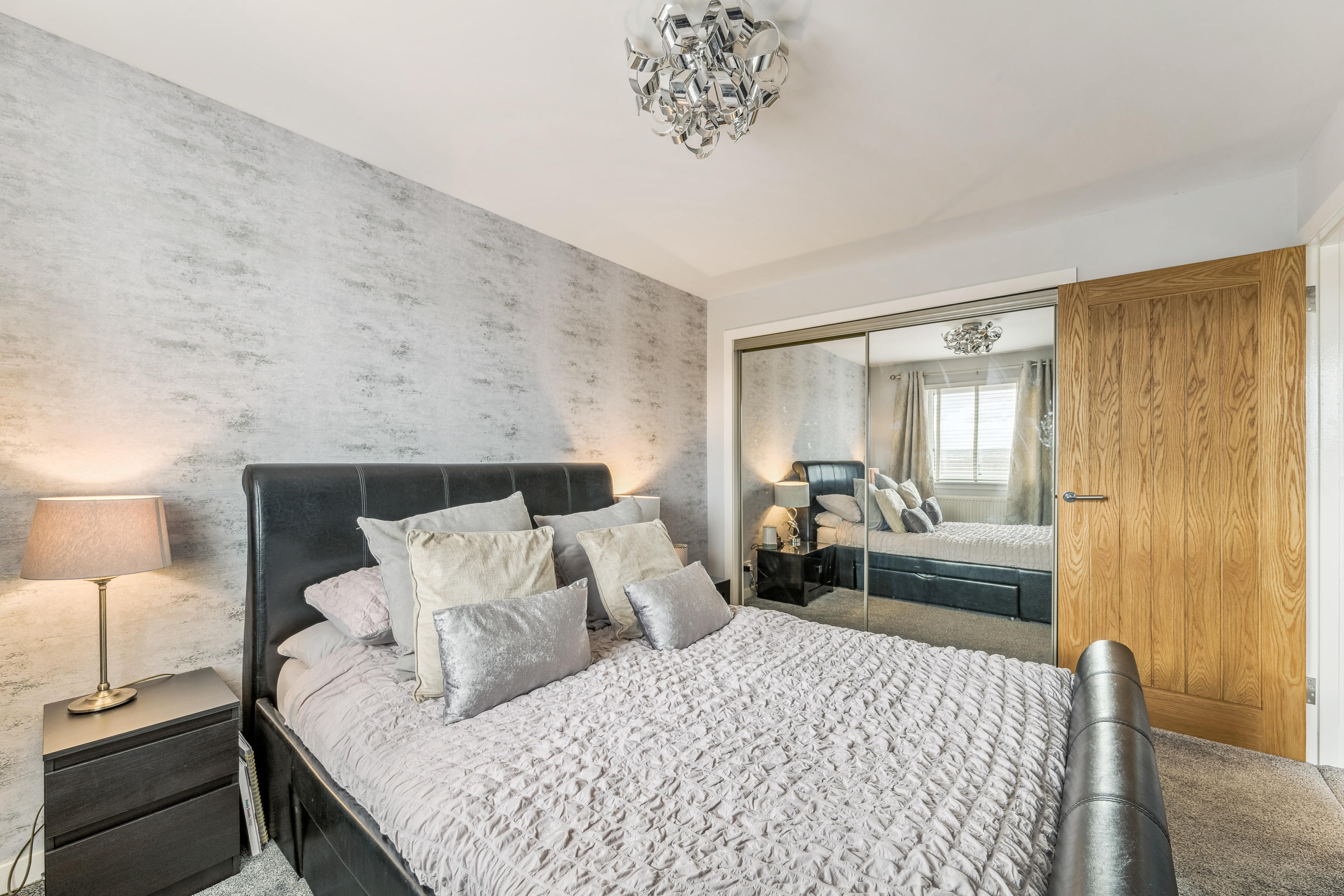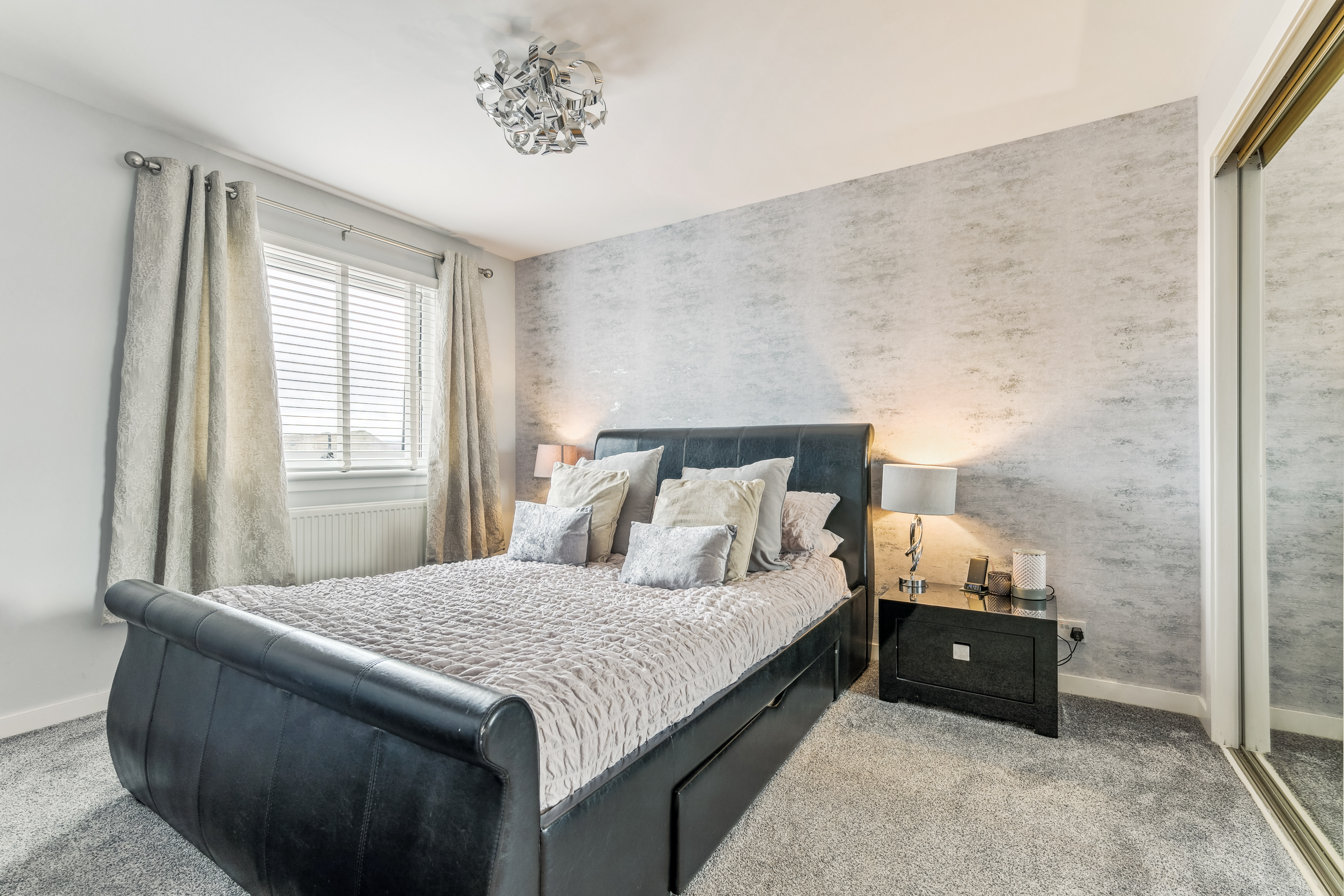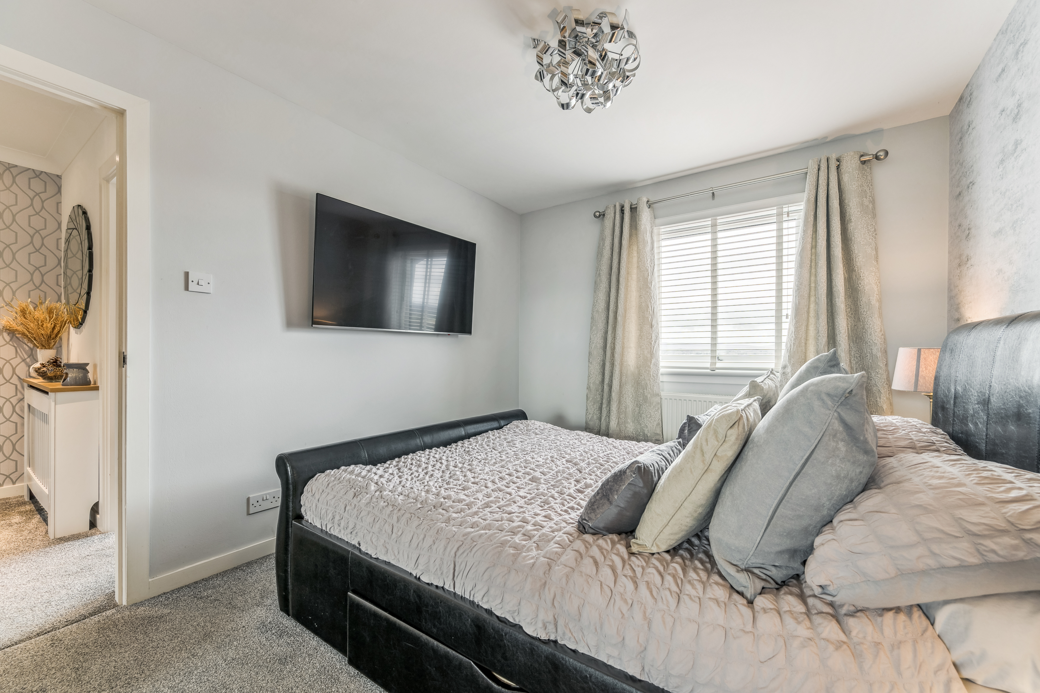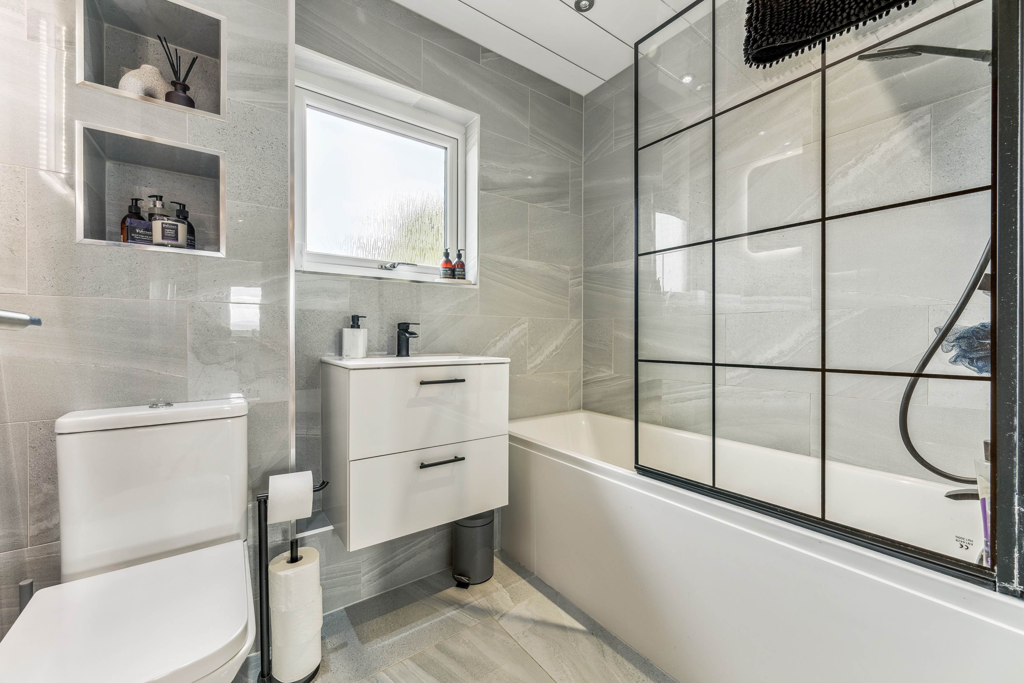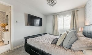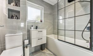 Heading upstairs, the home continues to impress. The recently upgraded shower room has been finished to an exceptional standard, fully tiled with sleek grey glossy subtle look that create a contemporary and luxurious feel. Black accents over thecontrast beautifully, adding a modern edge, while the high-quality fittings, including a stylish shower over bath, vanity unit, and WC, complete this elegant space.