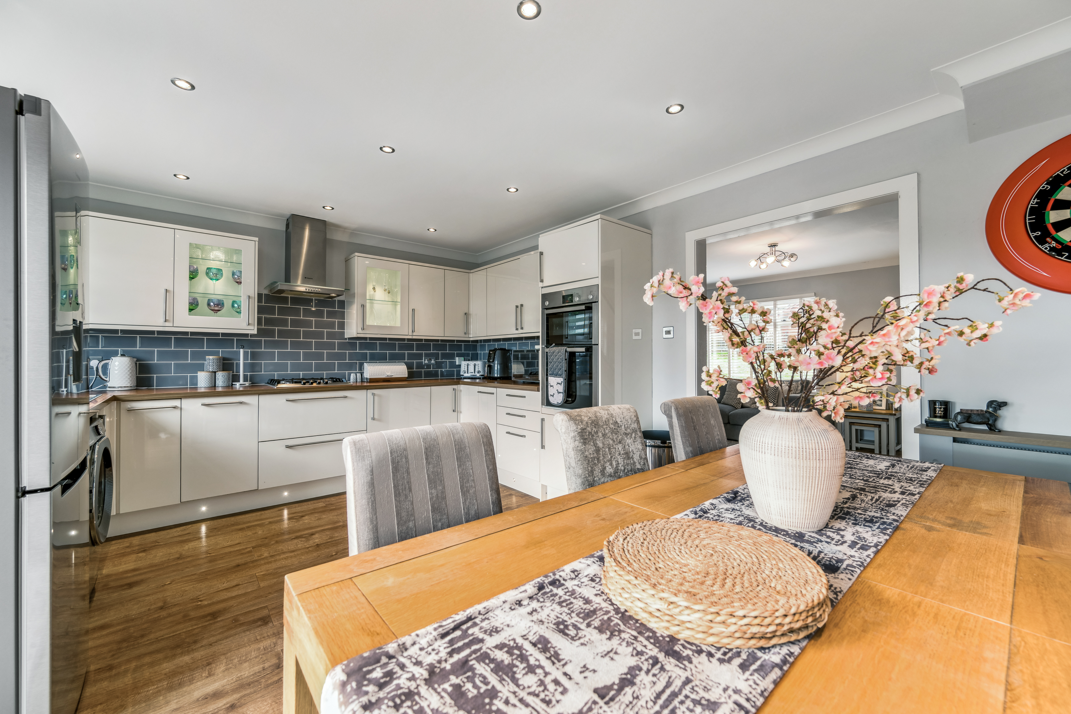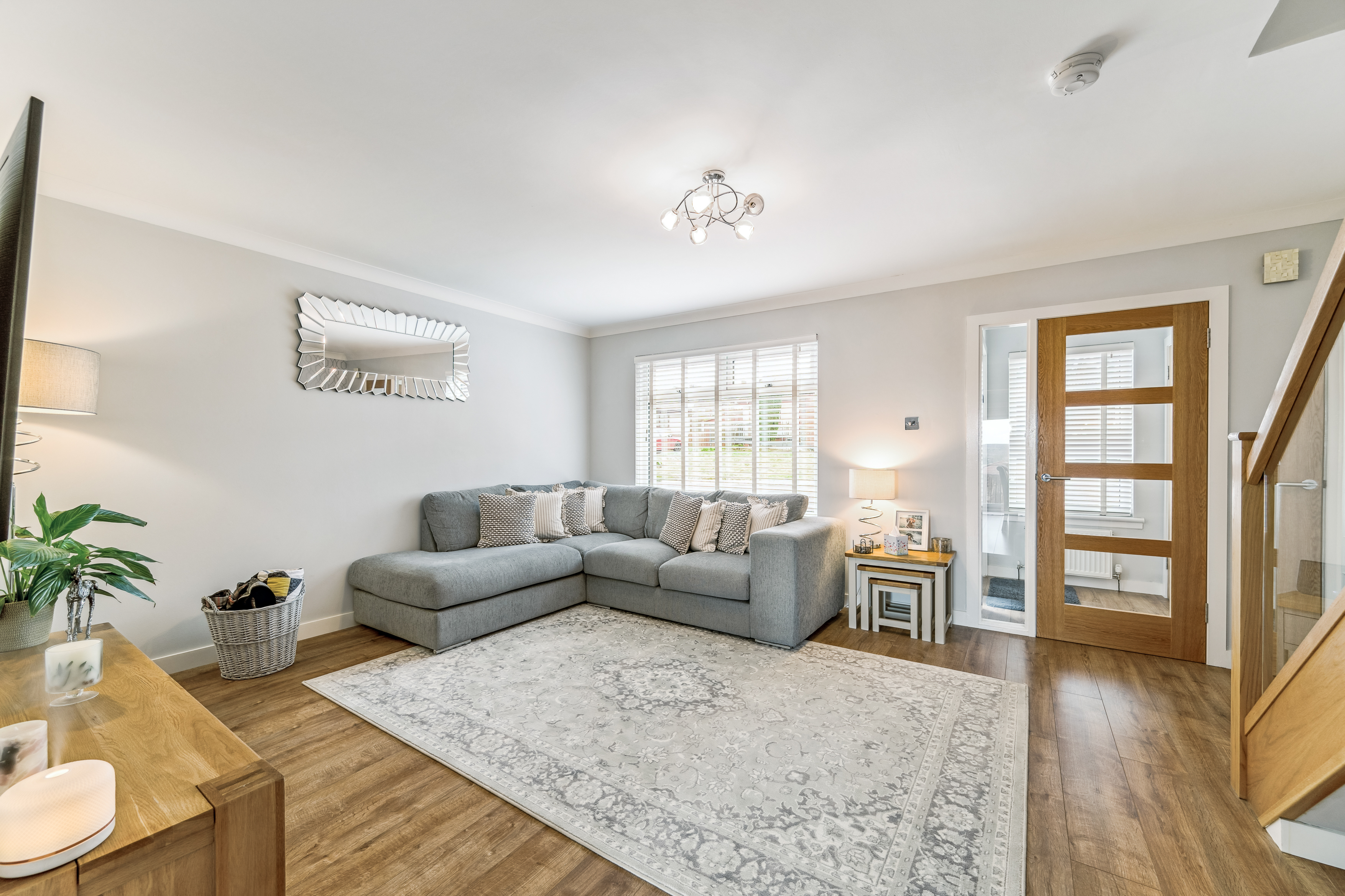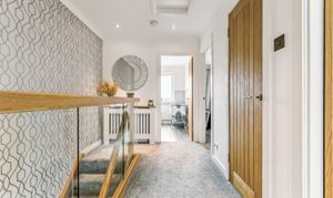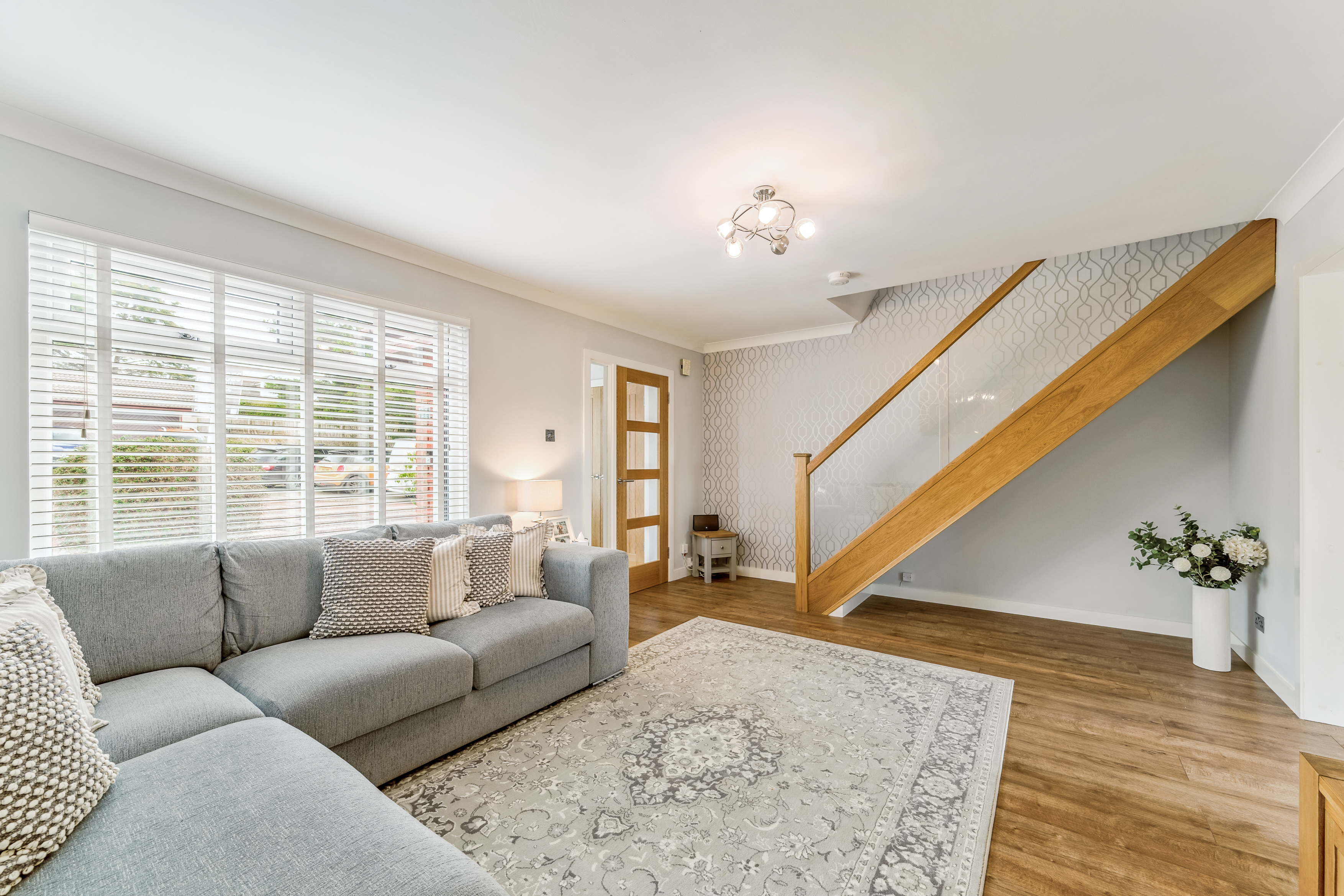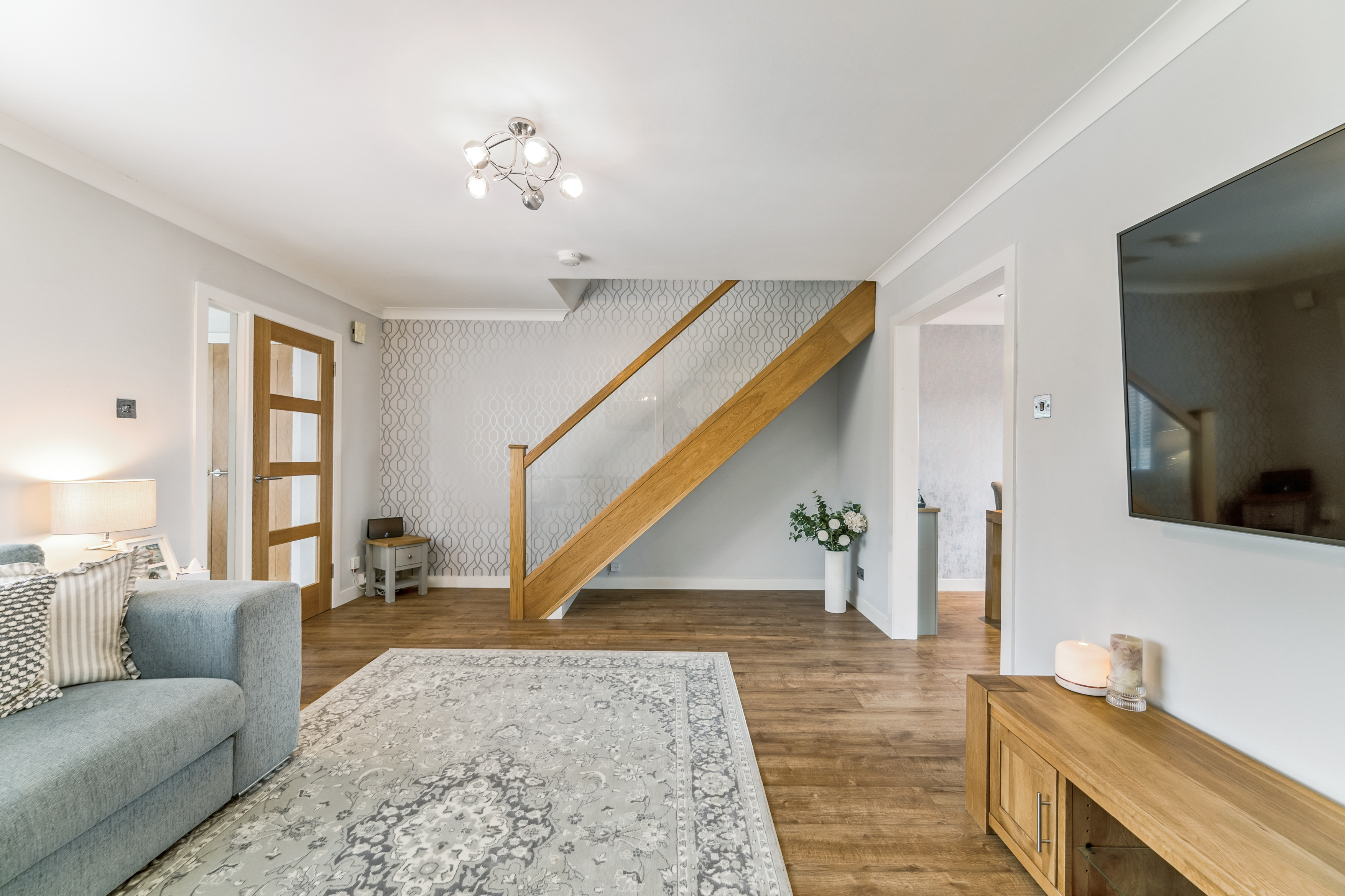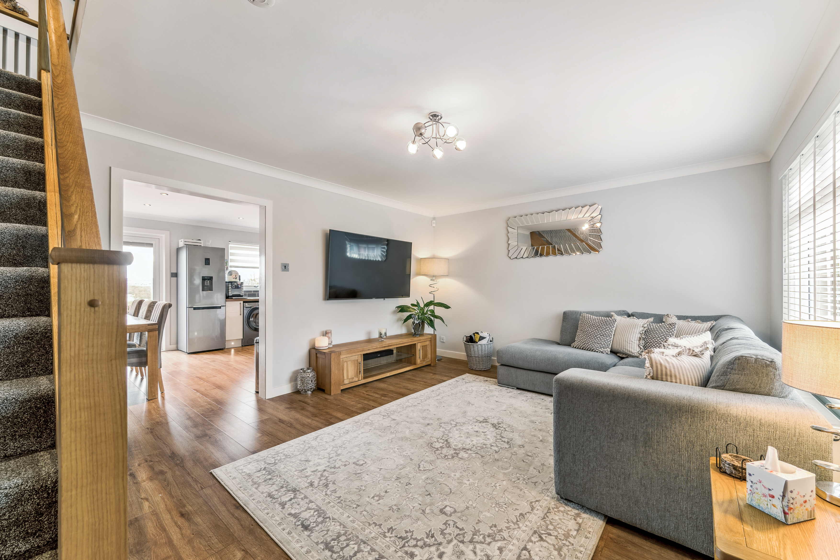 From here, you step into the lounge, a beautifully bright and neutrally decorated space designed for relaxation. A standout feature is the striking glass banister staircase, which not only adds a modern touch but also enhances the feeling of openness in the room. There is ample space for a variety of furniture layouts, whether you prefer a cosy setting with a large sofa and coffee table or an open, airy feel for entertaining guests. Large windows allow natural light to flood the space, making it a warm and welcoming environment throughout the day.
