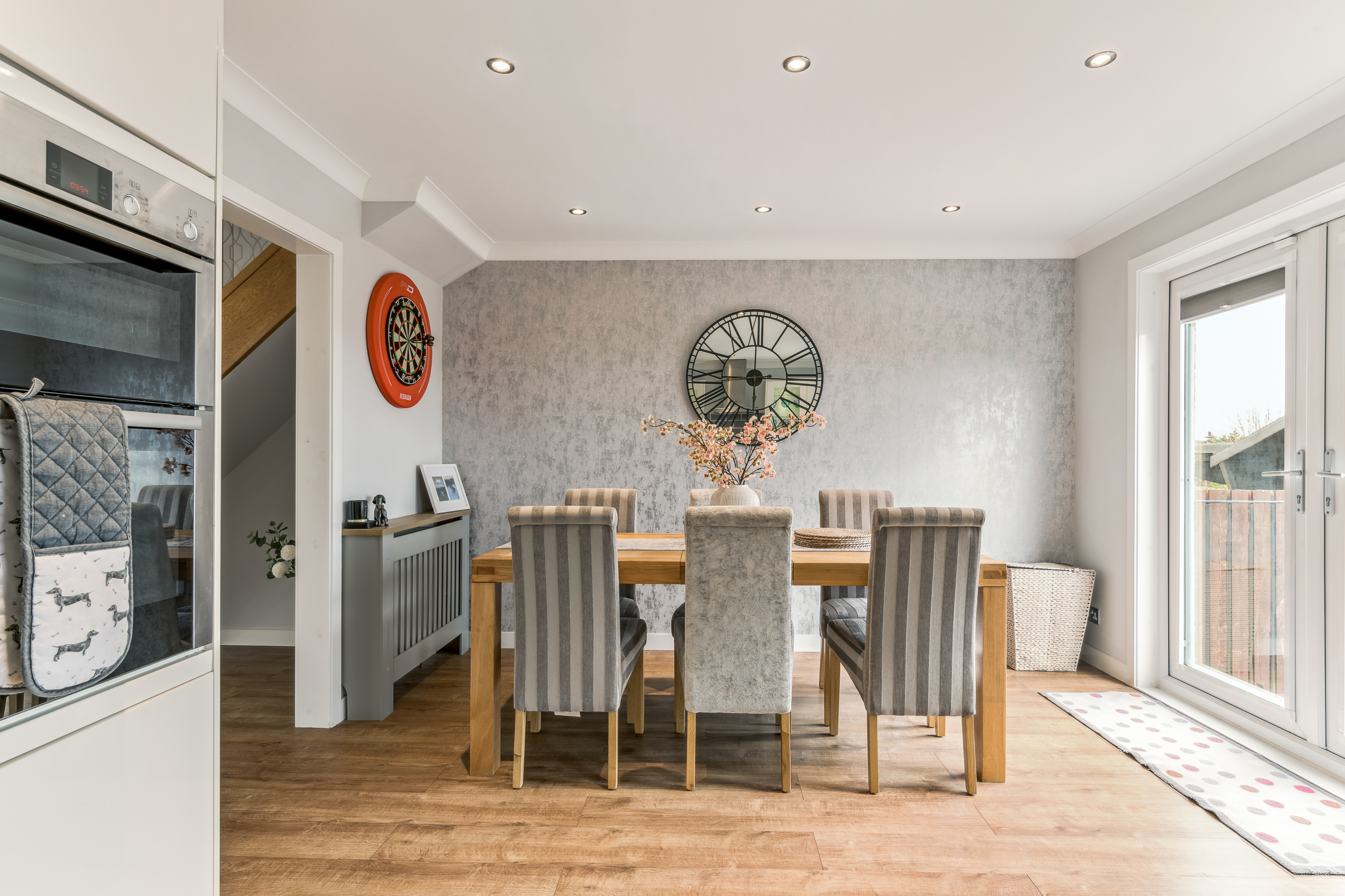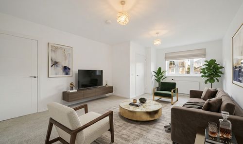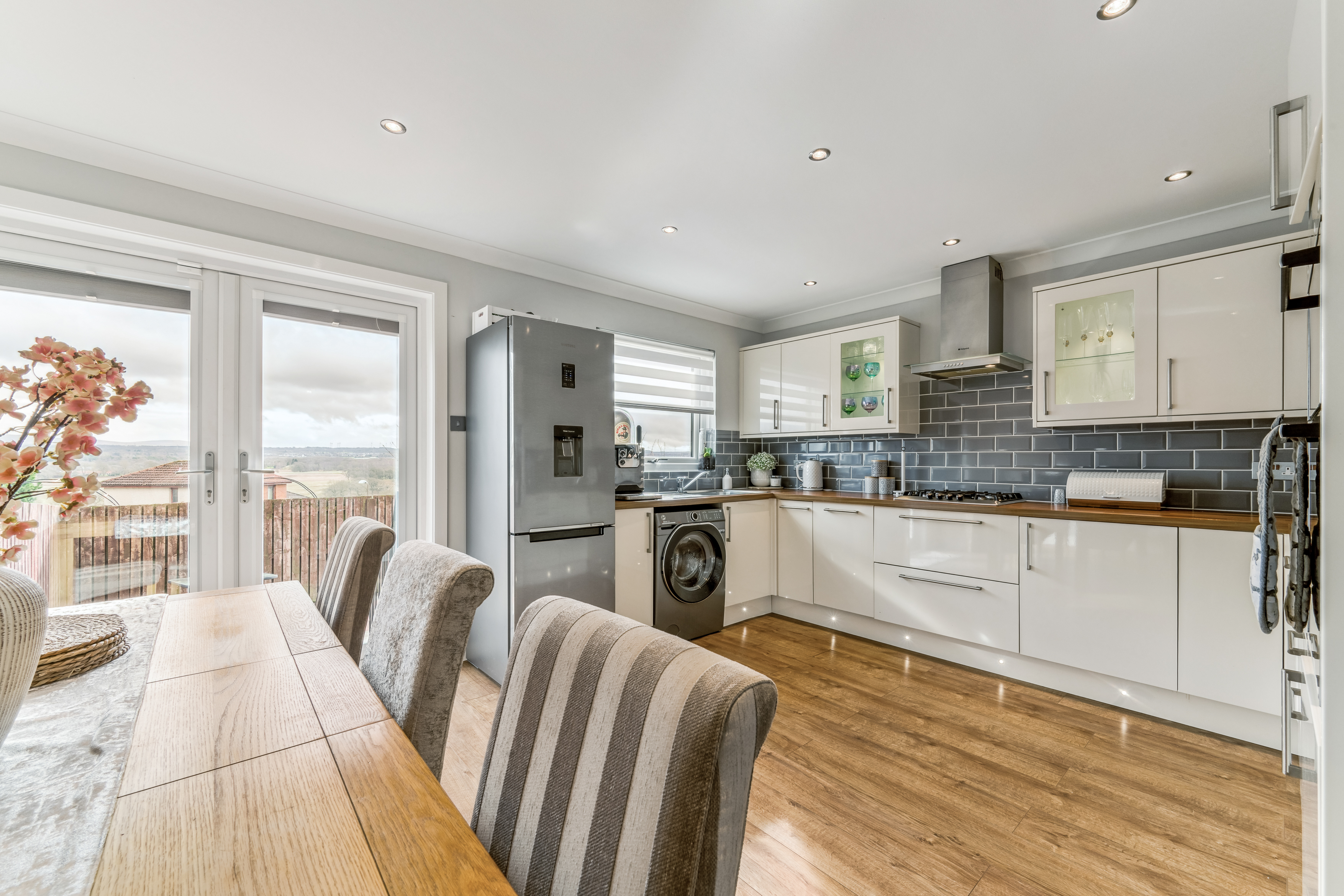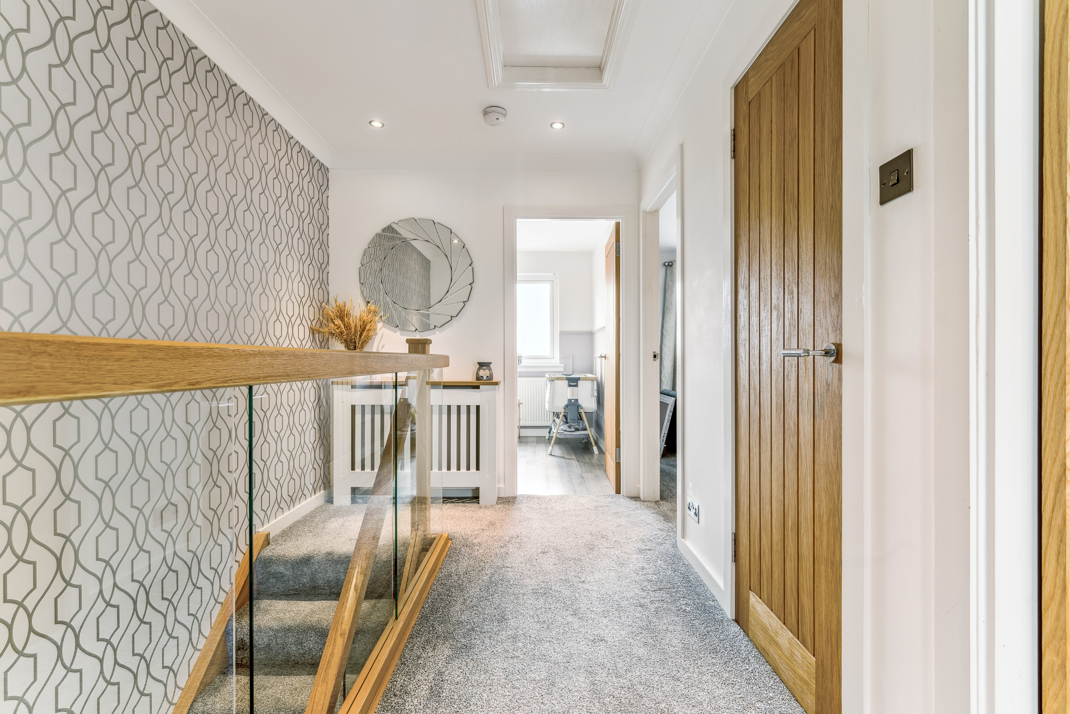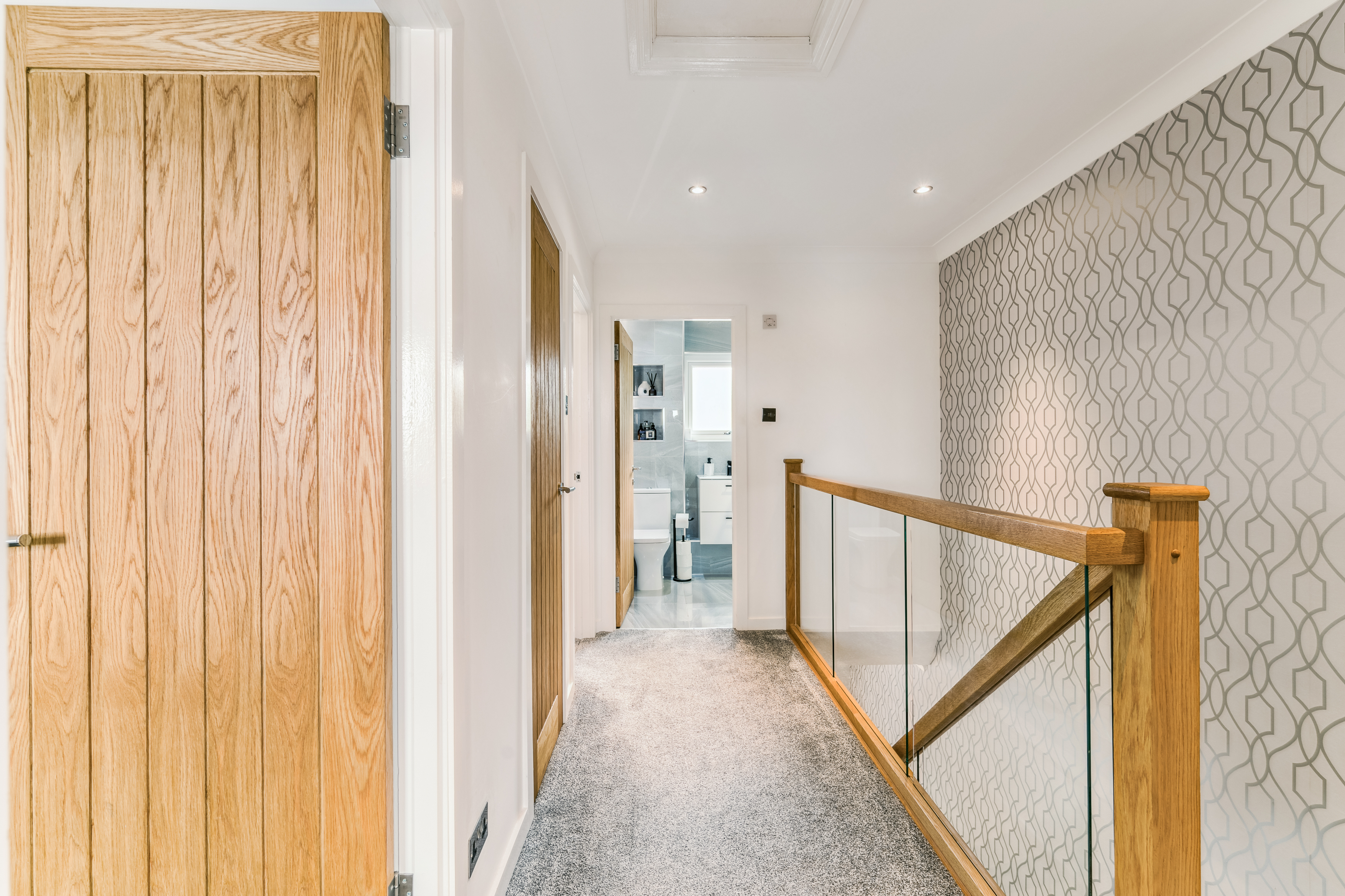 From here, you step into the lounge, a beautifully bright and neutrally decorated space designed for relaxation. A standout feature is the striking glass banister staircase, which not only adds a modern touch but also enhances the feeling of openness in the room. There is ample space for a variety of furniture layouts, whether you prefer a cosy setting with a large sofa and coffee table or an open, airy feel for entertaining guests. Large windows allow natural light to flood the space, making it a warm and welcoming environment throughout the day.