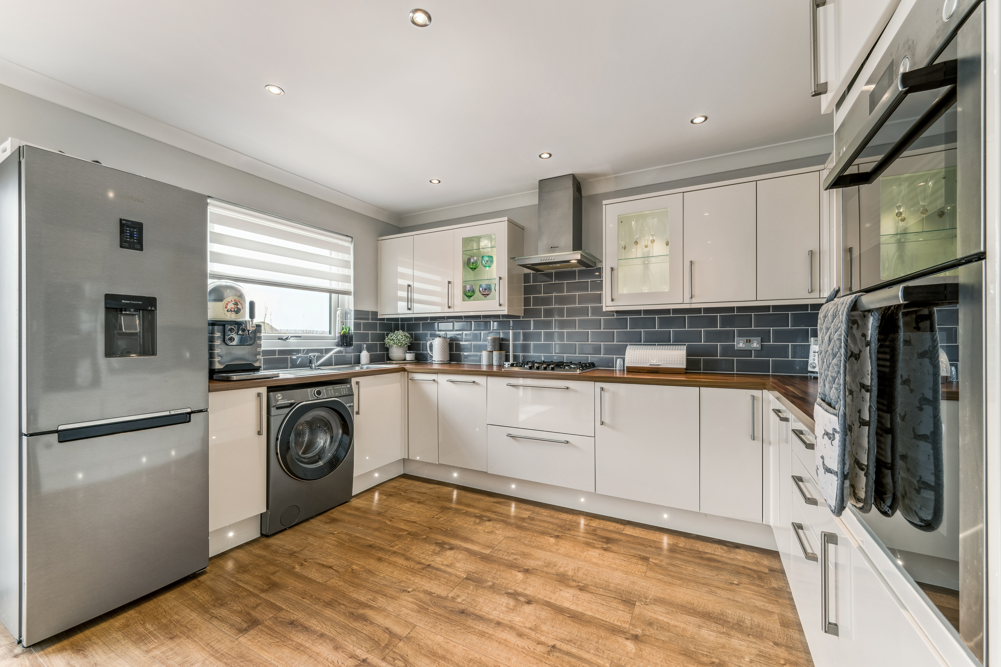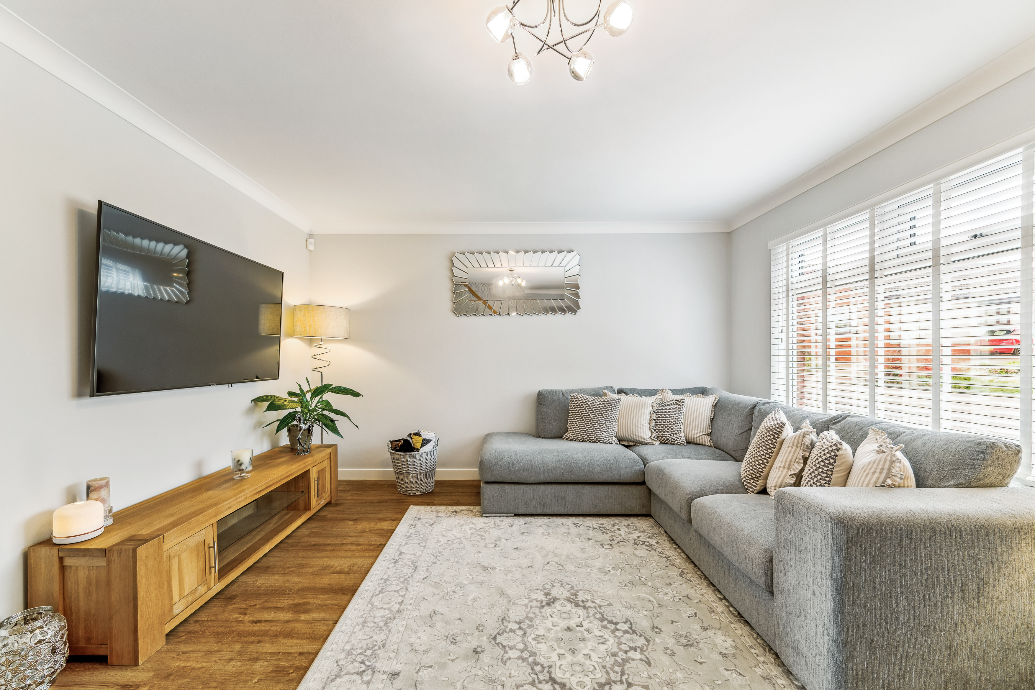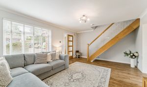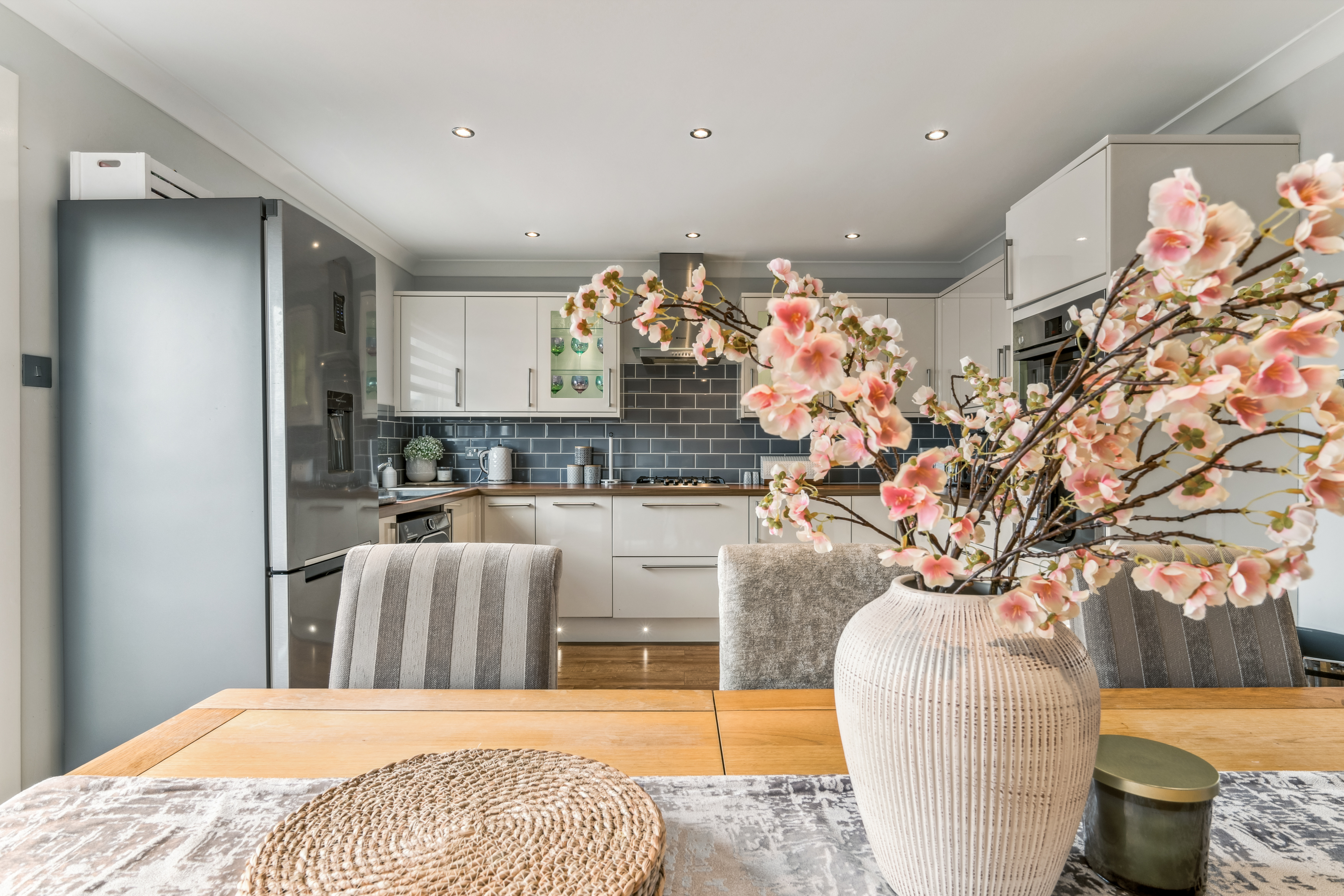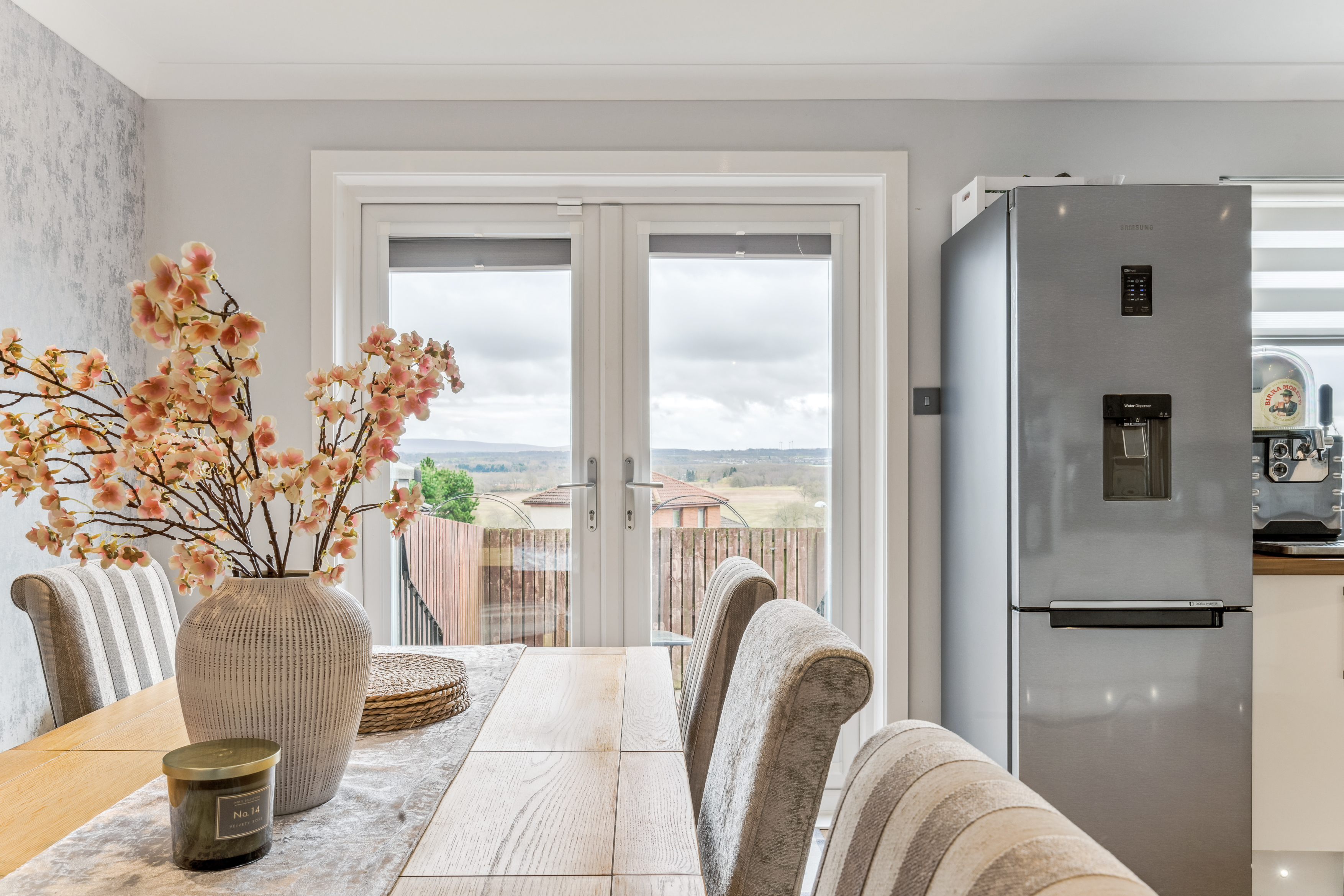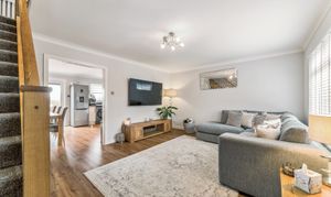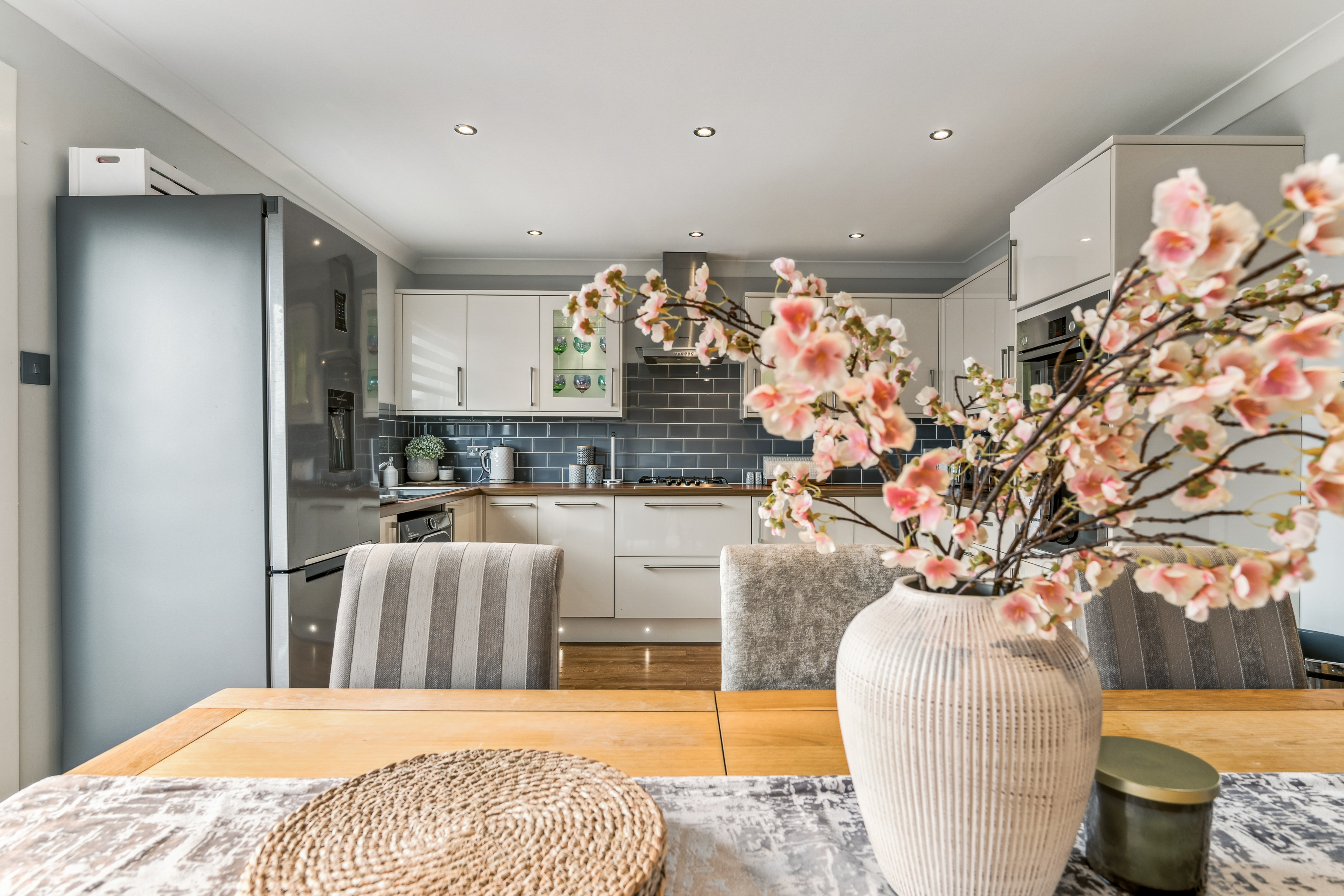 From here, you step into the lounge, a beautifully bright and neutrally decorated space designed for relaxation. A standout feature is the striking glass banister staircase, which not only adds a modern touch but also enhances the feeling of openness in the room. There is ample space for a variety of furniture layouts, whether you prefer a cosy setting with a large sofa and coffee table or an open, airy feel for entertaining guests. Large windows allow natural light to flood the space, making it a warm and welcoming environment throughout the day.
