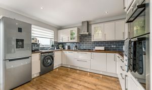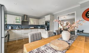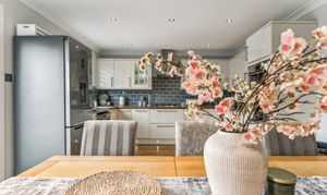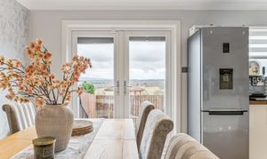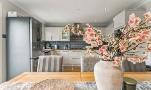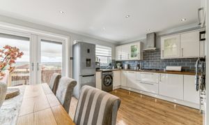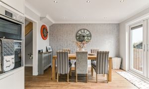 Flowing effortlessly from the lounge through an open archway is the kitchen/diner, the true heart of the home. Designed with both style and practicality in mind, this modern kitchen boasts a generous amount of counter and cupboard space, ensuring ample storage and workspace for home cooks. The layout is perfectly suited for a dining table, making it the ideal setting for family meals or social gatherings. Patio doors lead directly to the private rear garden, a low-maintenance outdoor space that enjoys a southwest-facing position, allowing for plenty of natural sunlight. Whether you're enjoying a quiet morning coffee, hosting a summer barbecue, or watching children play, this garden offers a private and peaceful retreat.