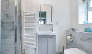 On the first floor, bedroom one is a double aspect room with leaded light windows, original picture frame and a corner hand basin. There are three further bedrooms with built-in storage on this floor.