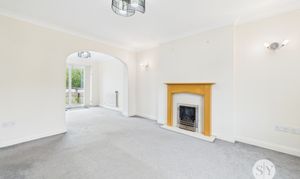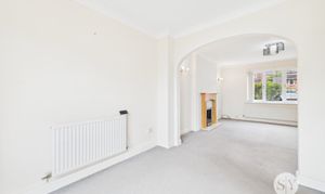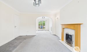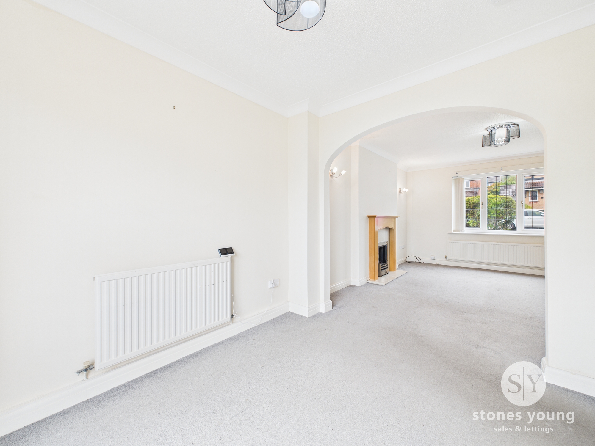 Carpet flooring, ceiling coving, gas fire with marble hearth and wood surround, archway leading into dining room, under stairs storage, double glazed uPVC window, panel radiator.