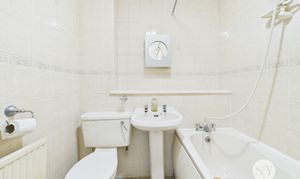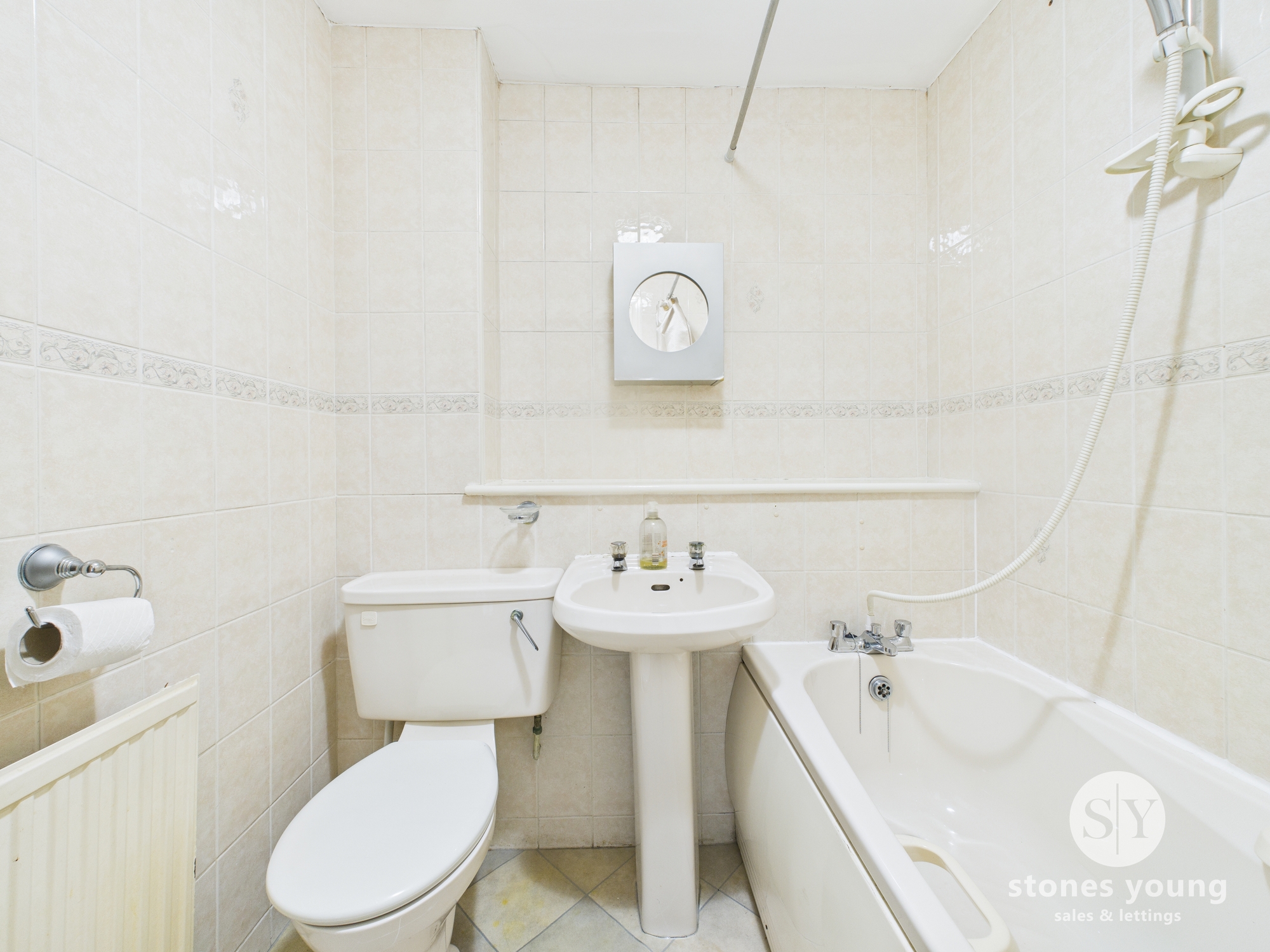Vinyl flooring, three piece in cream comprising of mains fed shower over bath, wc and basin, tiled floor to ceiling, panel radiator.