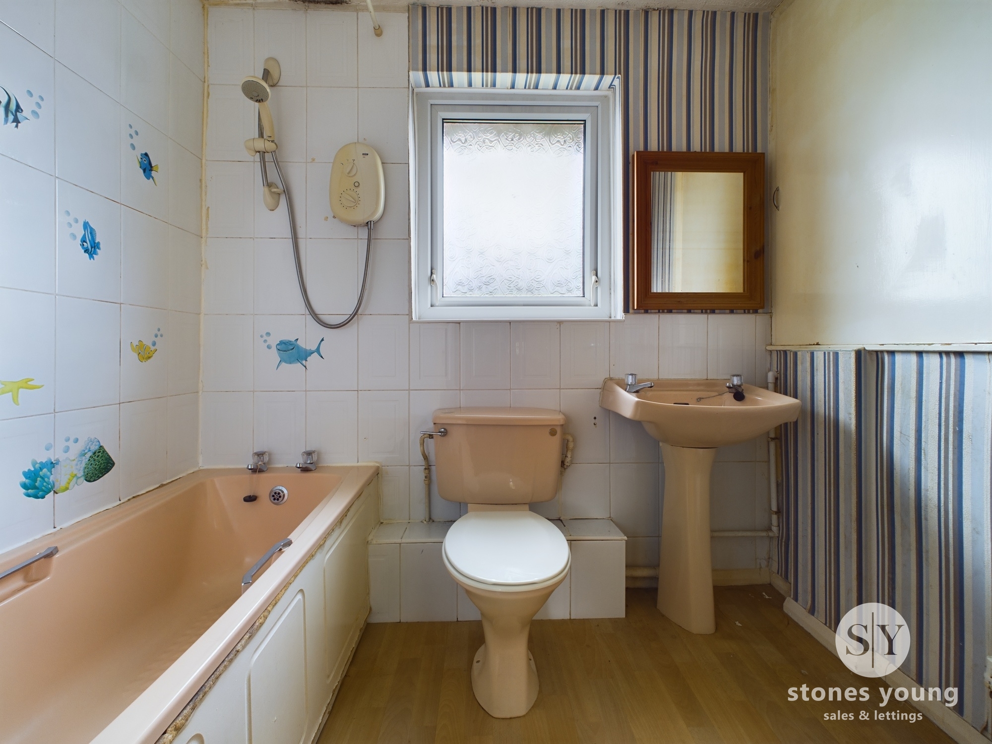 Three piece in peach where the electric shower over bath, tiled splashbacks, linole flooring, upvc double glazed rusted window, panel radiator, storage cupboard.