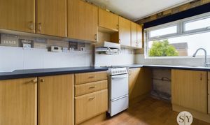 Range of fitted wall and base units with contrasting work surfaces, stainless steel sink, tiled splashbacks, space for gas oven, integral extractor, plumbed for washing machine, space for under counter fridge, uPVC window, lino flooring.