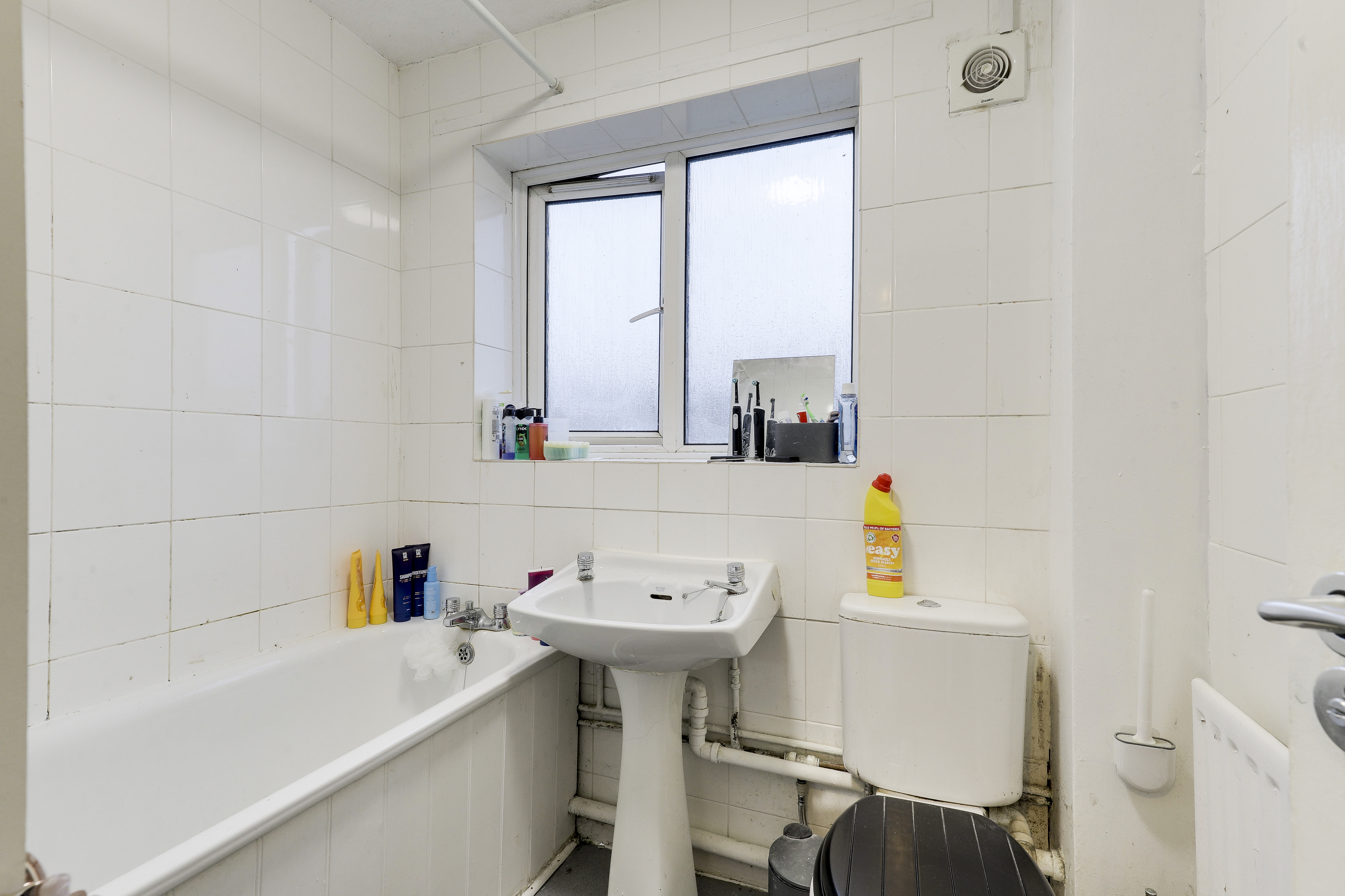 The bathroom has a low level dual flush W/C, a pedestal wash basin, a panelled bath, tiled walls, an extractor fan, vinyl flooring, a radiator and a UPVC double-glazed obscure window to the rear elevation.