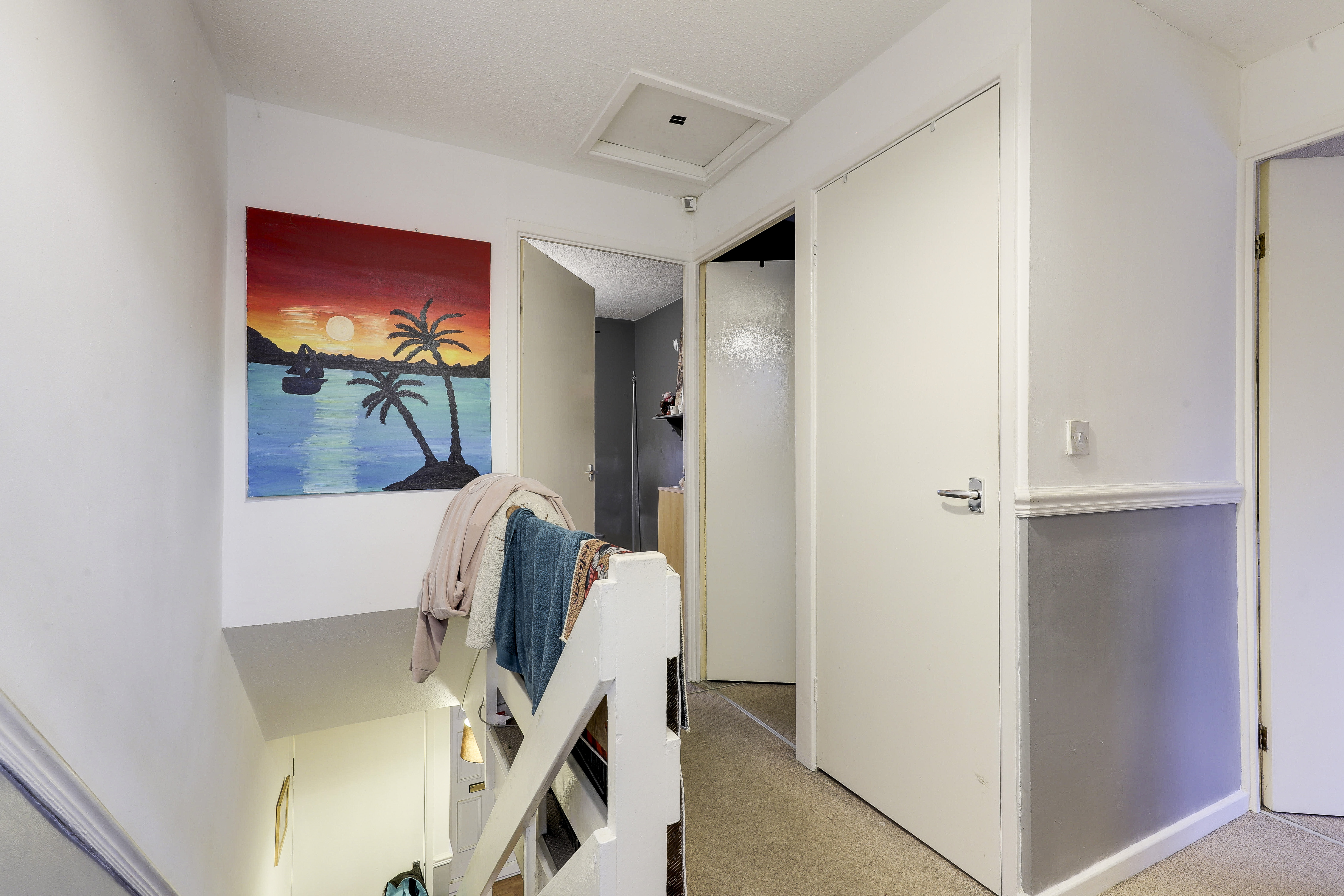 The landing has carpeted flooring, a dado rail, two in-built cupboards, access to the first floor accommodation and access to the loft.