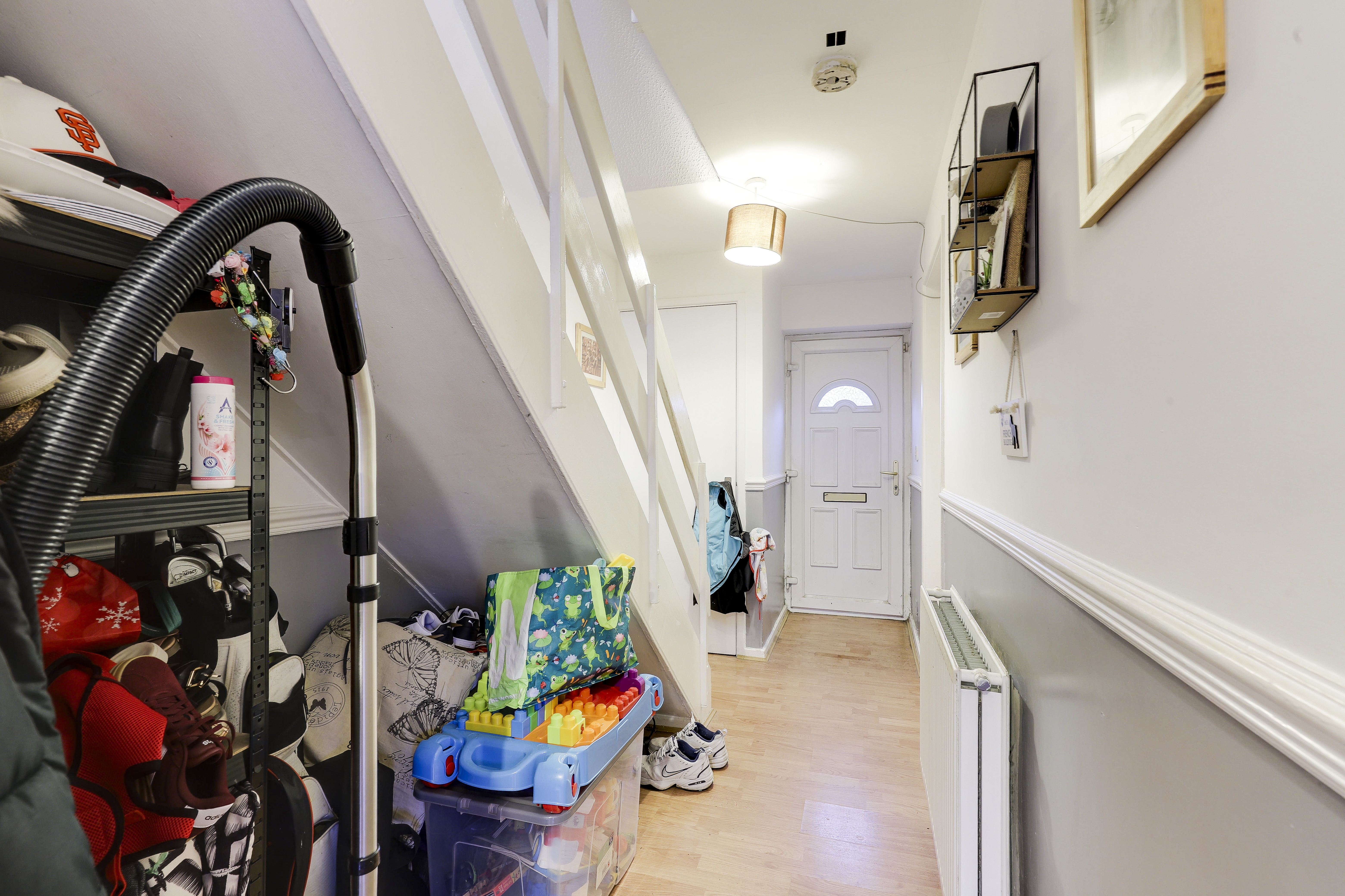 The entrance hall has laminate wood-effect flooring with carpeted stairs, a radiator, a dado rail, two in-built cupboards, a single UPVC door providing access into the accommodation and a single UPVC door providing access to the rear garden.
