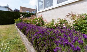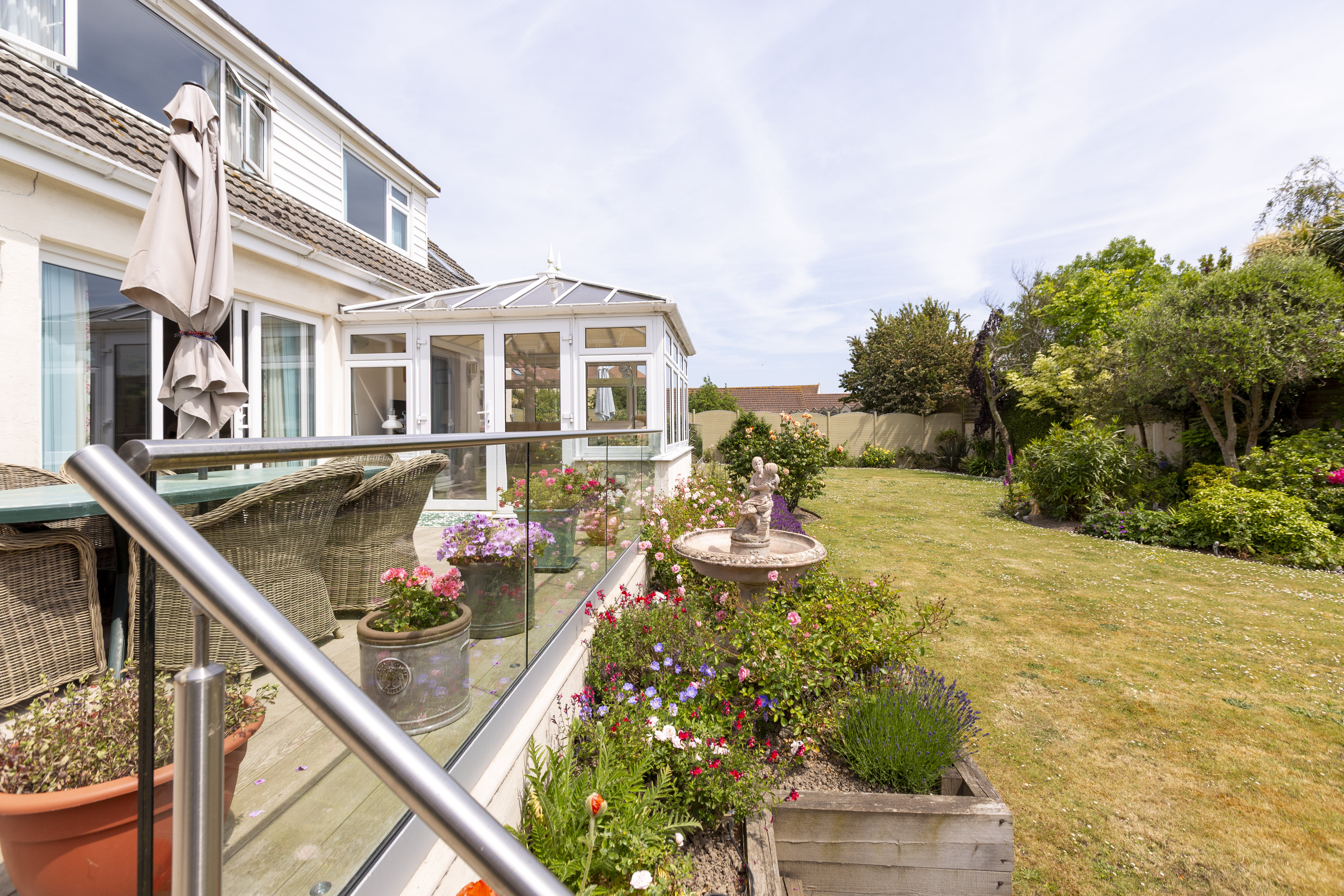 Beautiful garden which has an array of colourful flowers. Laid to grass with two raised terraces.
