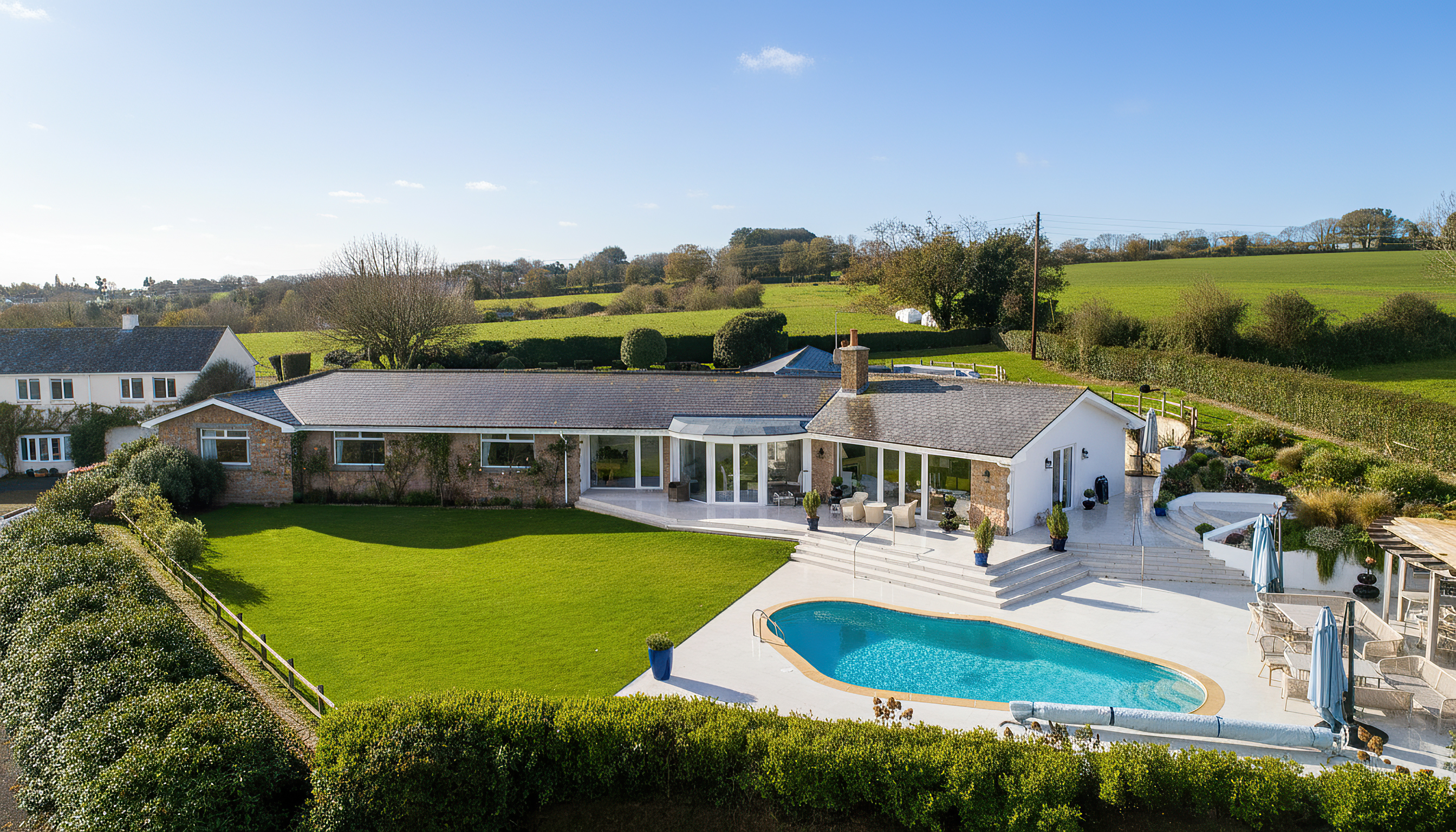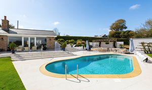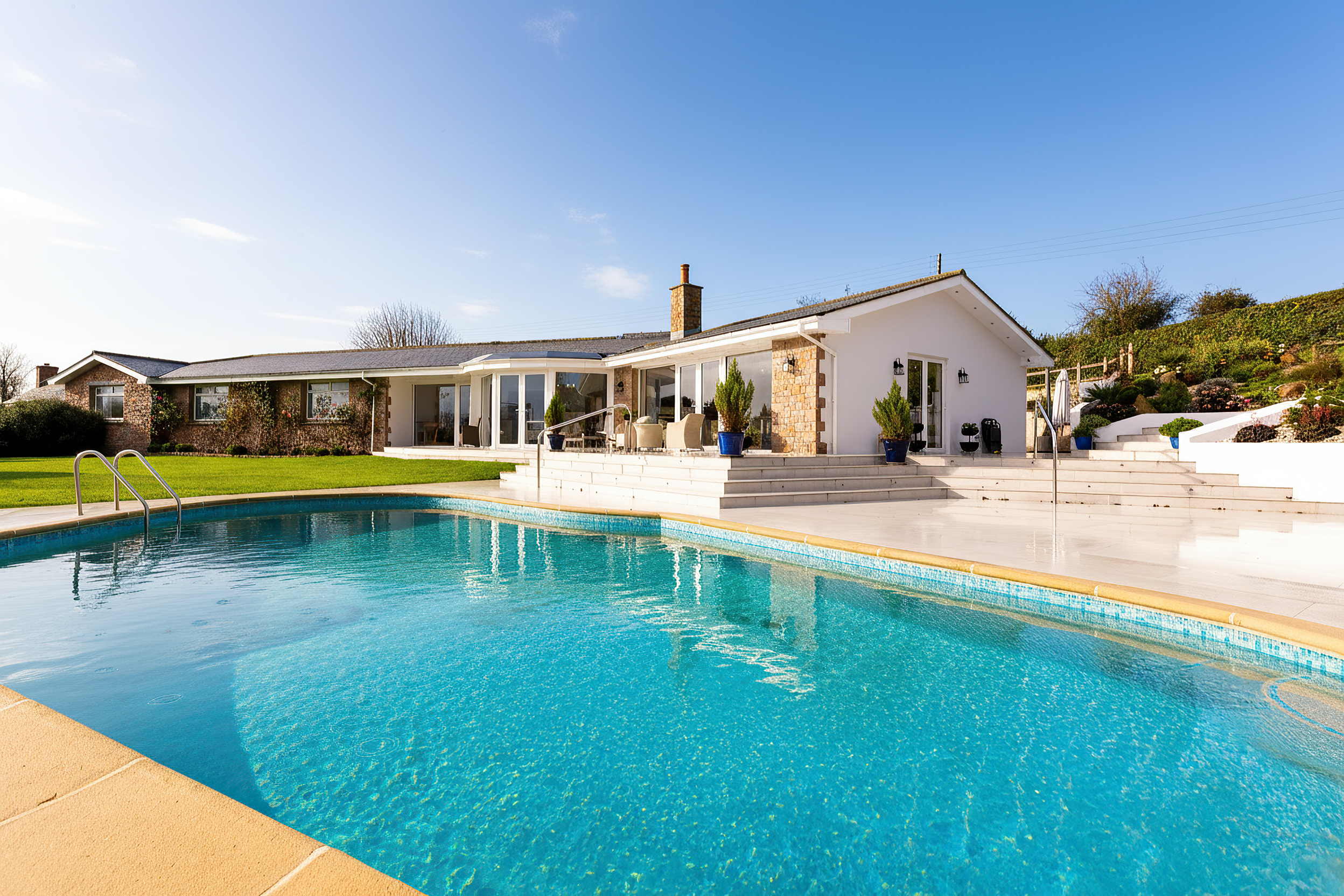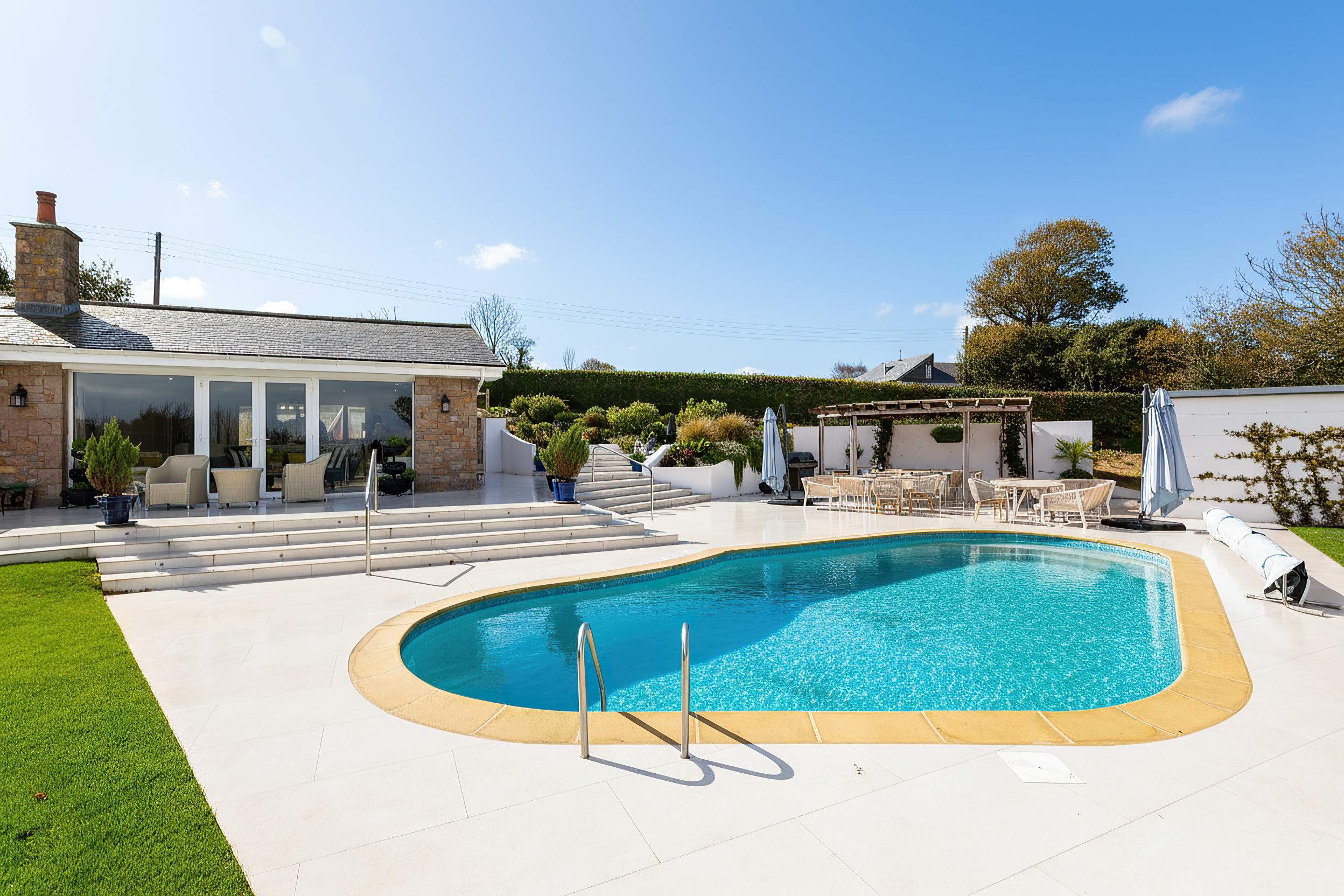The beautifully manicured garden is a standout feature, complete with a heated swimming pool, generous lawned areas and attractive planting that creates a peaceful and private outdoor environment