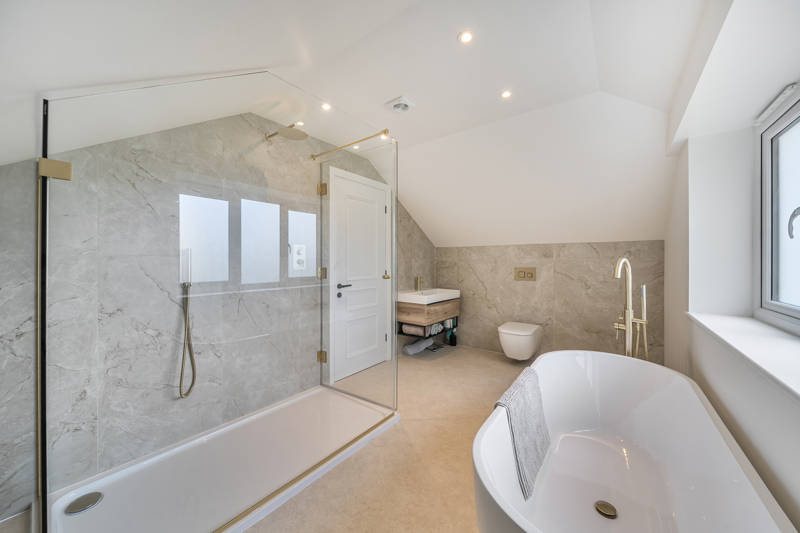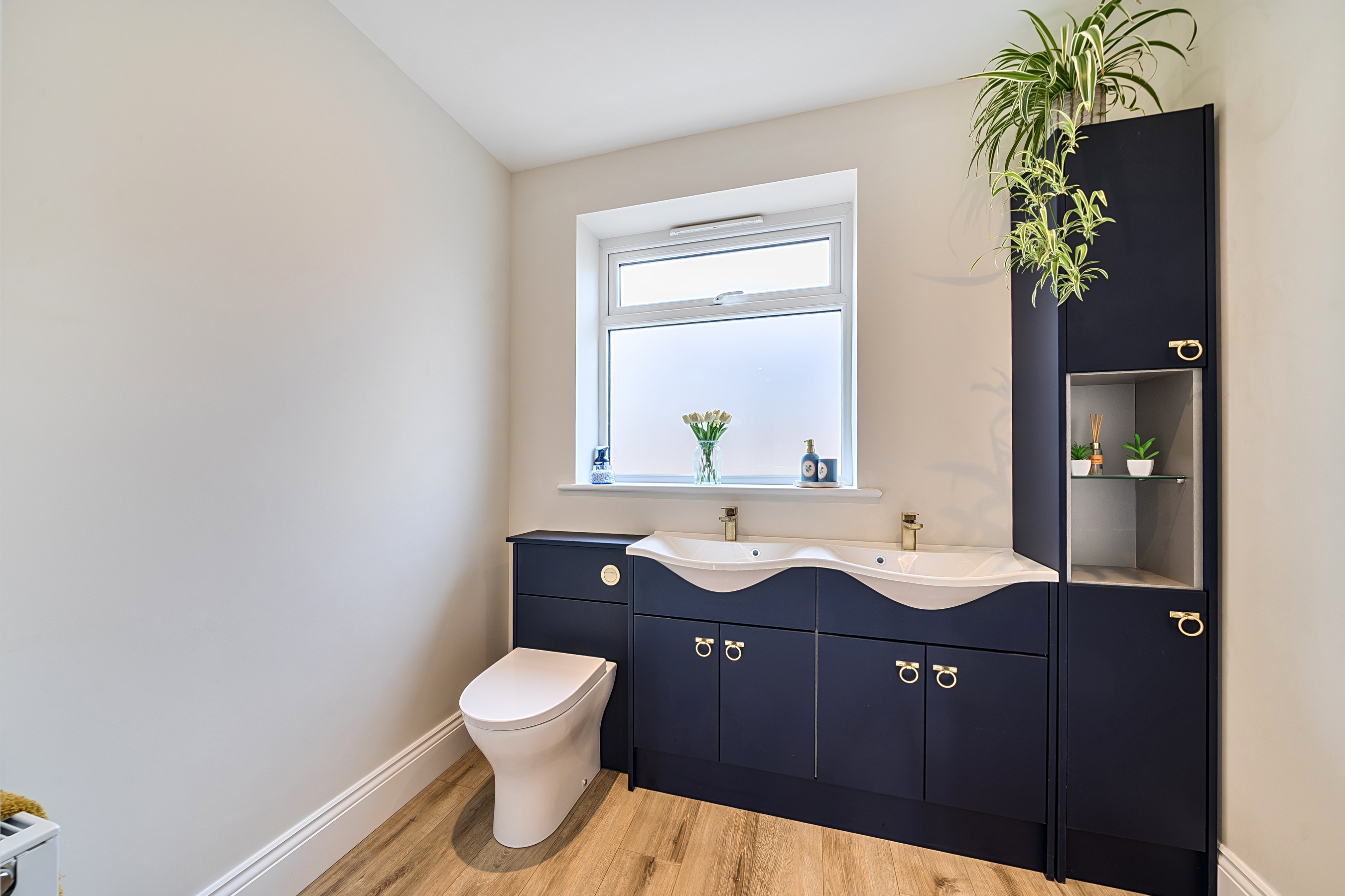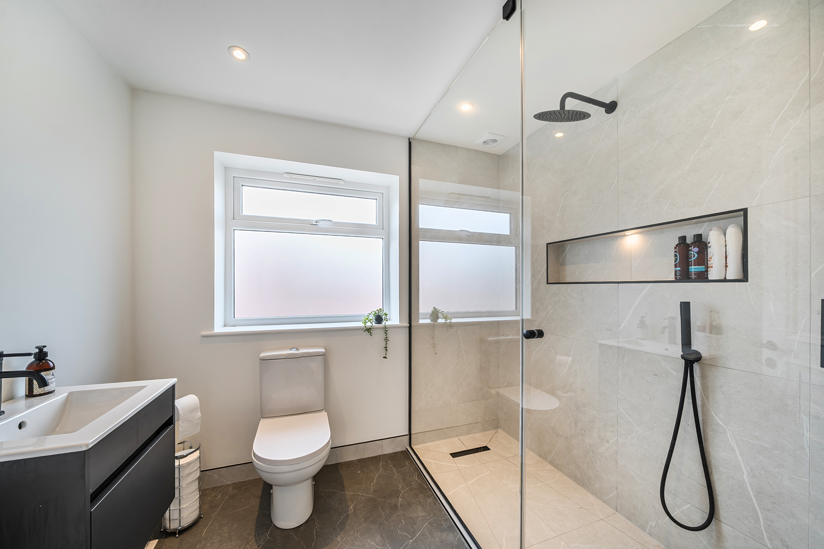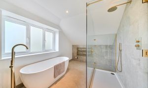 Across three floors, the home offers five generous bedrooms and three beautifully appointed bathrooms. The principal suite includes a luxurious en-suite shower room, while the further bathrooms are fitted with sleek, modern fixtures and finished in neutral tones to create a calming, high-quality feel throughout.