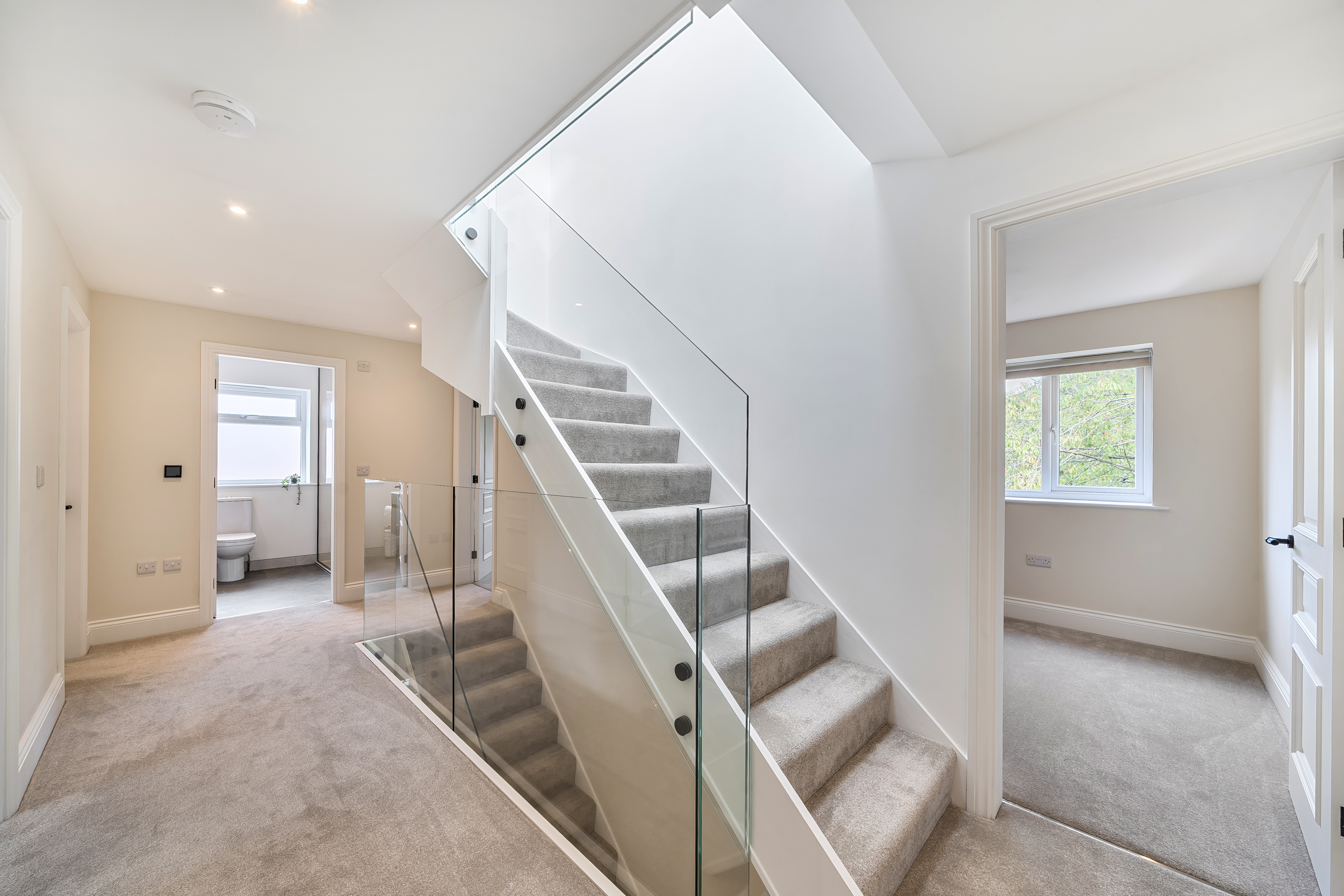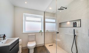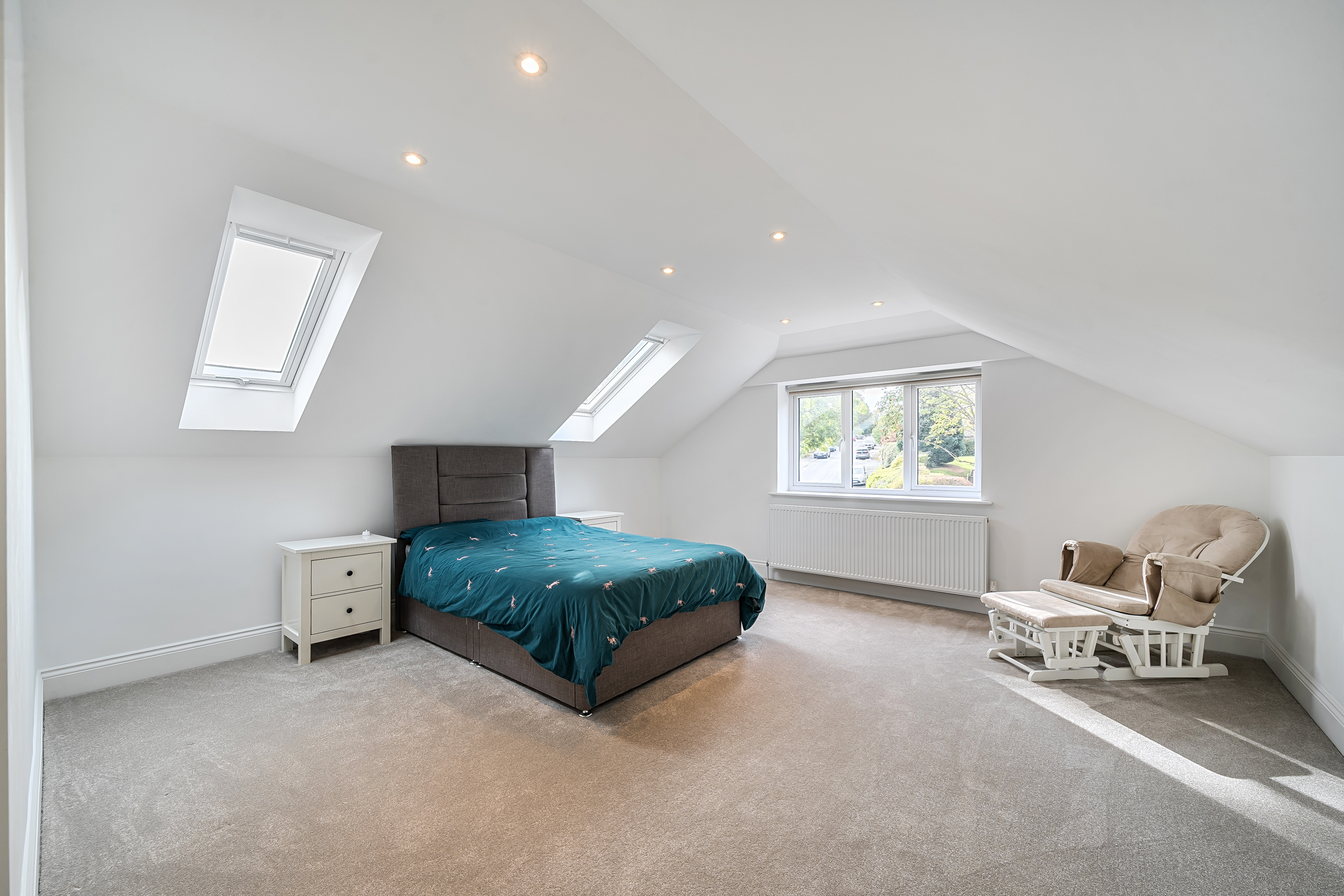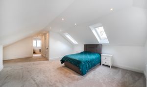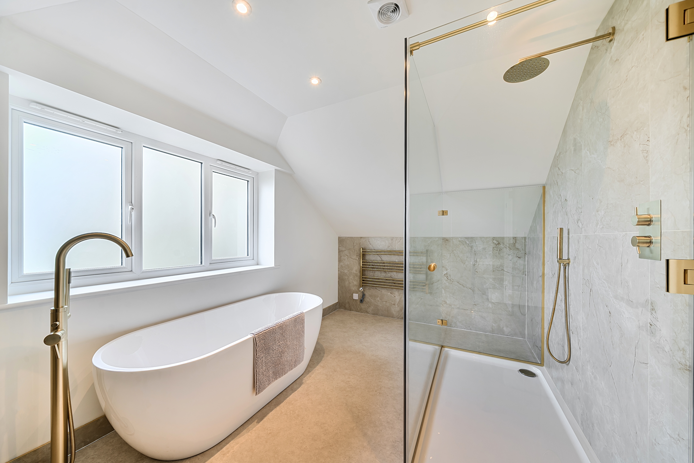 Across three floors, the home offers five generous bedrooms and three beautifully appointed bathrooms. The principal suite includes a luxurious en-suite shower room, while the further bathrooms are fitted with sleek, modern fixtures and finished in neutral tones to create a calming, high-quality feel throughout.