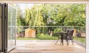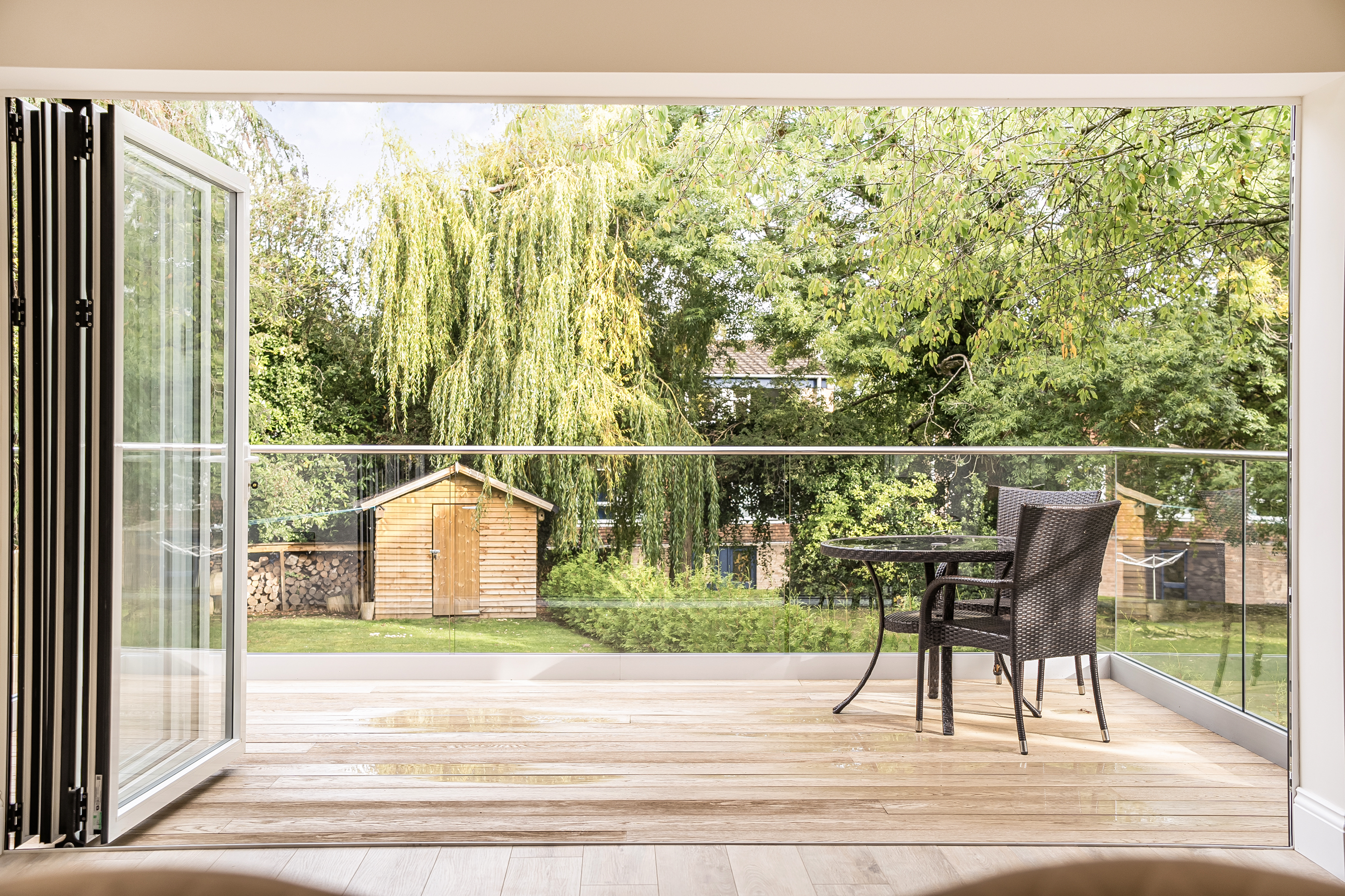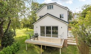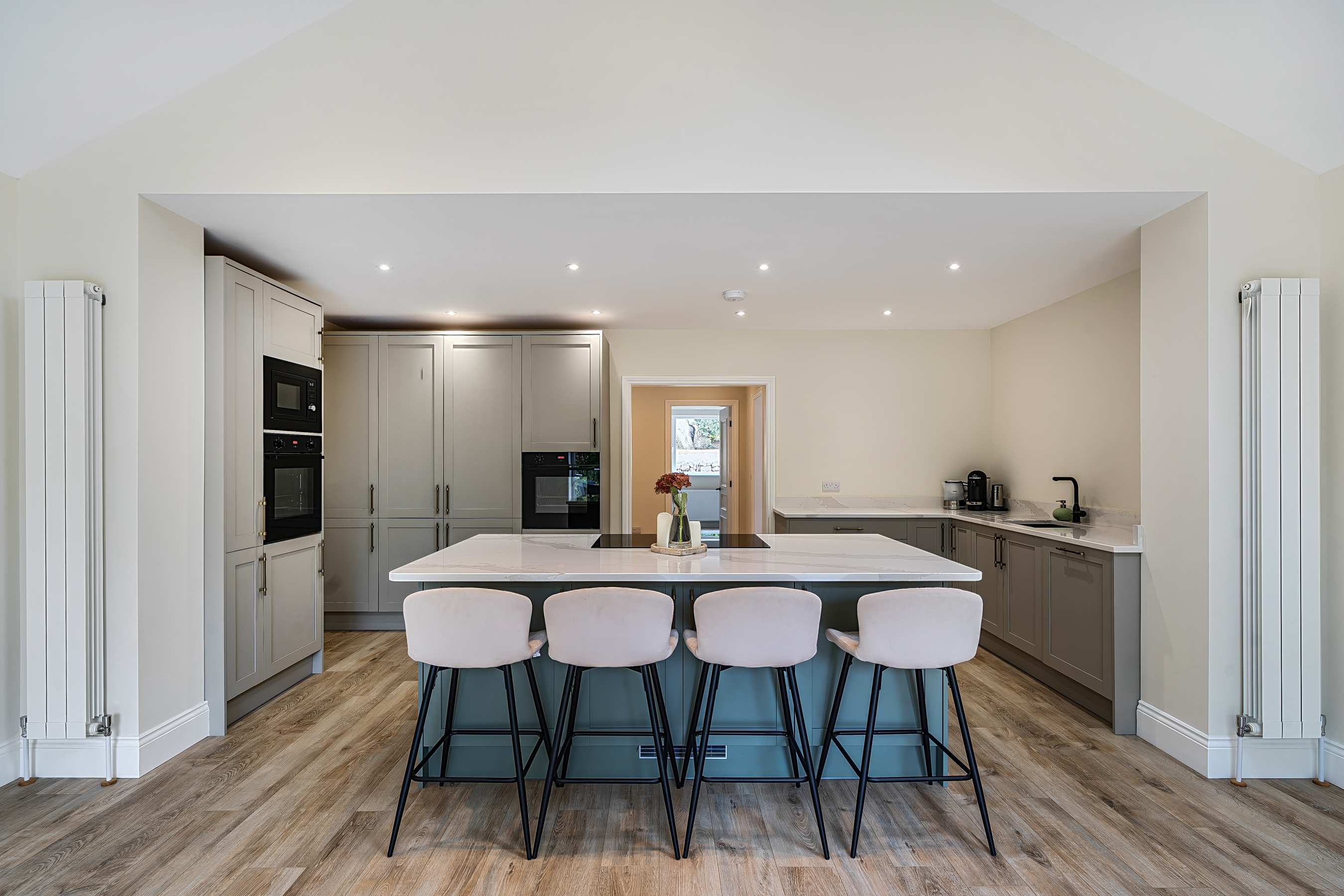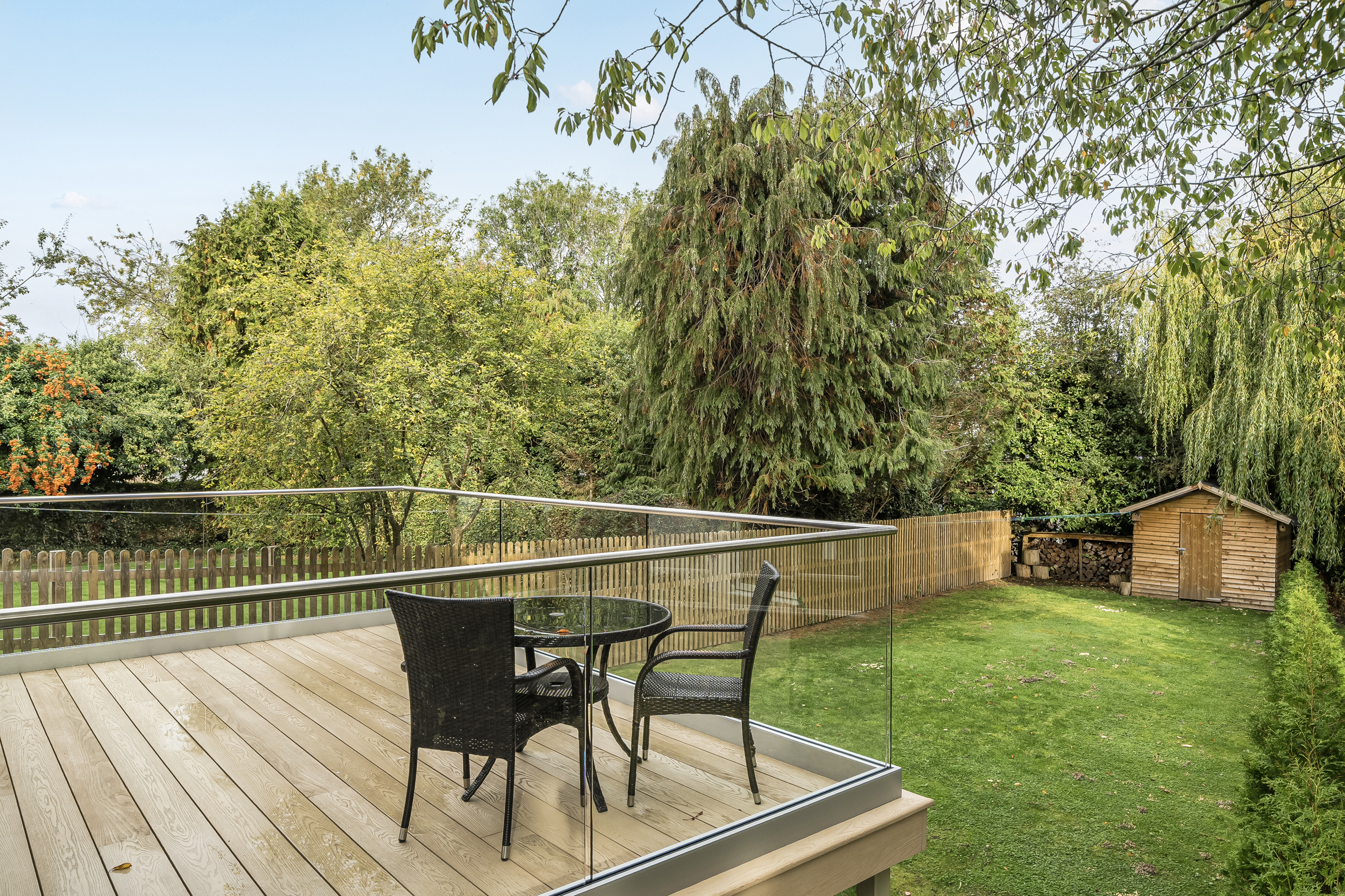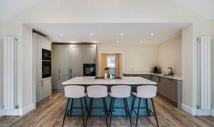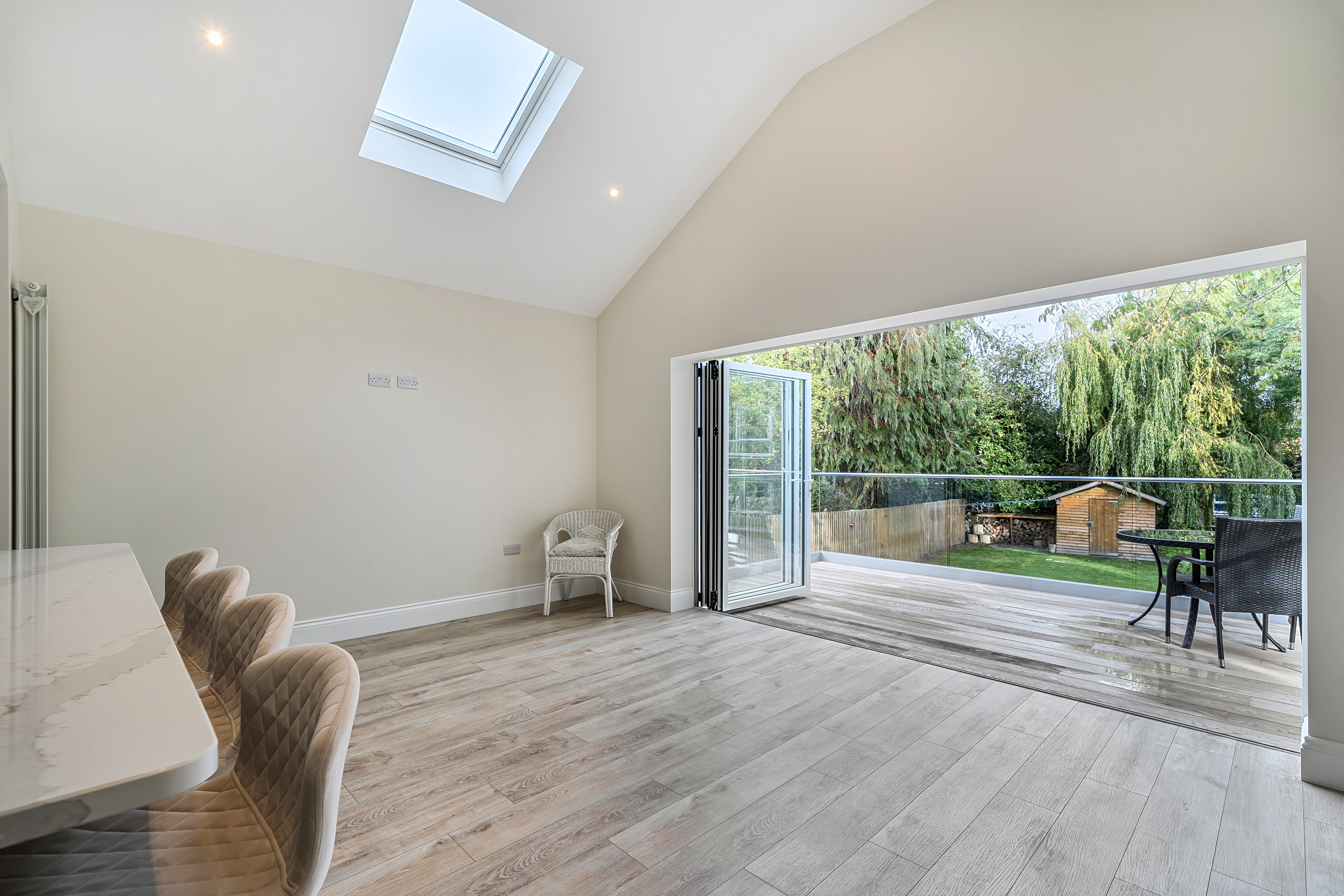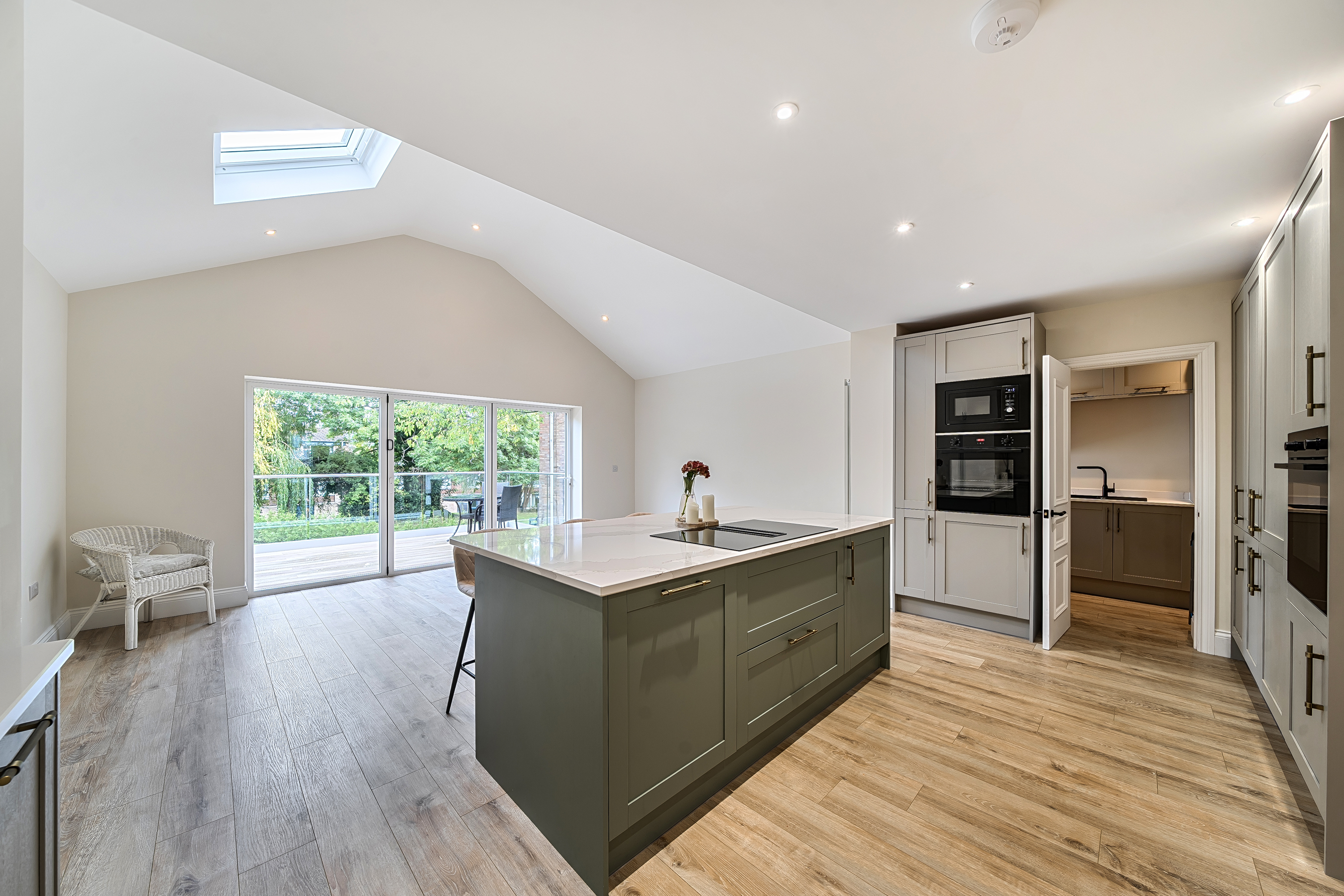 The heart of the home is the impressive open-plan kitchen, dining, and living area. Finished with wood-effect flooring and vaulted ceilings, the space is filled with natural light from large skylights and bi-fold doors which open onto a raised decked terrace overlooking the garden. The contemporary kitchen features a central island with quartz worktops, integrated appliances, and bespoke cabinetry in a muted palette, complemented by a separate utility room.