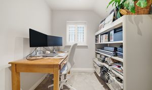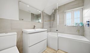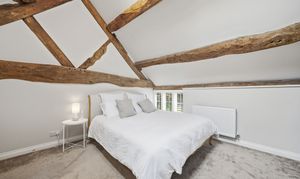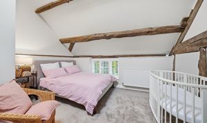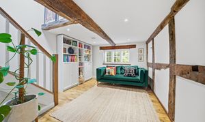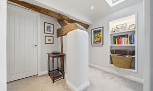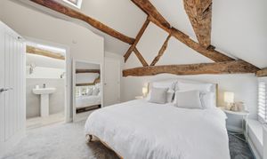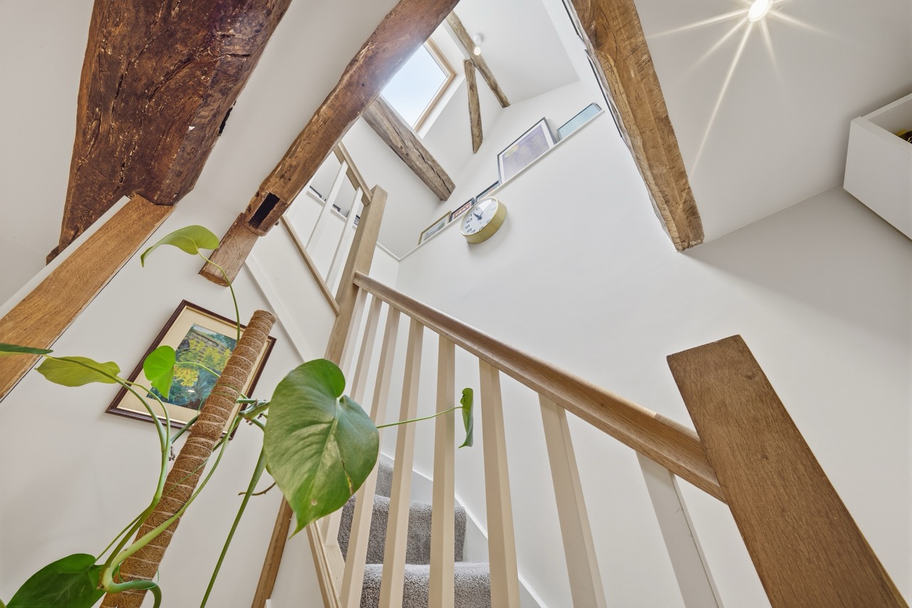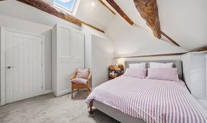 Upstairs, there are three double bedrooms and two beautifully finished bathrooms. The two larger bedrooms benefit from striking pitched ceilings with exposed beams, enhancing the light and spacious feel. The principal bedroom includes an en-suite shower room, while the family bathroom has been stylishly modernised to a high standard.