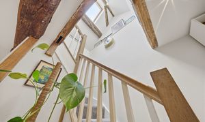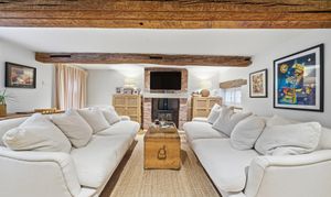 - Character Features: Exposed beams, open-plan layout, and brick fireplace with a wood-burning stove.