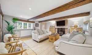 The ground floor features two principal reception rooms. The kitchen is bright and airy, enjoying wonderful countryside views, ample space for a dining table and chairs, and has been fitted with a range of wall and base units, an oven, electric hob and dishwasher. The open-plan living and family rooms have been cleverly divided to create a charming and characterful feature, complementing the cottage’s original wooden beams. The living room is centred around a brick fireplace with a wood-burning stove.