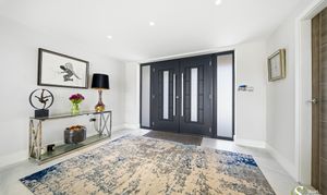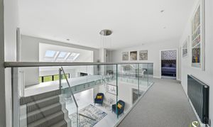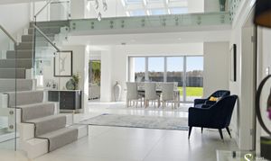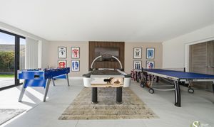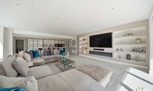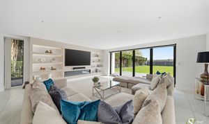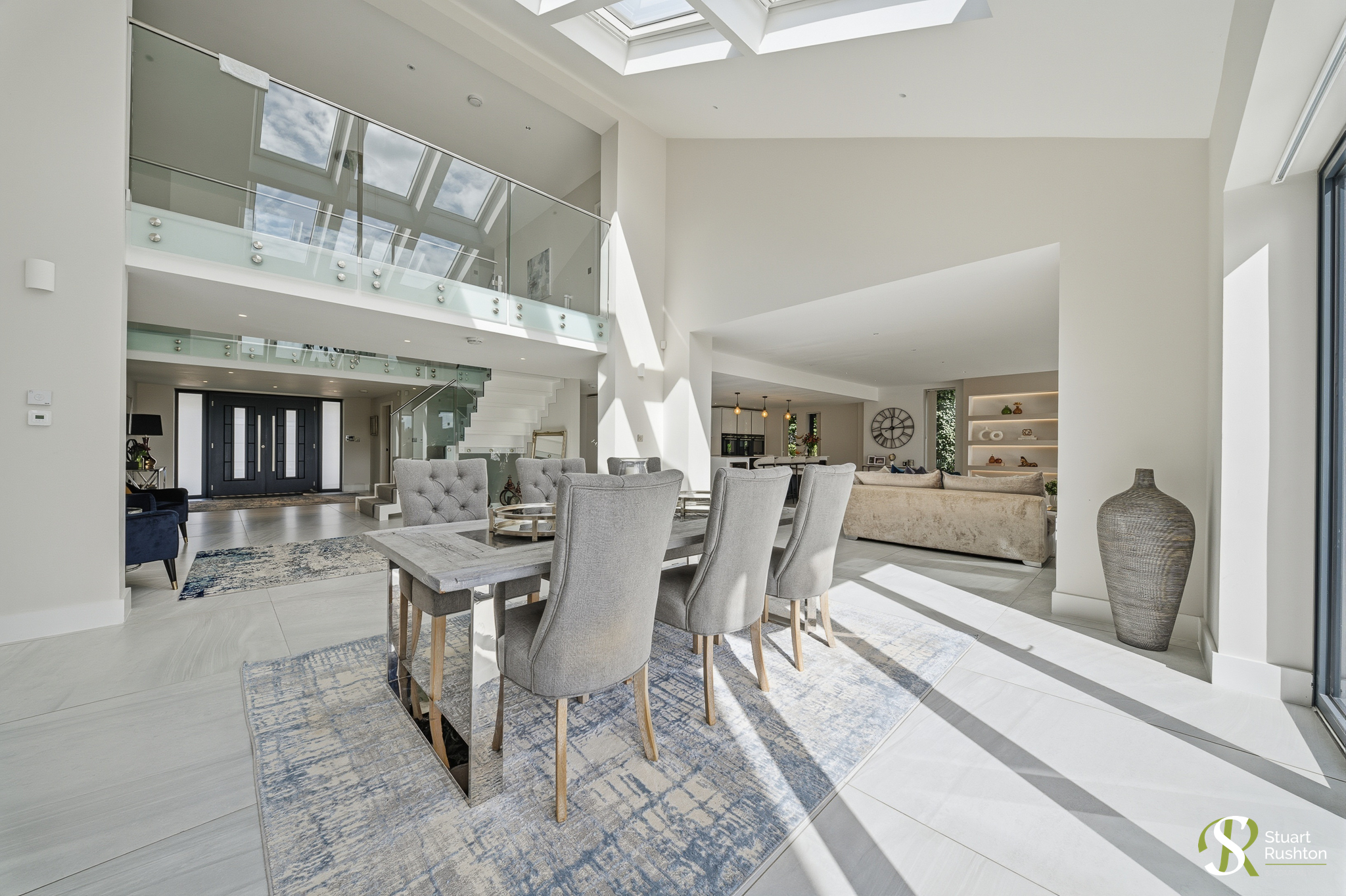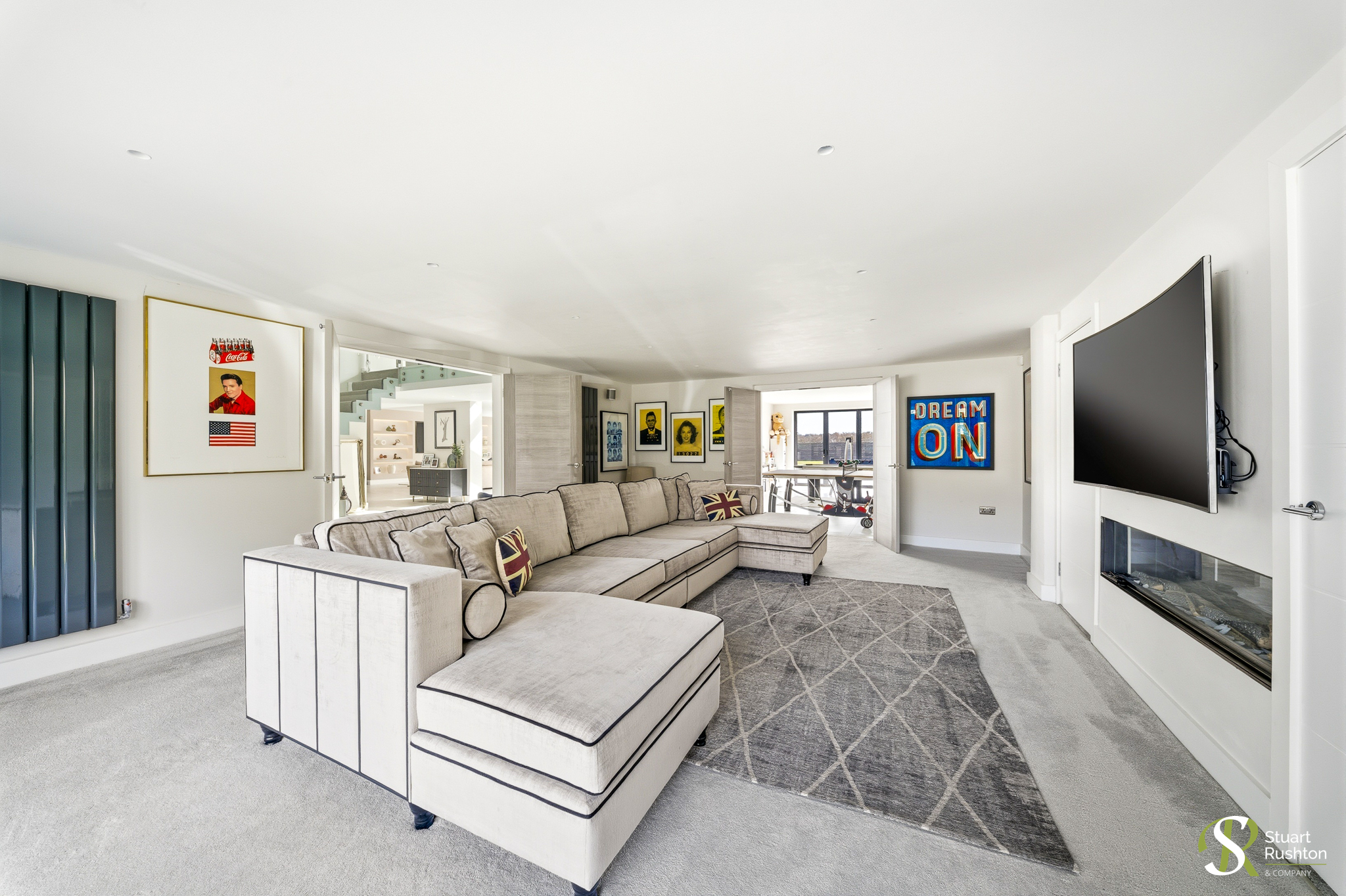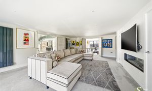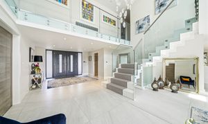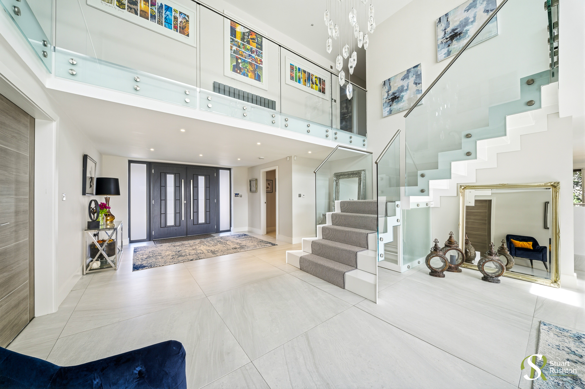 The layout flows fantastically well from a very impressive double height reception hall, which boasts a stunning bespoke staircase. It has a very open feel with rooms of superb proportions, most enjoying a very bright and sunny south facing aspect over the terrace and lawned gardens to the rear. There are distinct reception areas, including a large central dining hall, huge kitchen and family room with media wall, impressive games room and a separate main lounge/sitting room to the front. There is also a glass fronted gym.