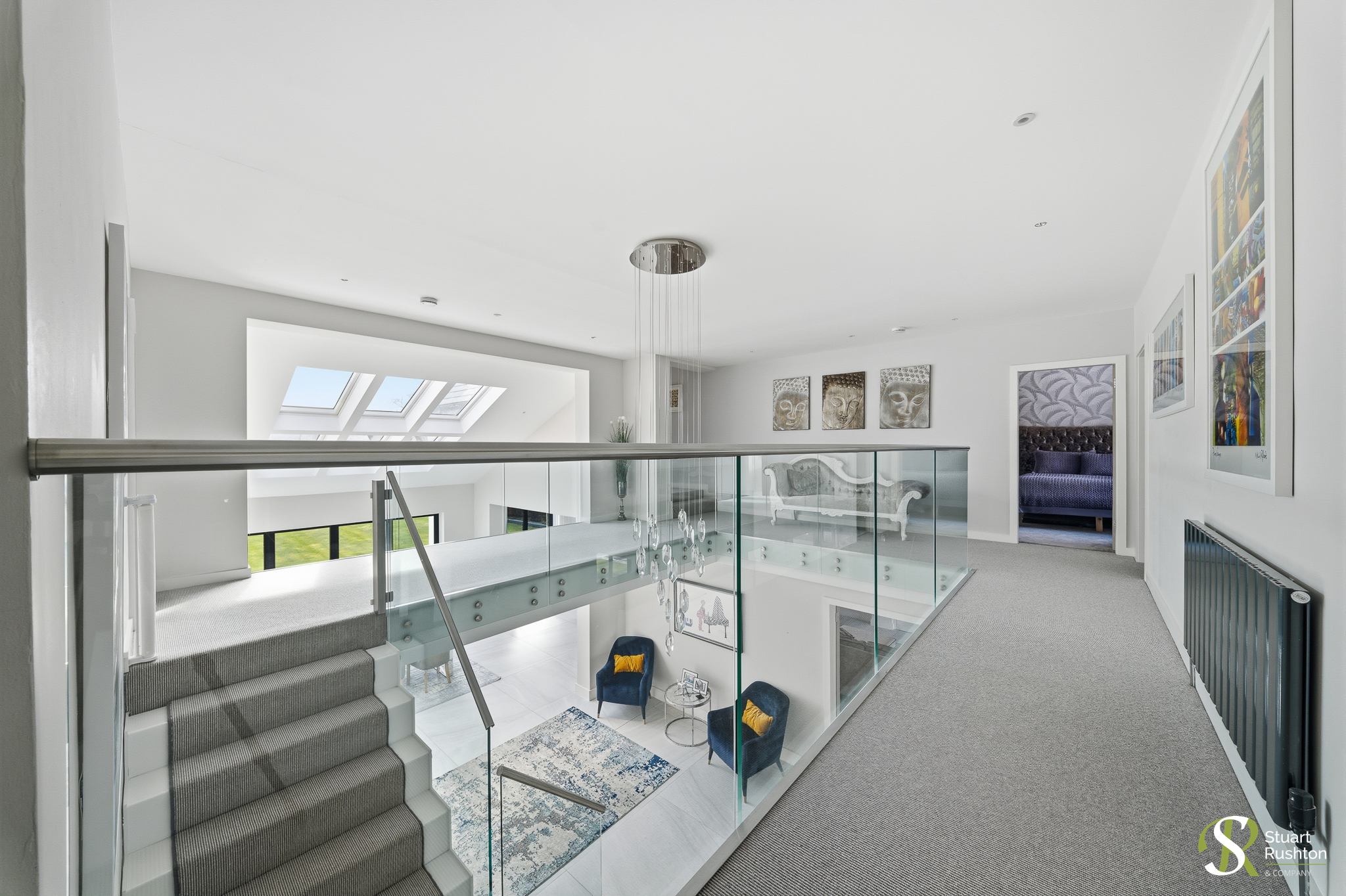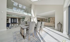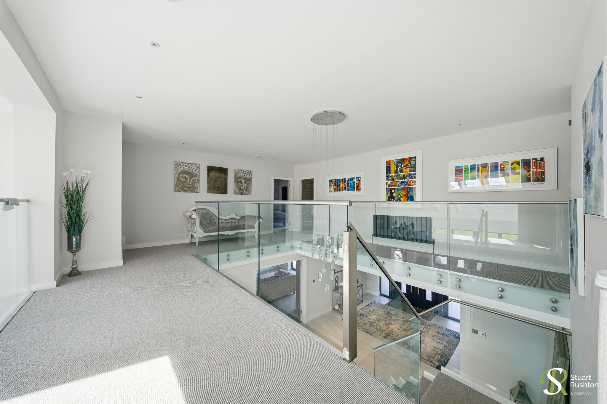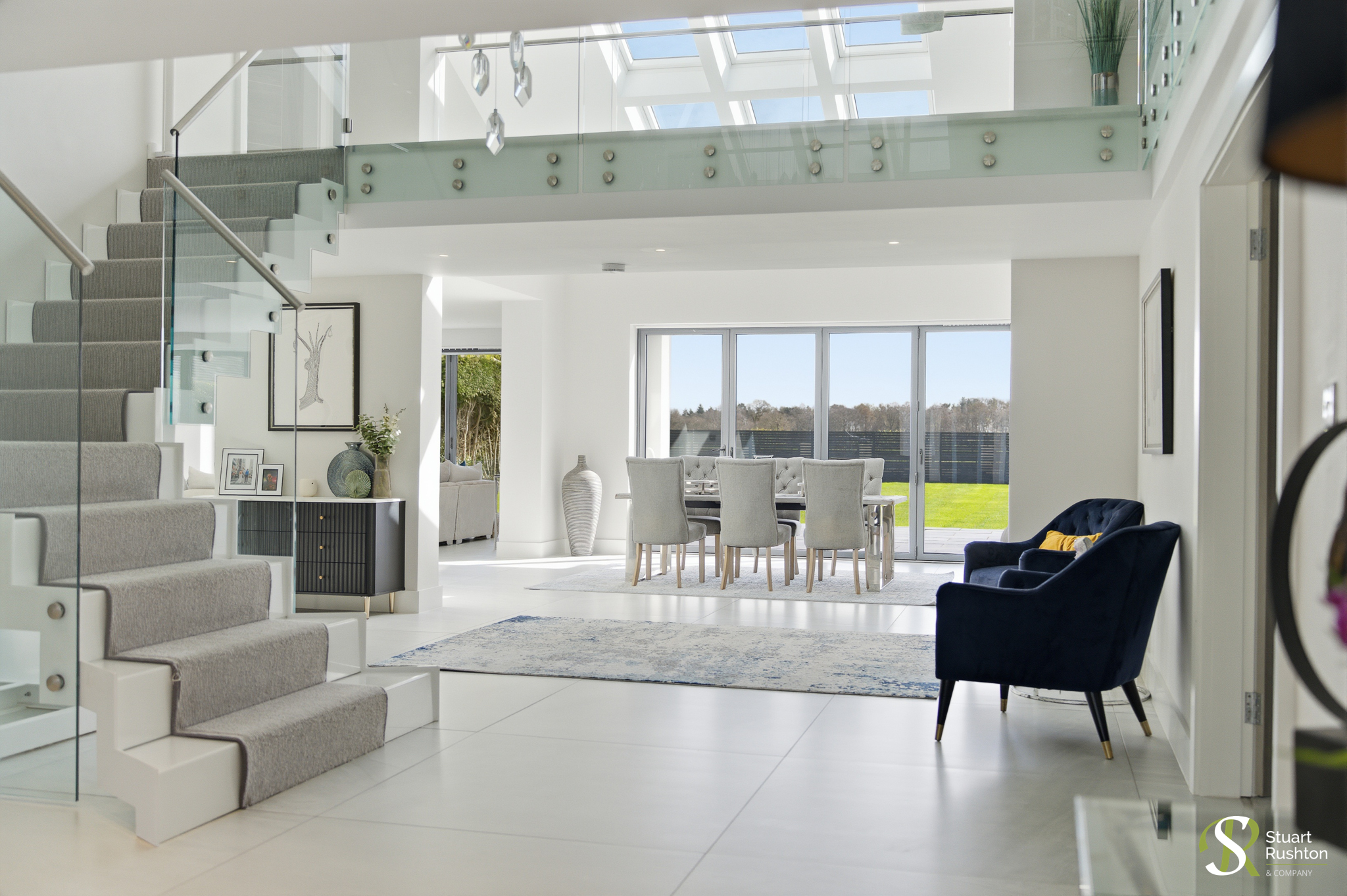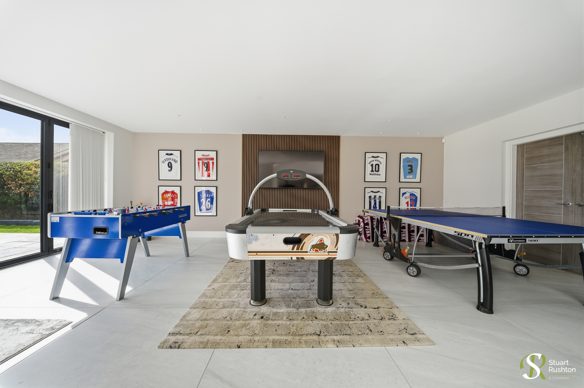 The layout flows fantastically well from a very impressive double height reception hall, which boasts a stunning bespoke staircase. It has a very open feel with rooms of superb proportions, most enjoying a very bright and sunny south facing aspect over the terrace and lawned gardens to the rear. There are distinct reception areas, including a large central dining hall, huge kitchen and family room with media wall, impressive games room and a separate main lounge/sitting room to the front. There is also a glass fronted gym.
