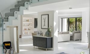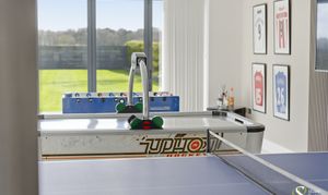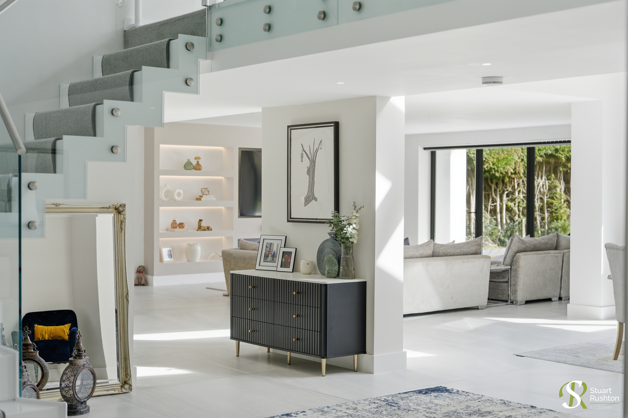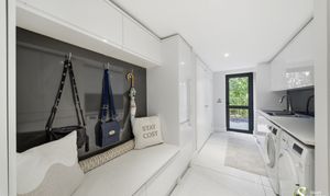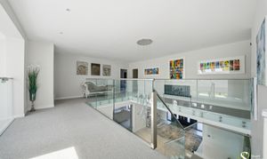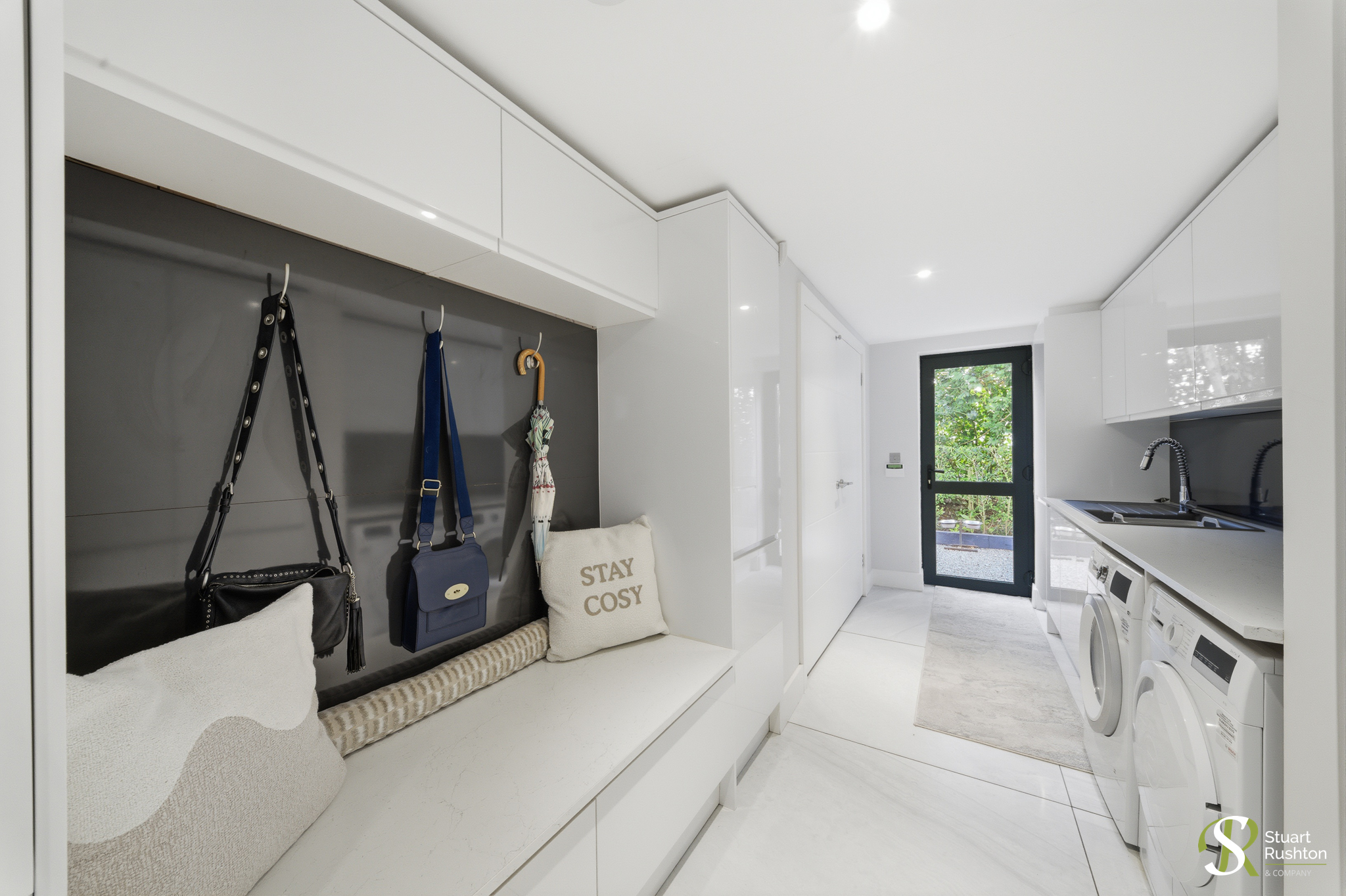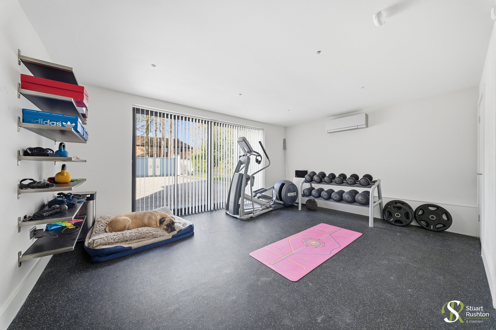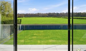 The layout flows fantastically well from a very impressive double height reception hall, which boasts a stunning bespoke staircase. It has a very open feel with rooms of superb proportions, most enjoying a very bright and sunny south facing aspect over the terrace and lawned gardens to the rear. There are distinct reception areas, including a large central dining hall, huge kitchen and family room with media wall, impressive games room and a separate main lounge/sitting room to the front. There is also a glass fronted gym.