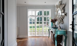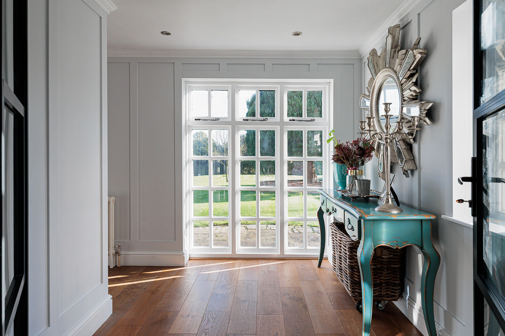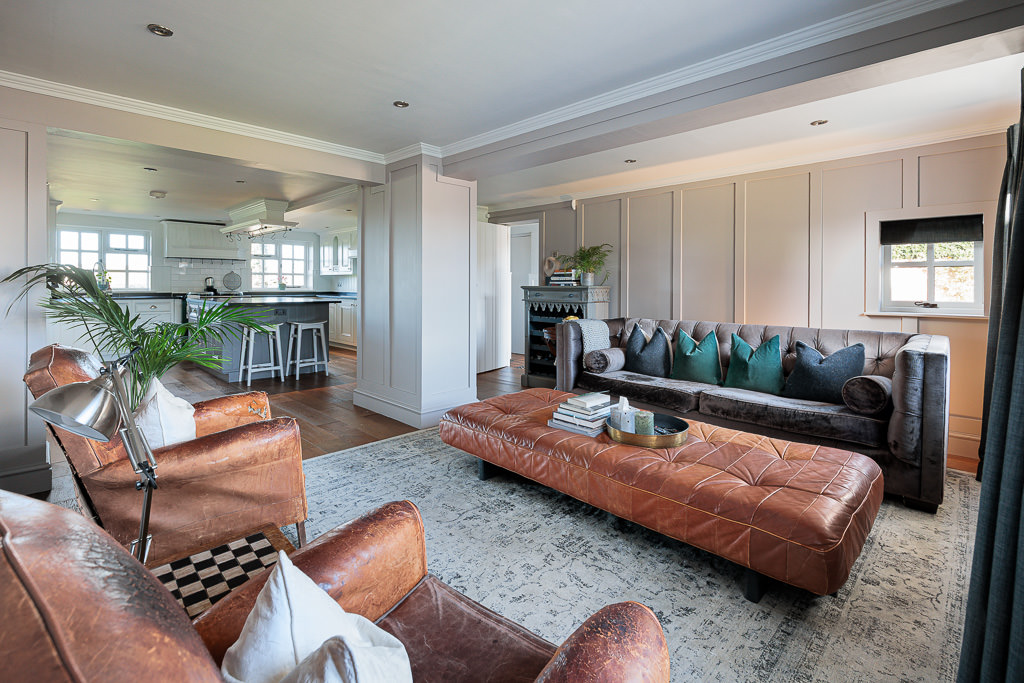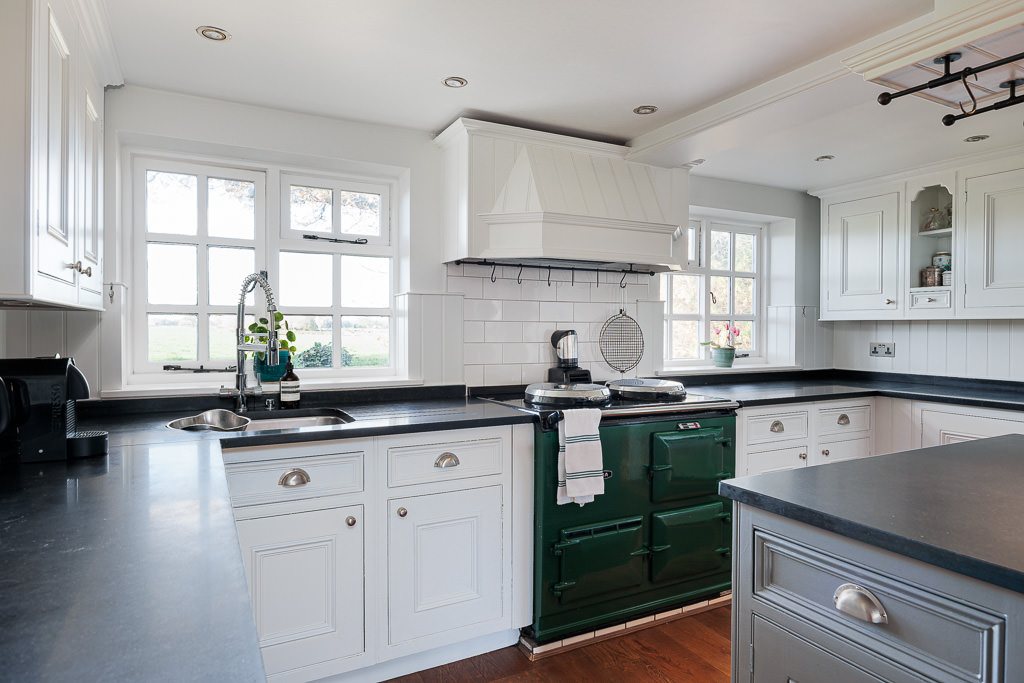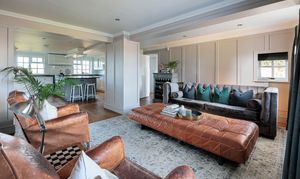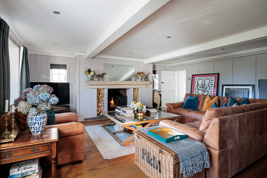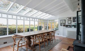 An entrance hall provides access to the reception rooms, including a living room with open fireplace, a glazed dining room overlooking fields to the rear, a conservatory, and a separate study currently used as a fifth bedroom. The open-plan kitchen, dining and living space includes an AGA, integrated Miele and Bosch appliances, a snug area, and a separate utility room. A side entrance leads into a boot room, and the former double garage has been converted into a home gym.
