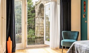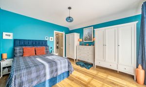 Upstairs, the standout feature is a spacious double bedroom with en-suite shower room featuring underfloor heating and private balcony, perfectly positioned to take in breathtaking views of the River Nidd and the iconic Knaresborough Viaduct. Two further bedrooms—one benefitting from extensive fitted storage—offer versatile options as guest rooms, home offices, or playrooms. A well-appointed family bathroom with an over-bath shower completes the first floor.
