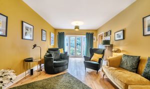 The property is approached via a private, low-maintenance front garden with gated access. Inside, the ground floor features a stylish open-plan kitchen and dining area with ample fitted storage and workspace, complemented by double doors leading to the outdoors. From the hallway, you’ll also find a modern WC and a beautifully presented reception room, complete with further double-door access to the garden.