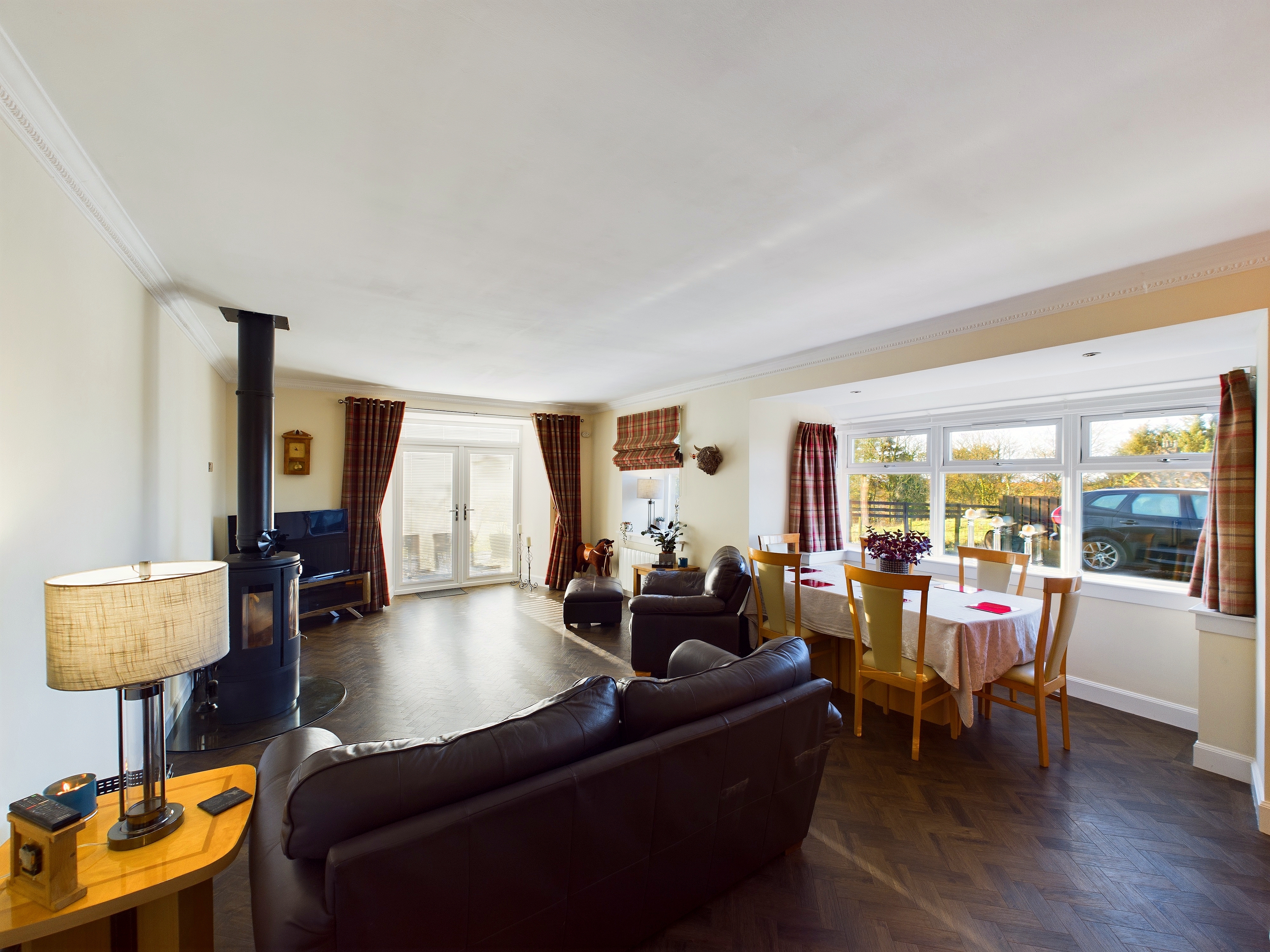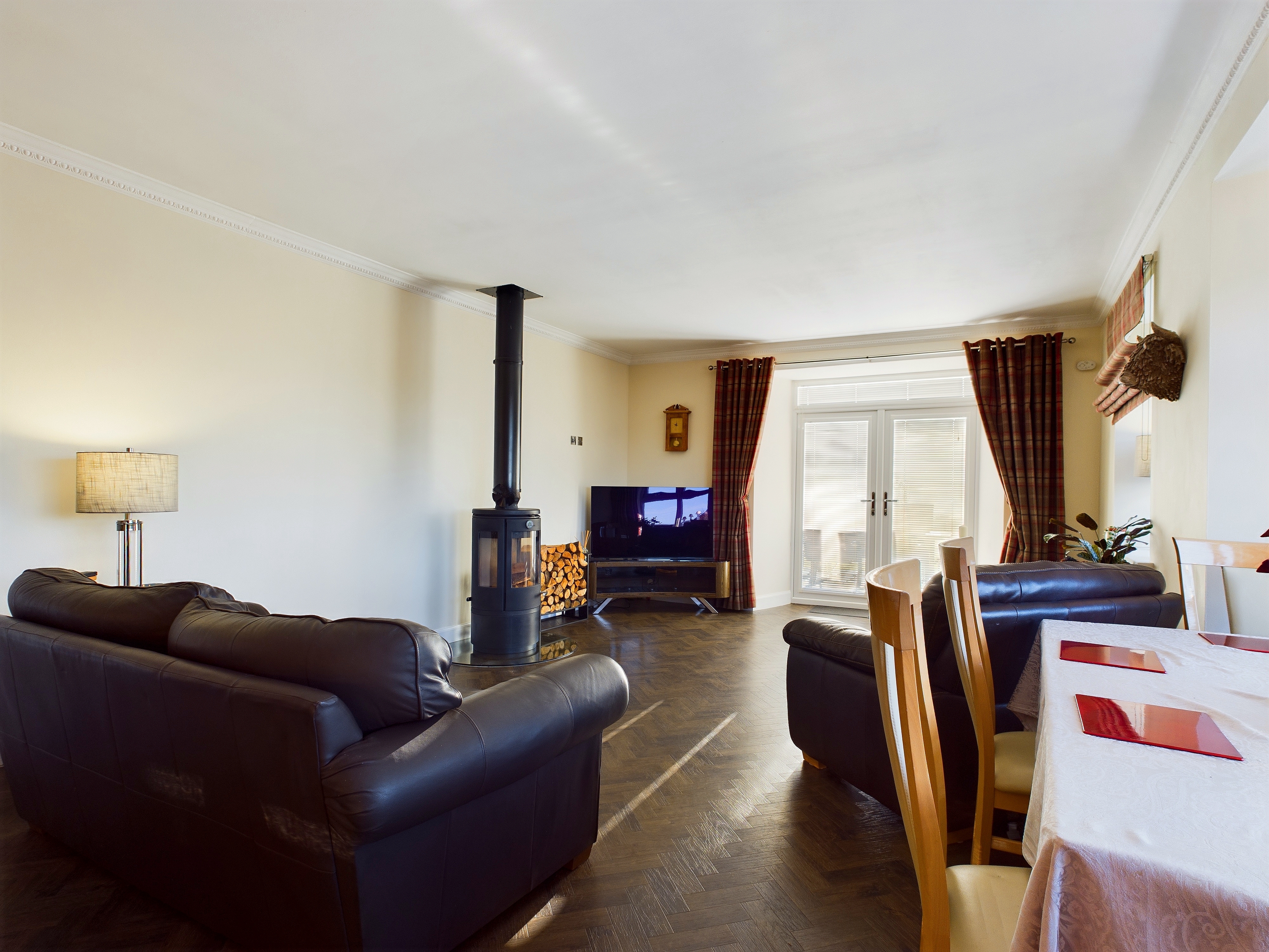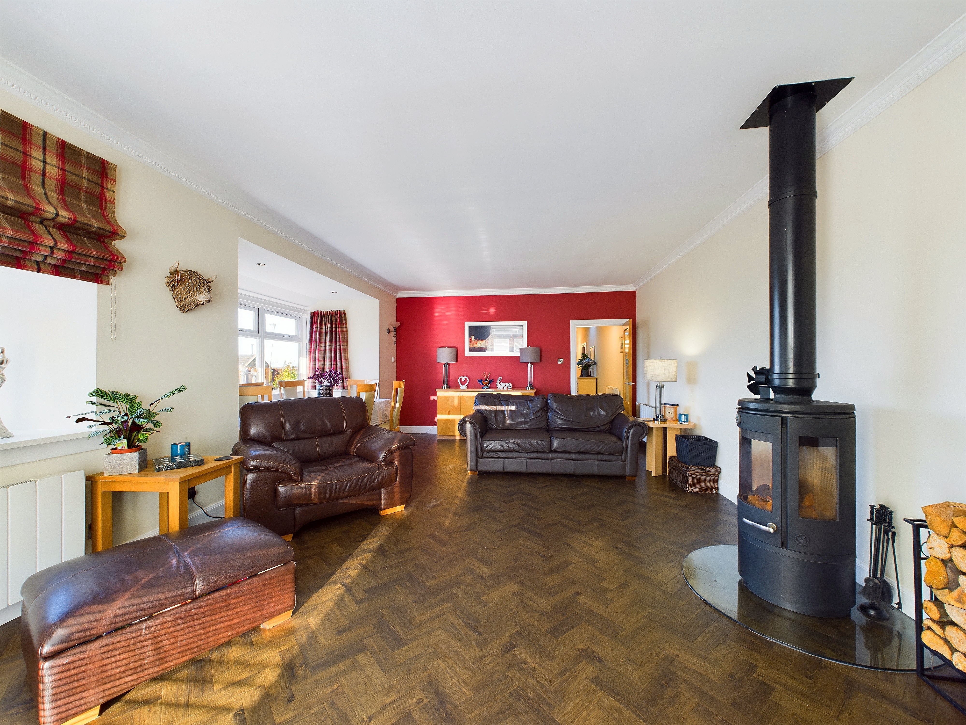 The property is entered from the front, through an entrance vestibule with storage into a spacious hallway which gives access to the homes principal accommodation. This area, along with the main lounge has been laid with beautiful Herring bone style Amtico flooring. The main lounge is the hub of the home with an open plan dining area and a log burning stove which adds to the country charm of the property. A double window formation to the front and French doors to the side provide the room with excellent natural light and give access from here to the patio. The kitchen is modern and stylish with a good range of base and wall mounted storage with a wide selection of integrated appliances, induction hob and butcher block worksurfaces. The bathroom is again modern in style with a white suite comprising; W.C, wash hand basin and bath with electric shower over. The internal accommodation is completed by four double bedrooms with the master bedroom benefiting from an en-suite shower room.