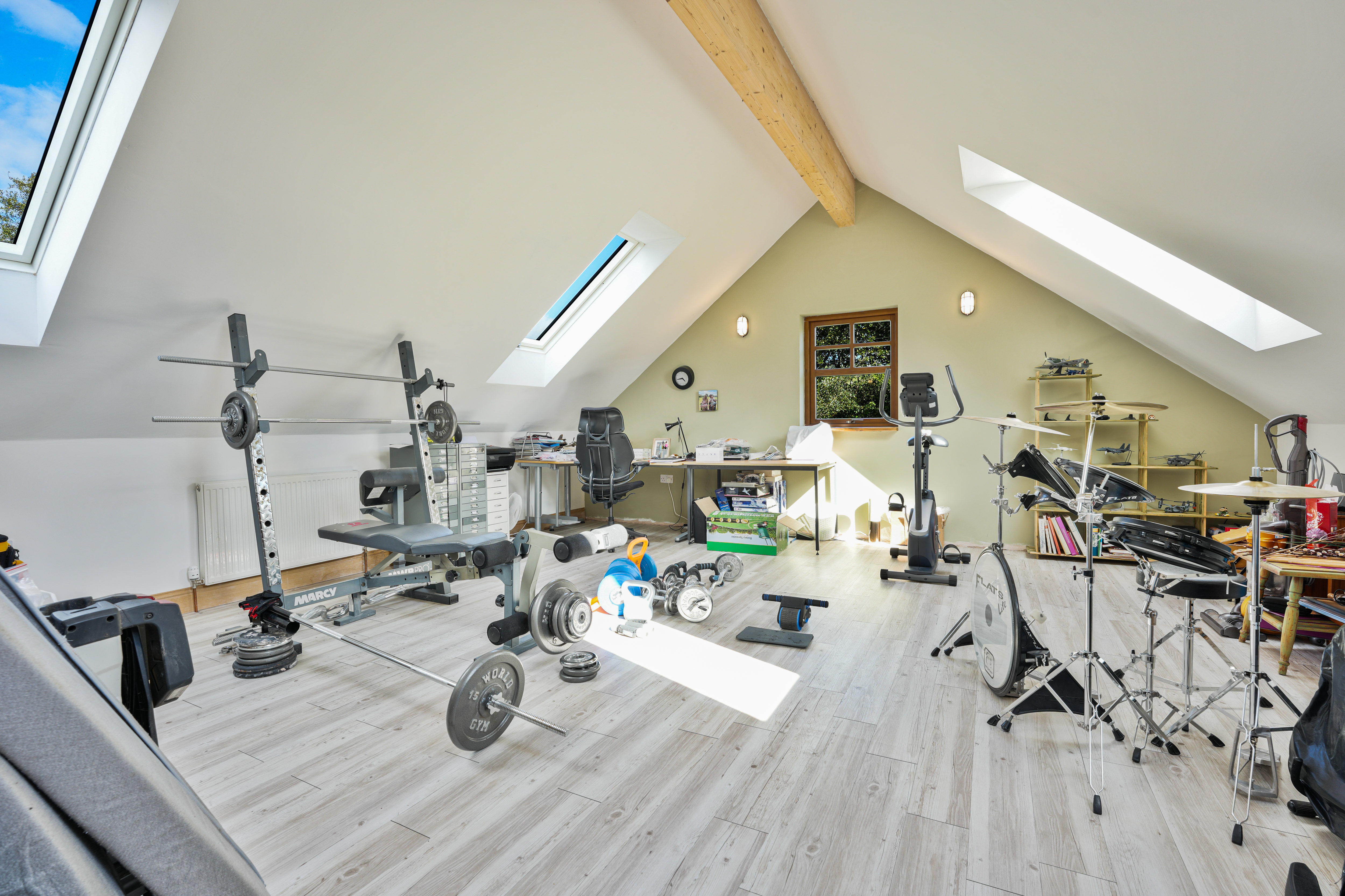 Above the garage, a superb light-filled studio space, ideal as a home office, gym, or creative studio.