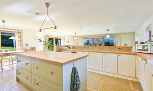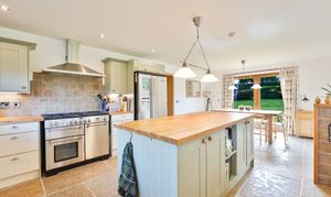Beautifully designed kitchen with solid oak worksurfaces, central island, integrated dishwasher and wine cooler, and a range cooker and American-style fridge freezer.